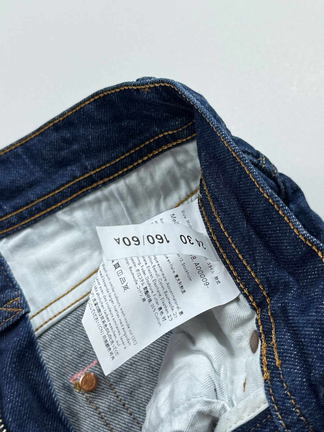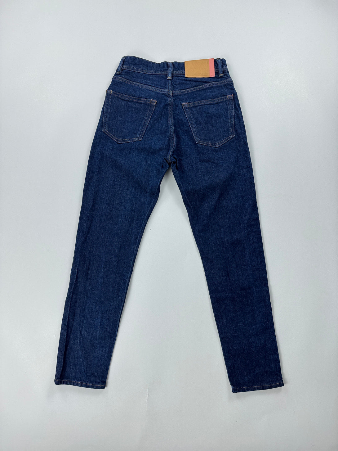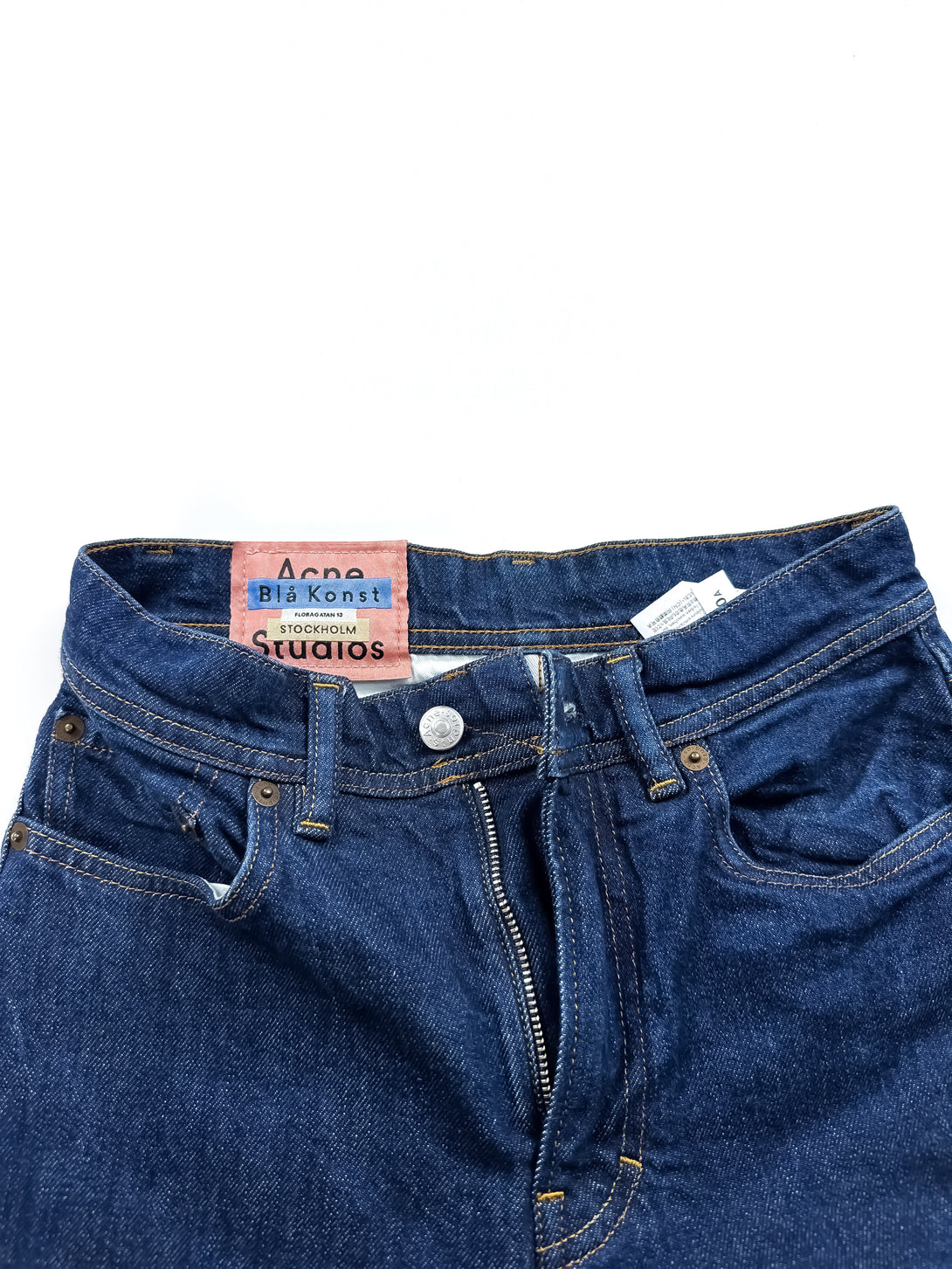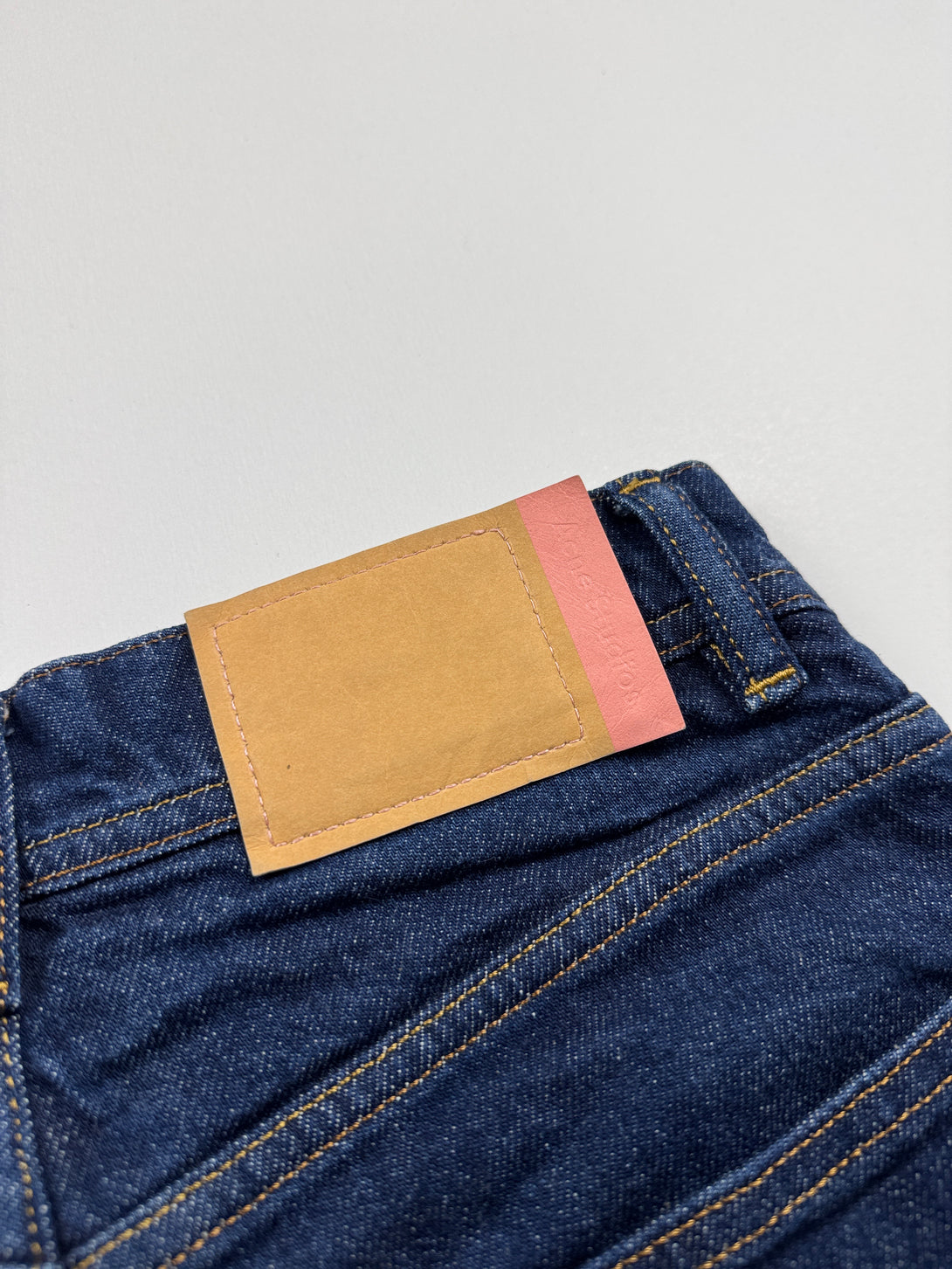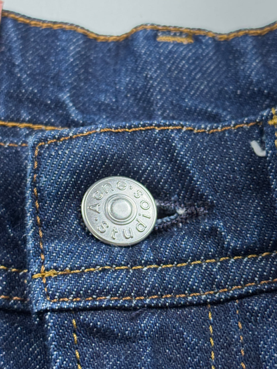 Acești blugi sunt o pereche de blugi din denim Acne Studios. Aceștia prezintă o croială skinny, cusături contrastante de culoare galbenă și o emblemă din piele pe spatele beteliei, care este o caracteristică definitorie a brandului.
