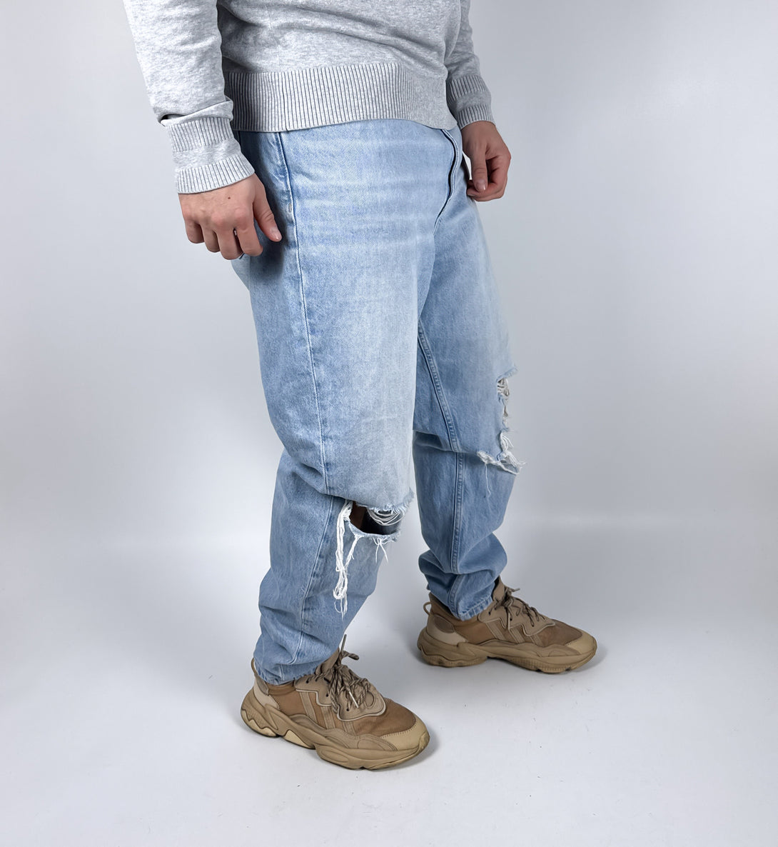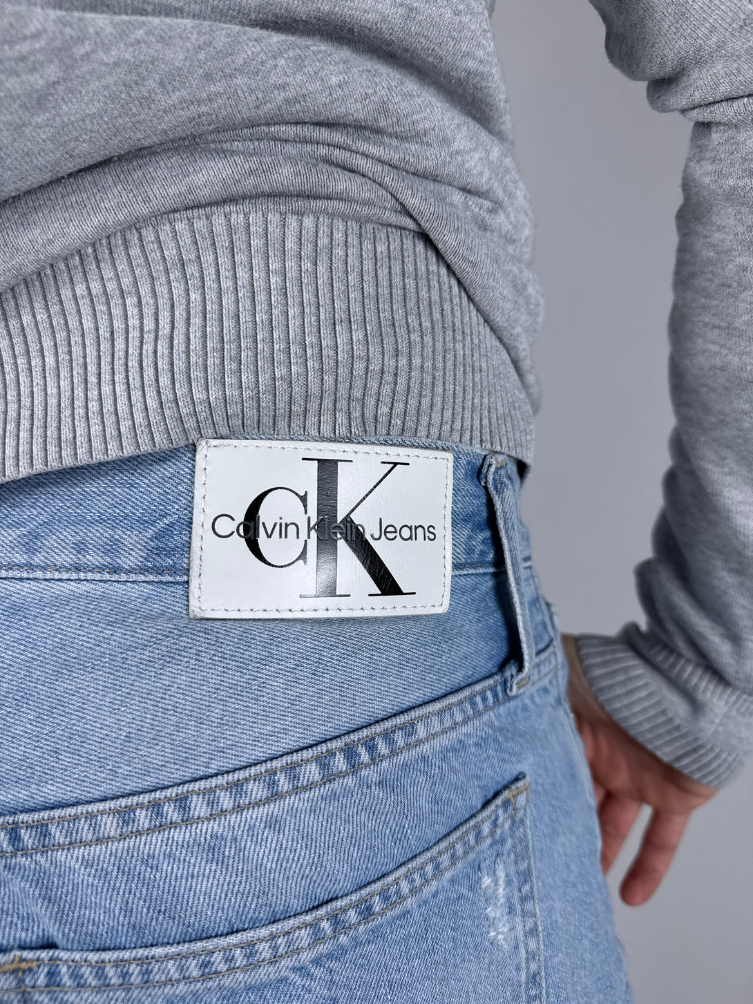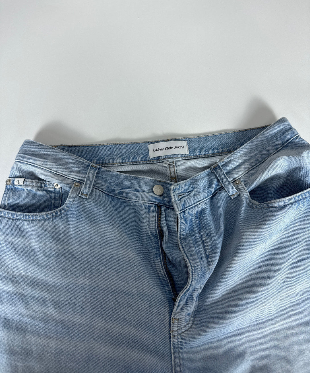 Blugi Calvin Klein din denim albastru deschis, cu o croială largă (baggy fit) efecte de distrugere la genunchii, petic cu logo pe partea din spate, mărimea M (lungimea 102cm, talie 42cm, șolduri 48cm, coapsă 28cm)