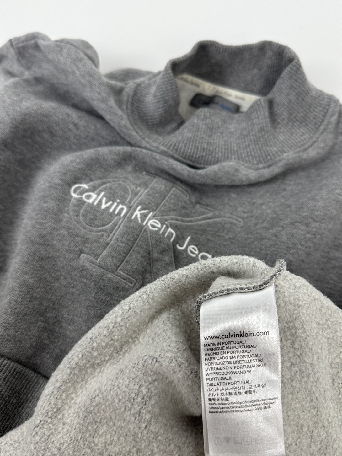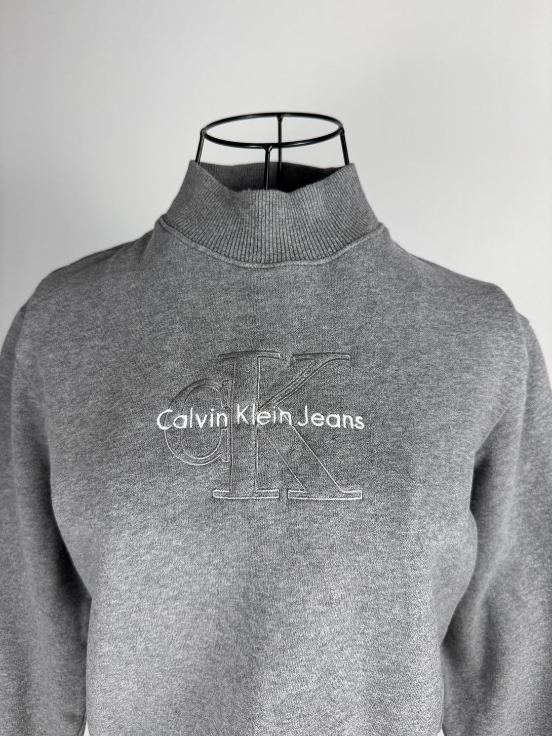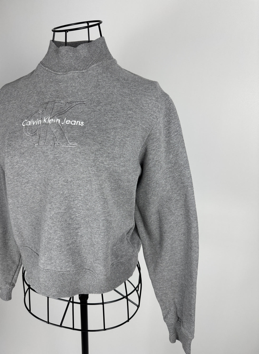 Acesta este un sweatshirt (bluză de molton) crop gri de la Calvin Klein Jeans, cu un guler ridicat și logo-ul mărcii imprimat sau embosat pe piept.