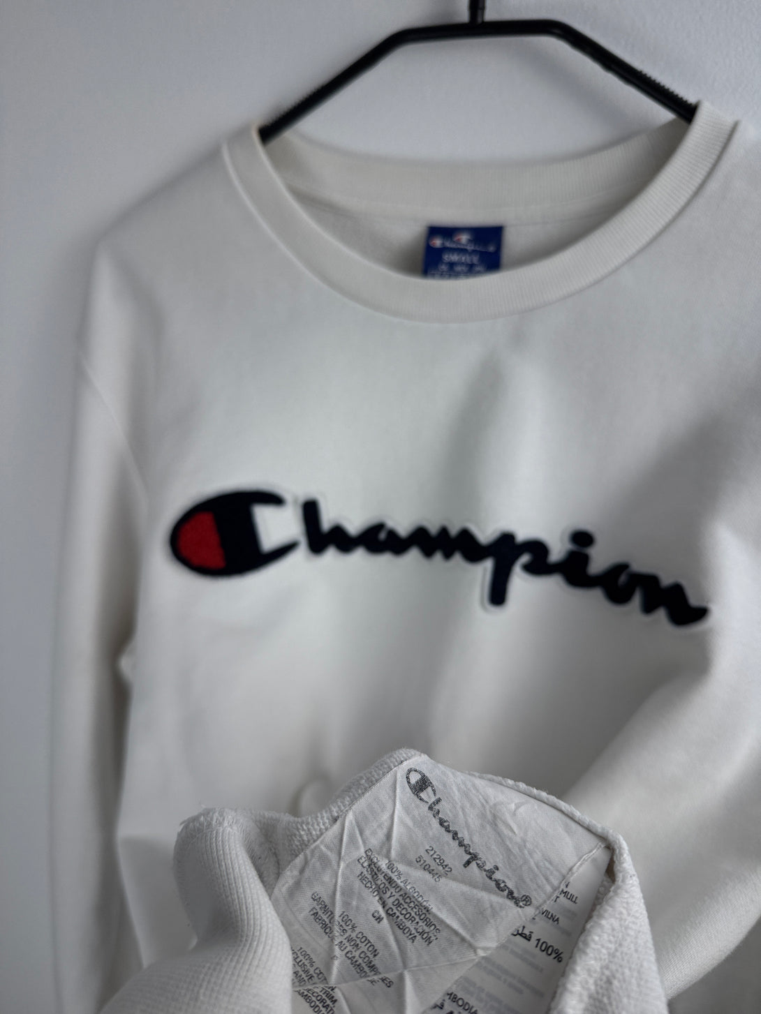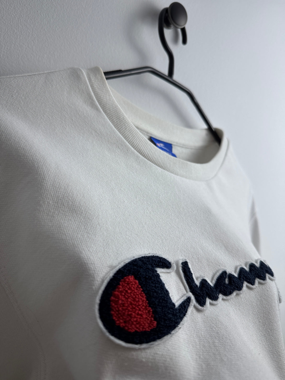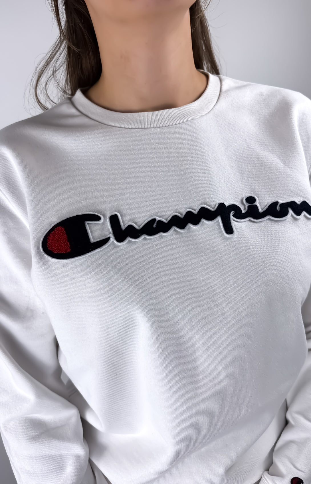 Aceasta este o bluză de trening Champion de culoare albă, cu logo brodat pufos în față.