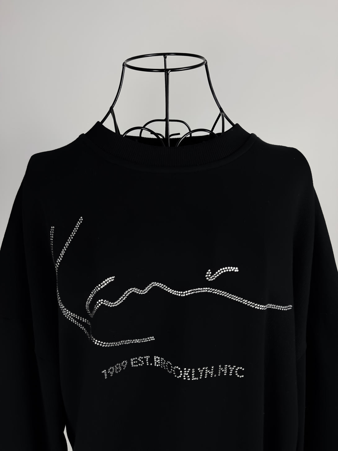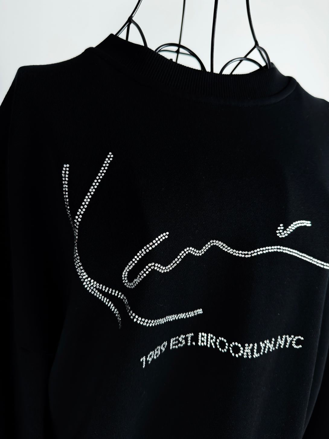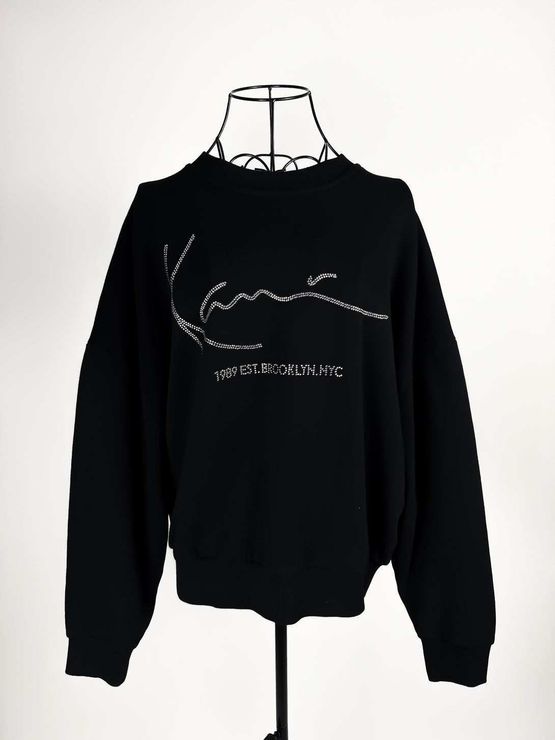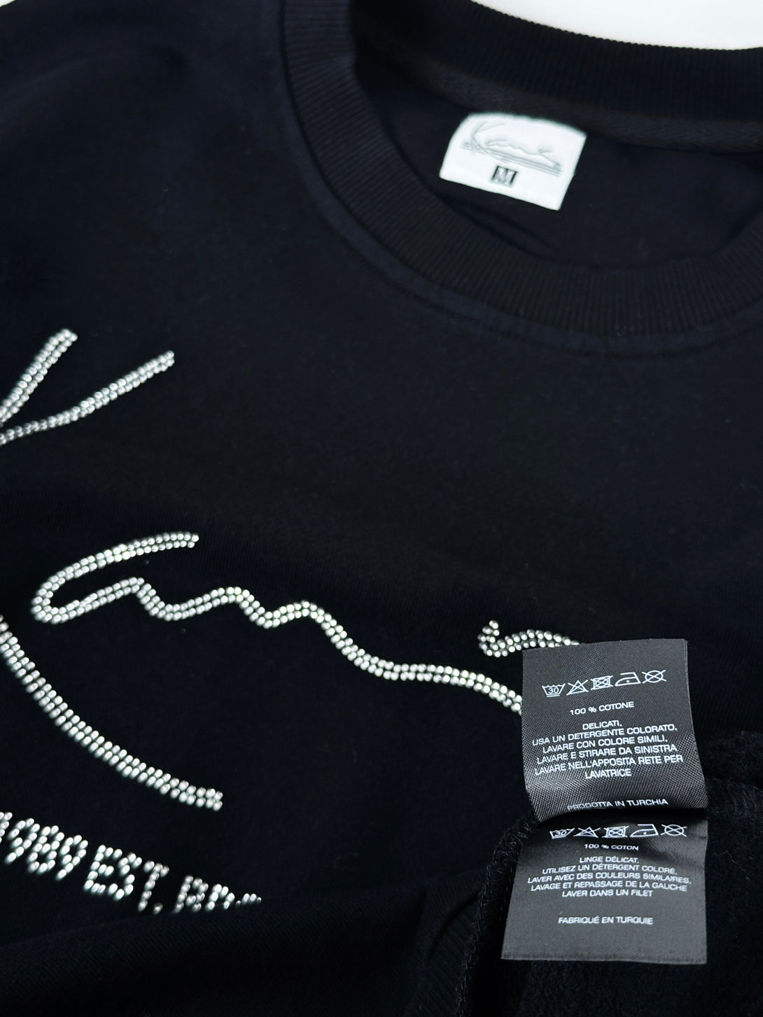 Aceasta este o bluză Karl Kani neagră, cu logo-ul-semnătură al brandului decorat cu strasuri. Inscripția de sub logo indică "1989 EST. BROOKLYN, NYC", referindu-se la anul și locul înființării brandului de streetwear.