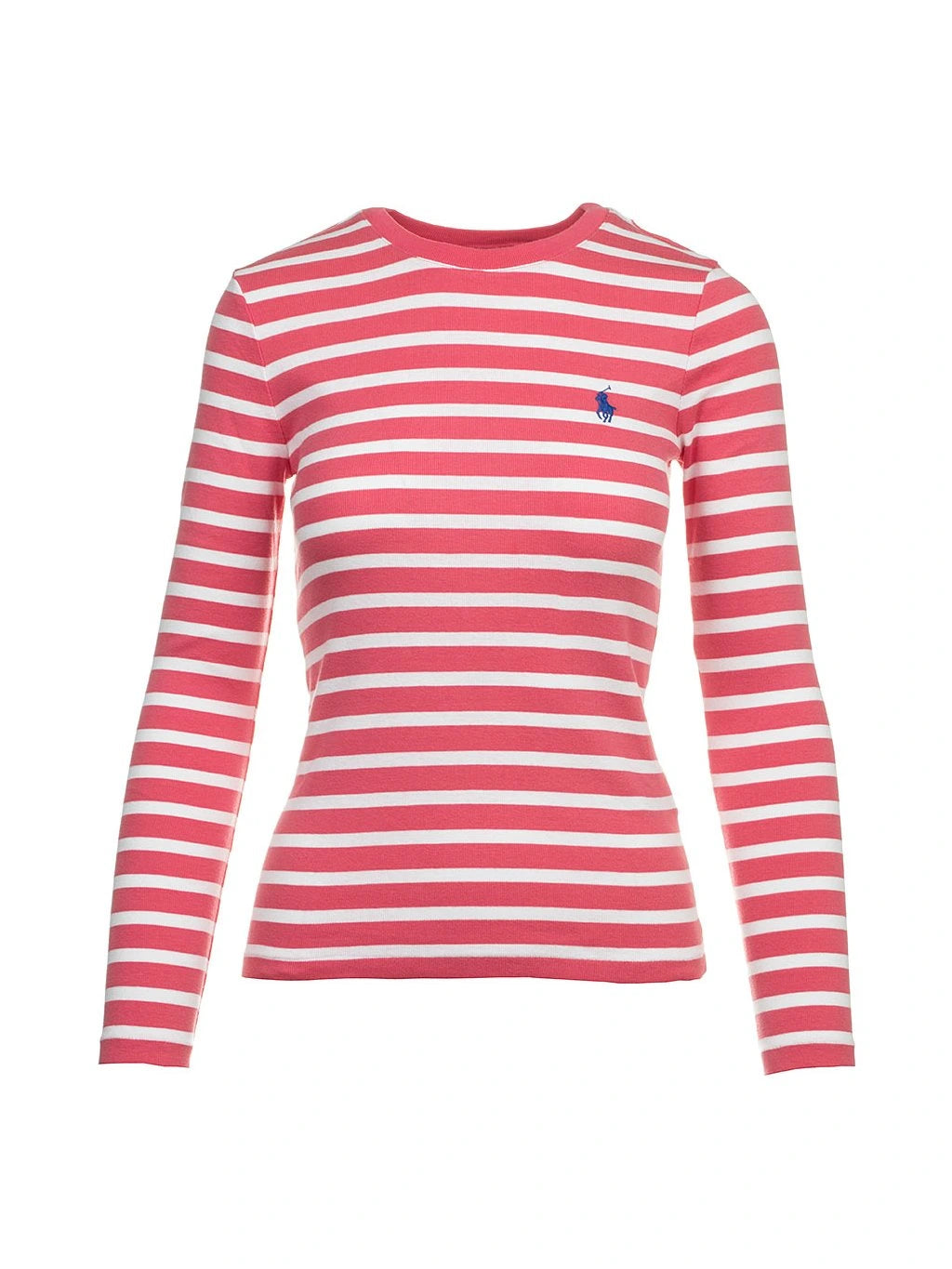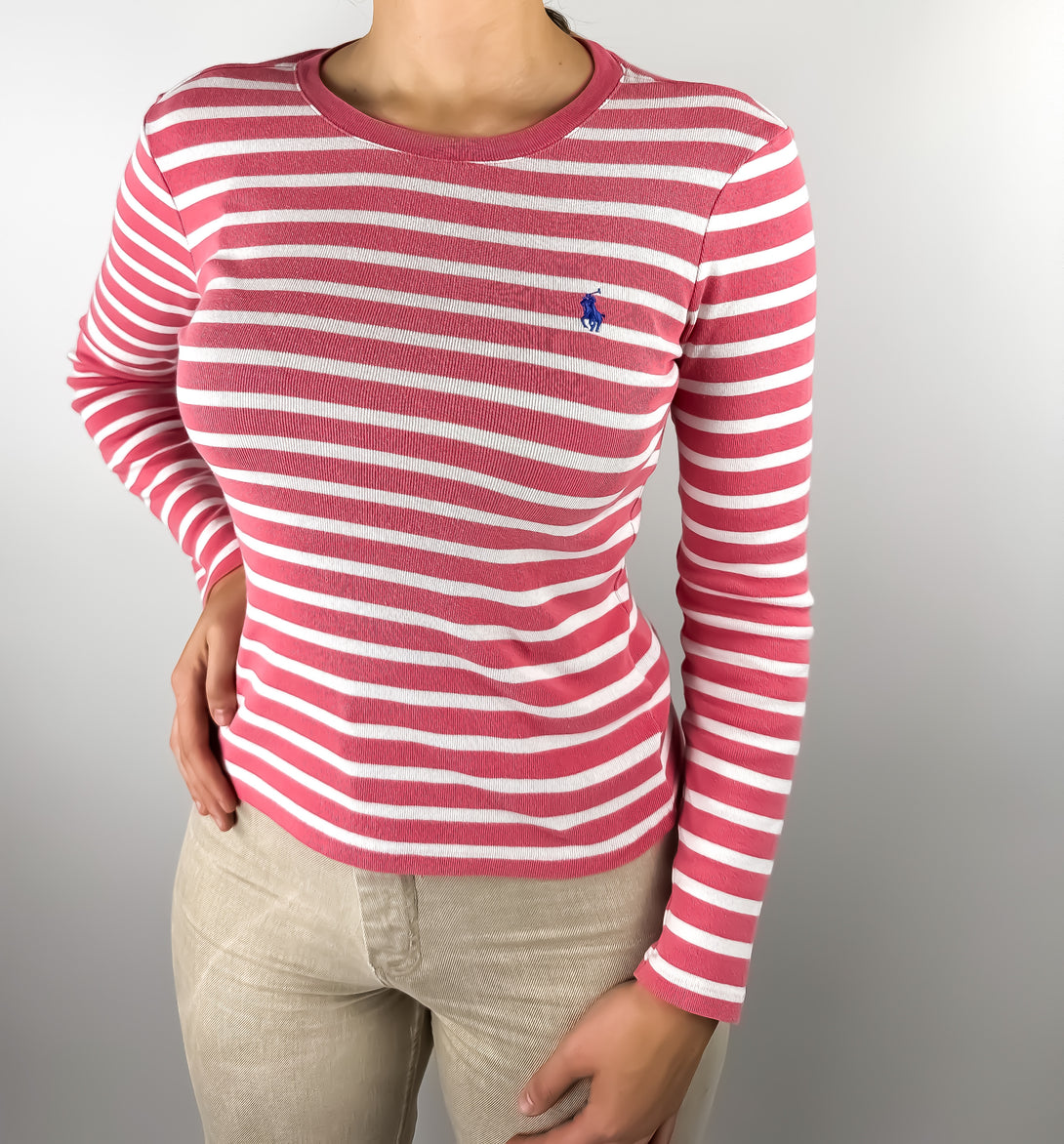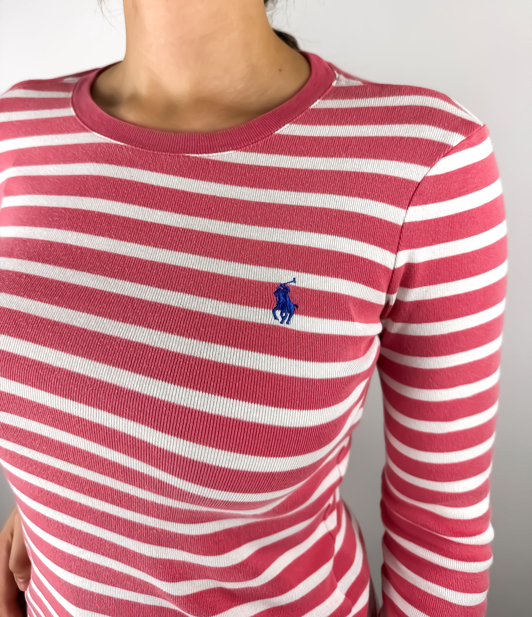 Aceasta este o bluză subțire Ralph Lauren cu mânecă lungă, cu dungi roz și albe.