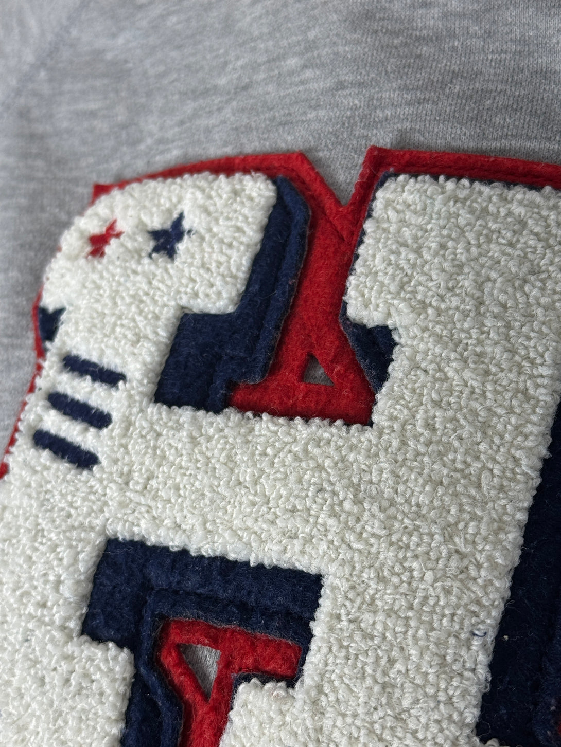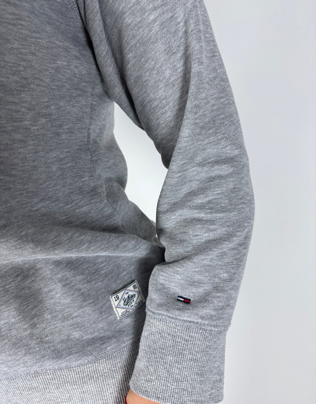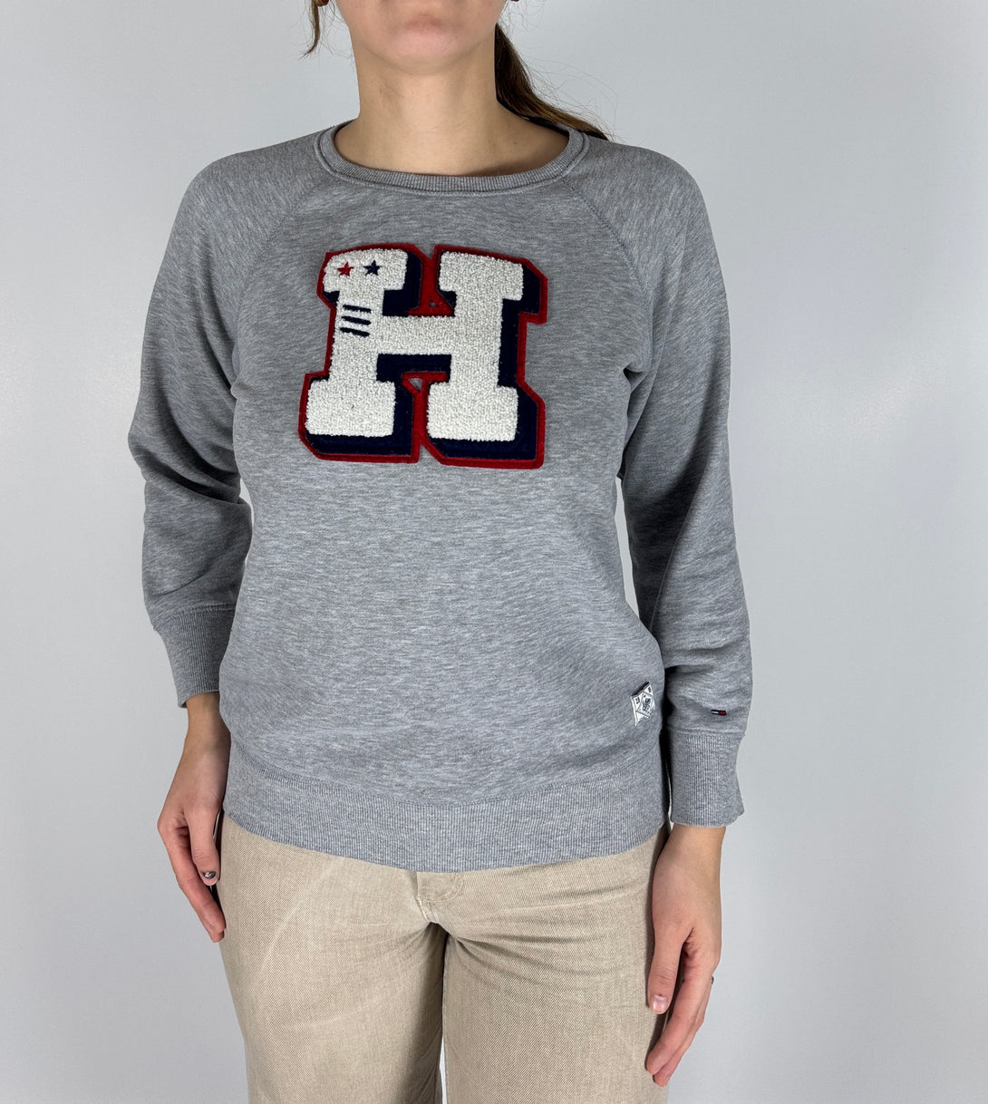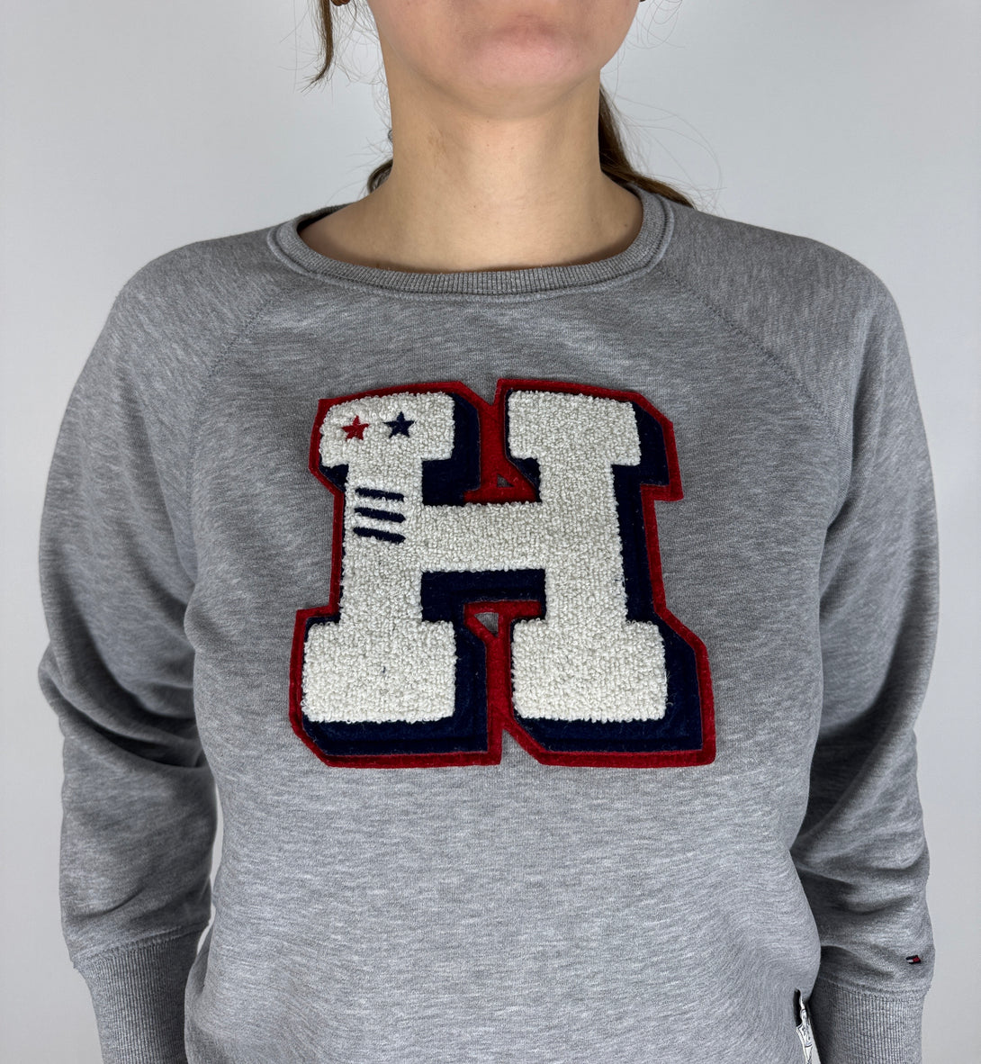 Bluză (sweatshirt) Tommy Hilfiger de culoare gri, cu un logo distinctiv mare, aplicat, în formă de "H" pe piept. Logo-ul prezintă culorile clasice ale mărcii (roșu, alb și bleumarin) și stele mici pe brațele superioare ale literei.
