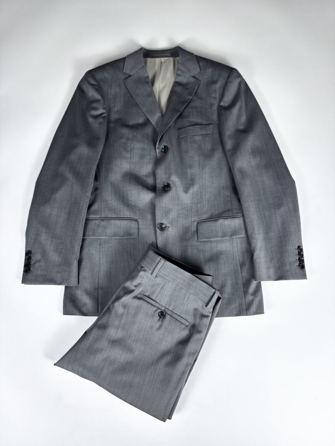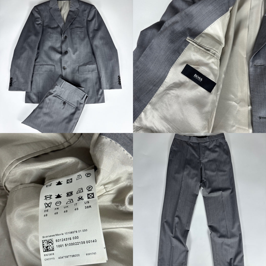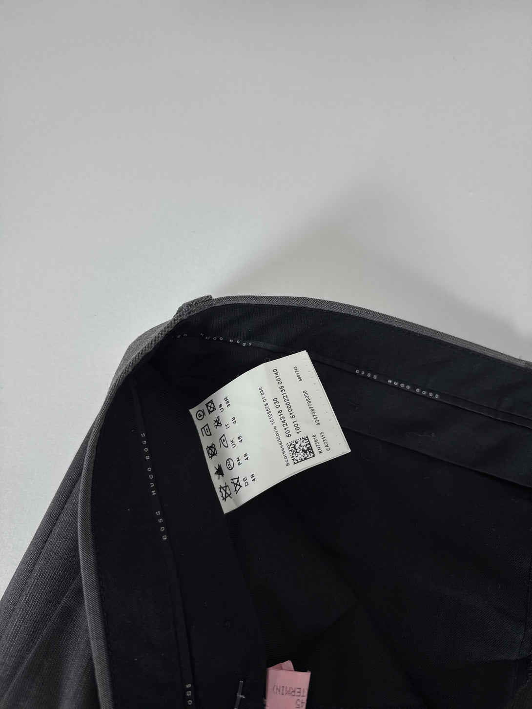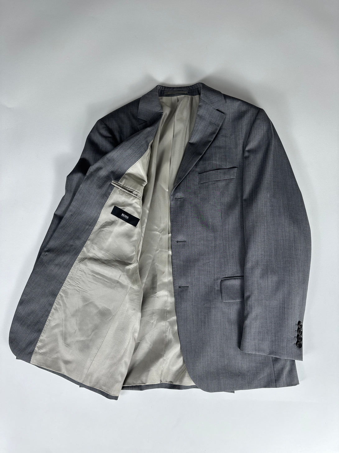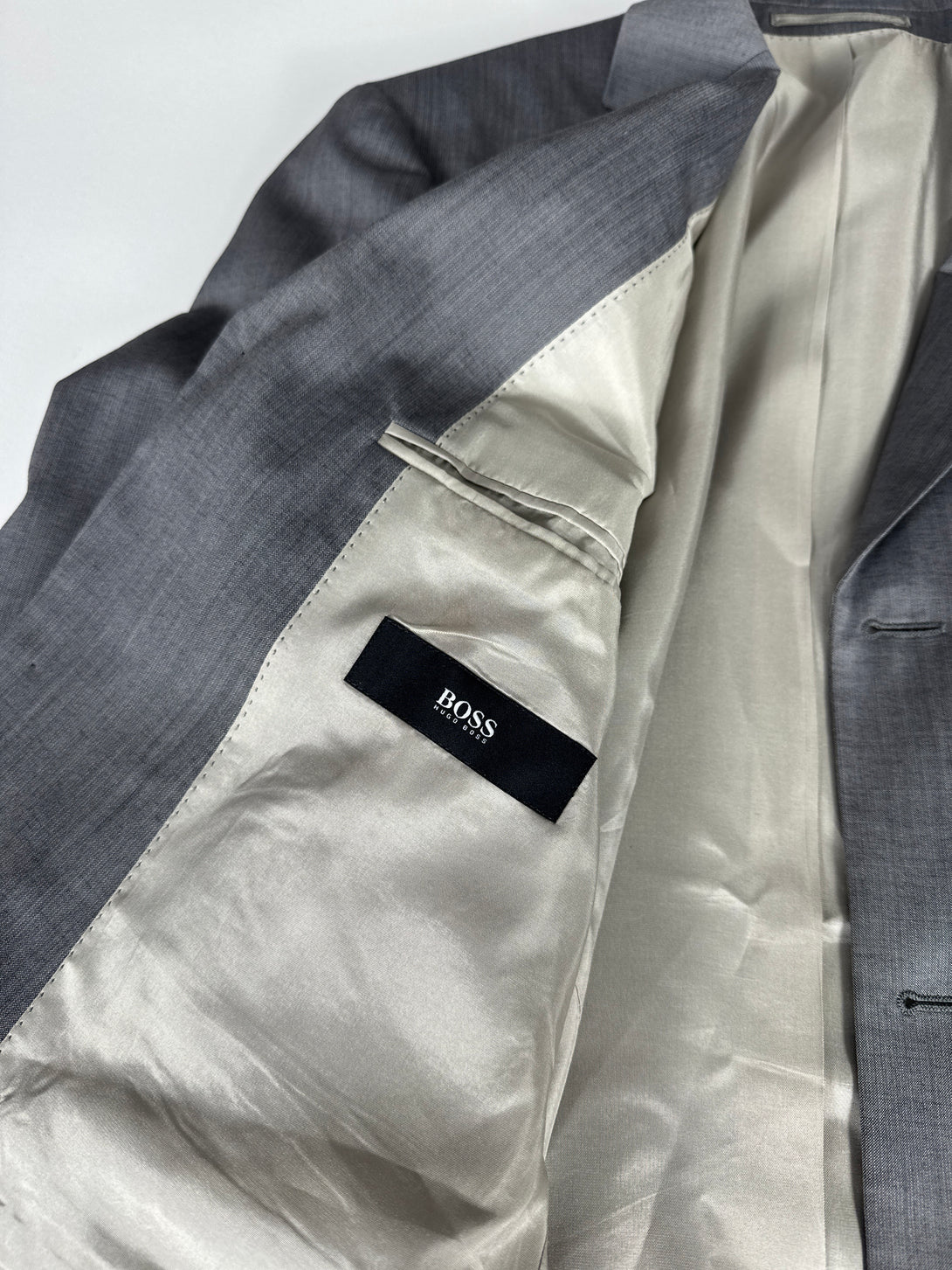 Costum elegant H. Boss gri 🎻 din lână virgină, sacou regulat fit, închidere prin 3 nasturi și 4 la manșetă(lungime 76cm, bust 54cm, umeri 45cm, lungime braț 67cm), pantaloni gri croială dreaptă, regular fit (lungime 106cm, talie 42cm, șolduri 42cm, coapsă 26cm) mărimea L, pentru bărbați