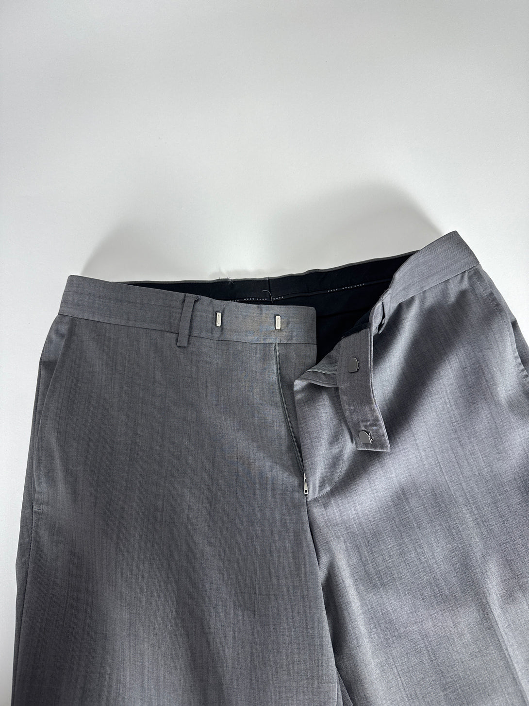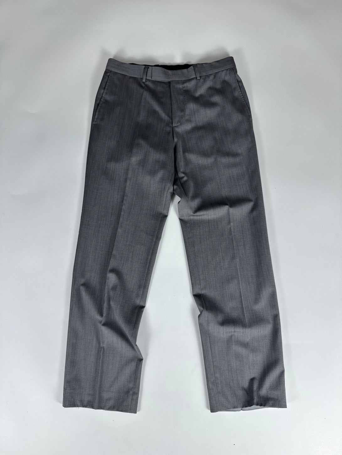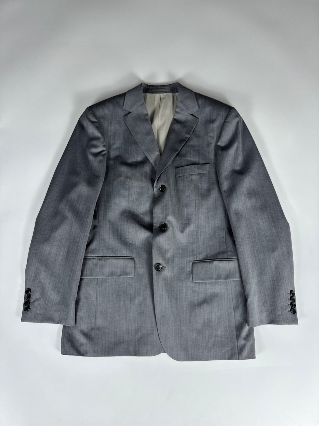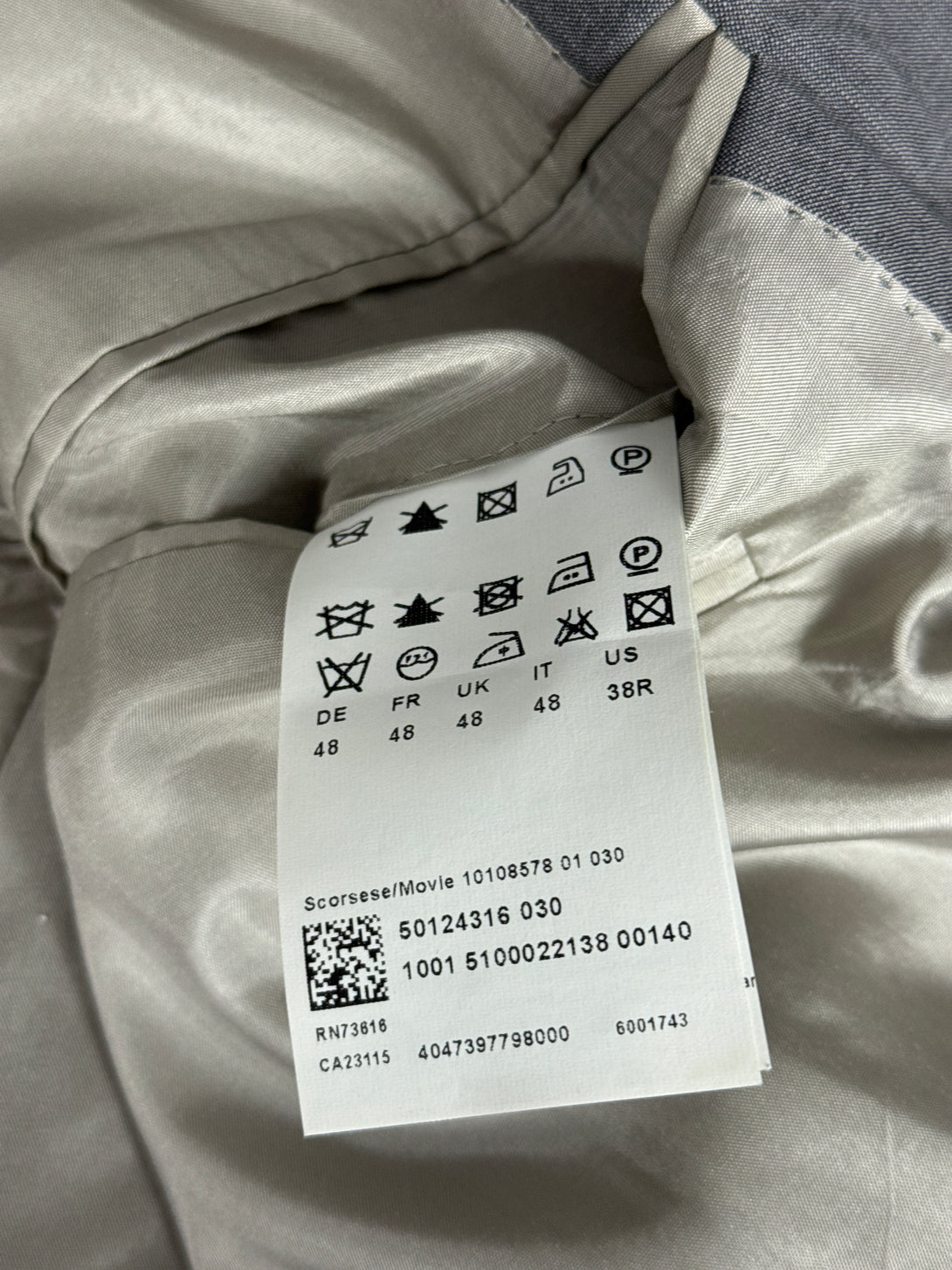 Costum elegant H. Boss gri 🎻 din lână virgină, sacou regulat fit, închidere prin 3 nasturi și 4 la manșetă(lungime 76cm, bust 54cm, umeri 45cm, lungime braț 67cm), pantaloni gri croială dreaptă, regular fit (lungime 106cm, talie 42cm, șolduri 42cm, coapsă 26cm) mărimea L, pentru bărbați