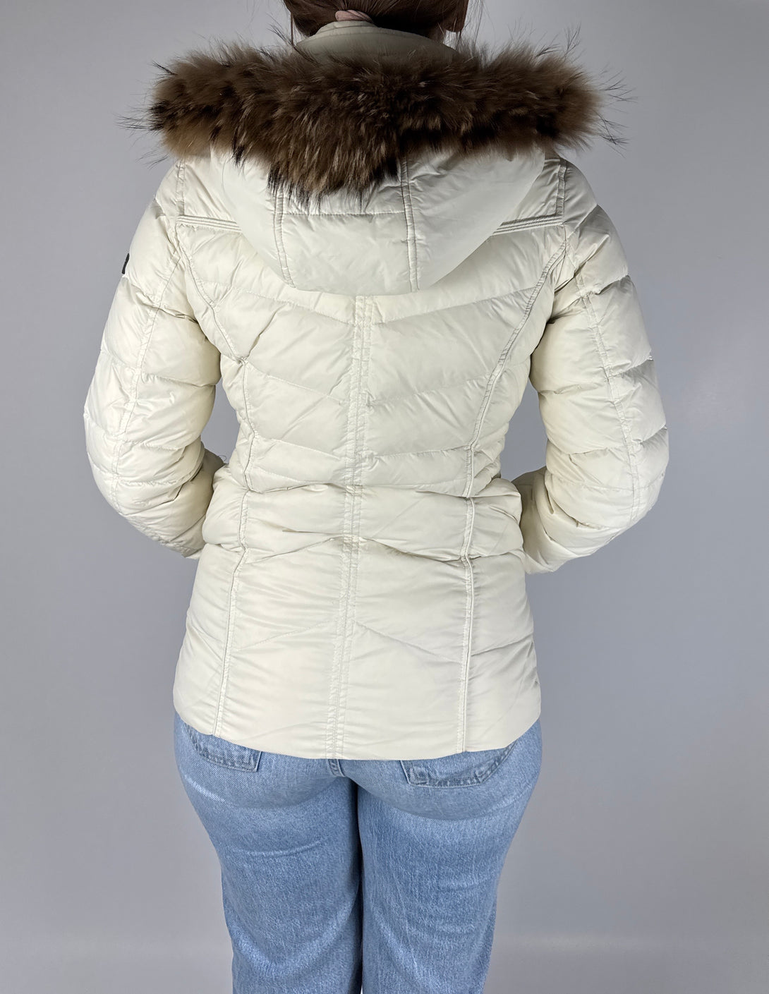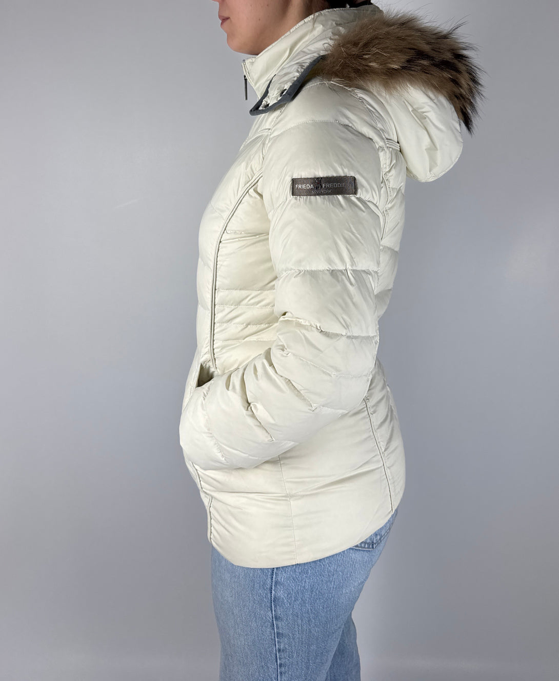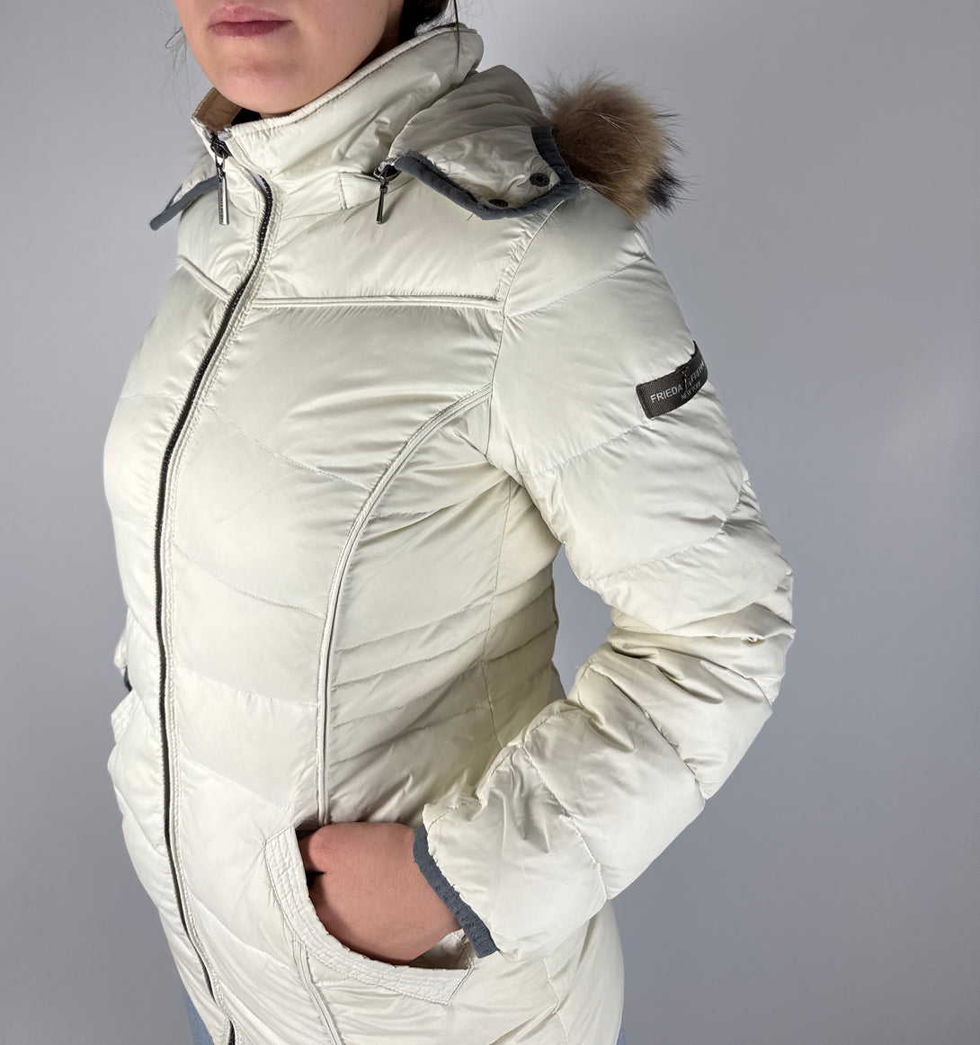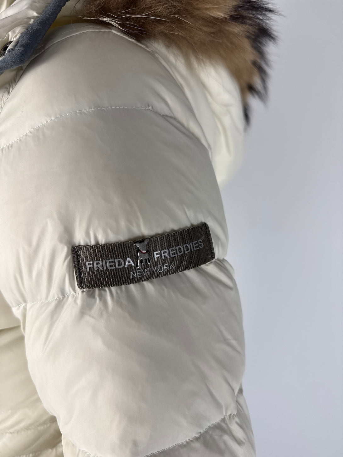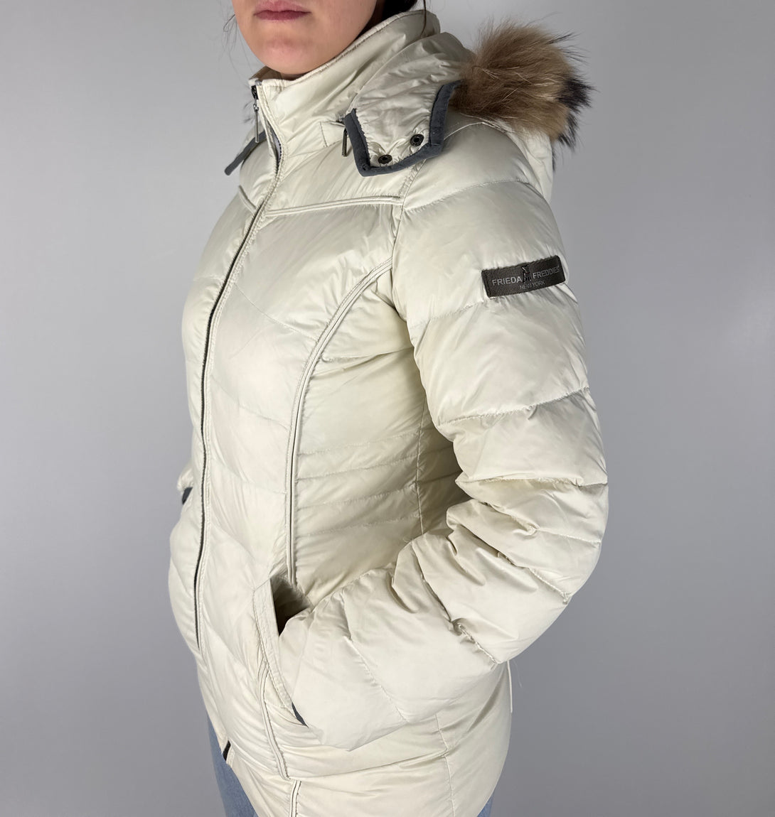 Geacă matlasată Frieda & Freddies 🐶bej deschis, glugă cu blană artificială detașabilă, exterior din poliester, umplutură cu 70% puf autentic, 30% pene 🪶 mărimea S (lungimea 62cm, bust 50cm, umeri 40cm, lungime braț 60cm)