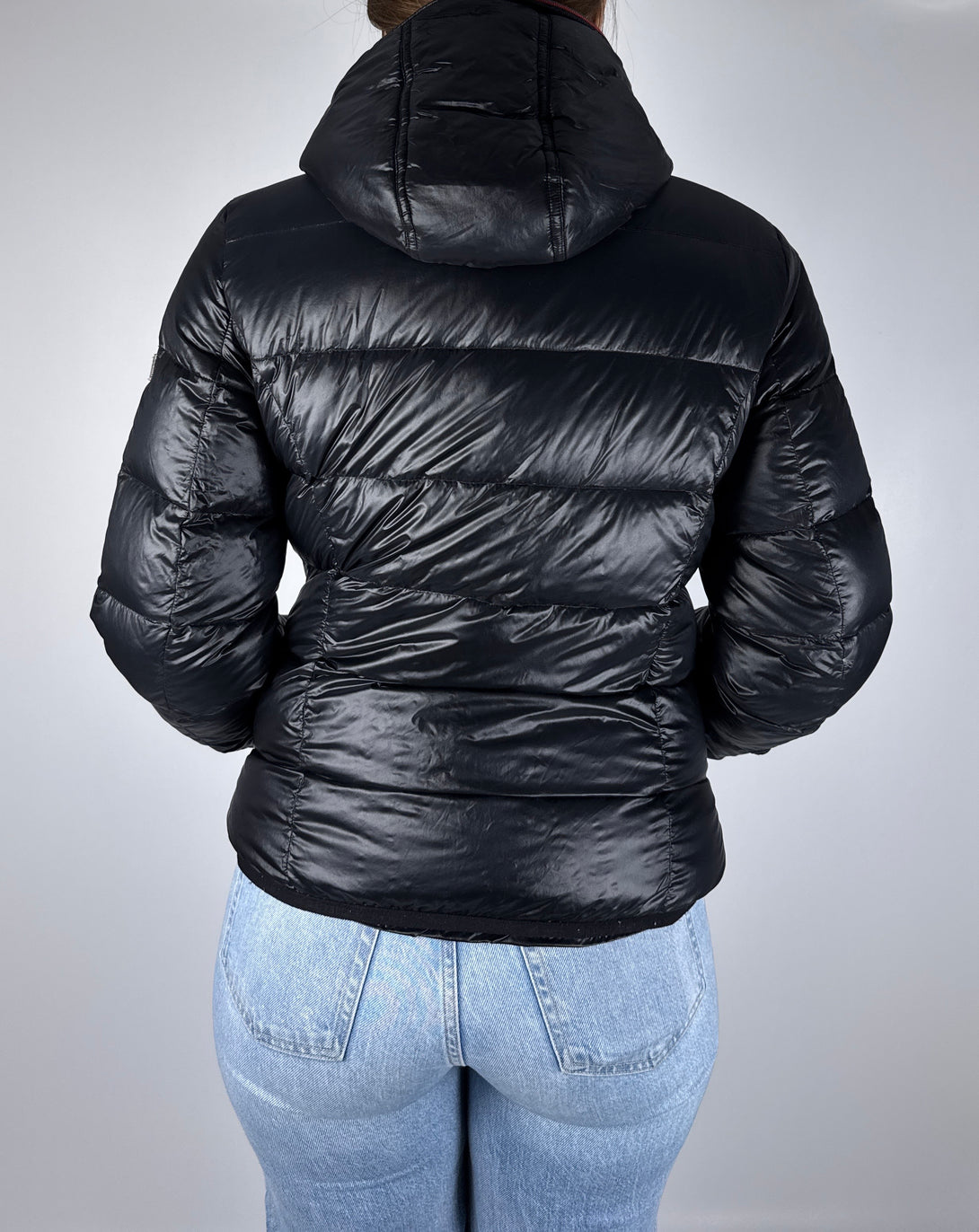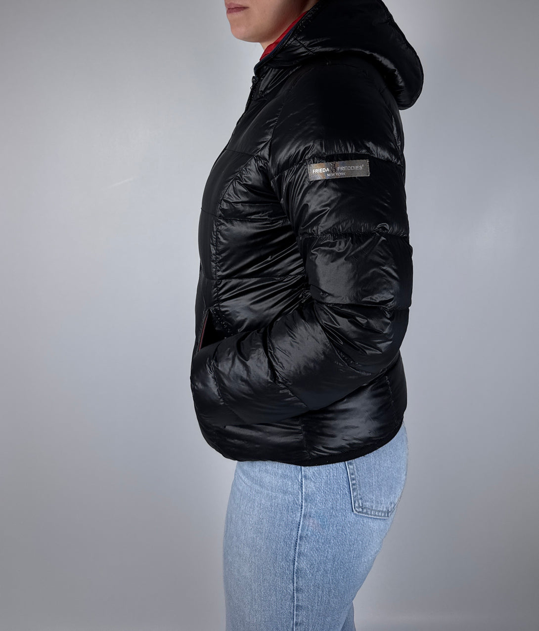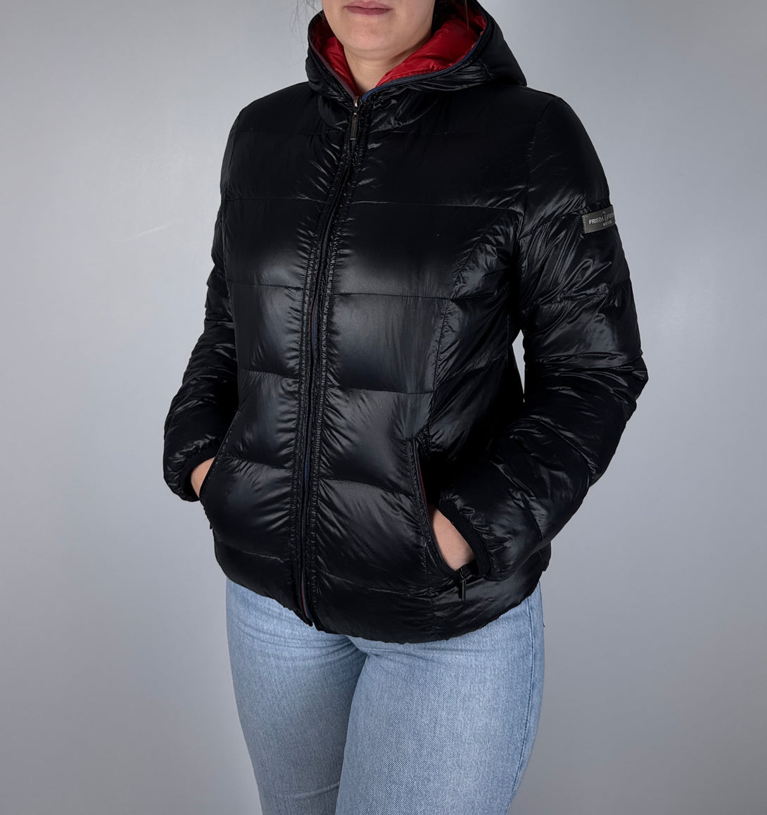 Geacă puffer (matlasată) neagră de damă de la brandul Frieda & Freddies 🐶umplutură 80% puf, 20% pene, mărimea S (lungime 62cm, bust 52cm, umeri 40cm, lungime braț 62cm)