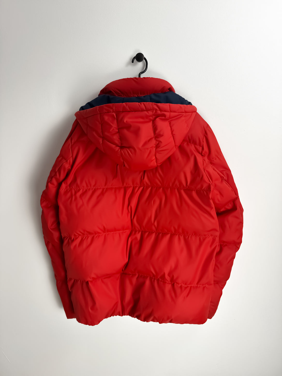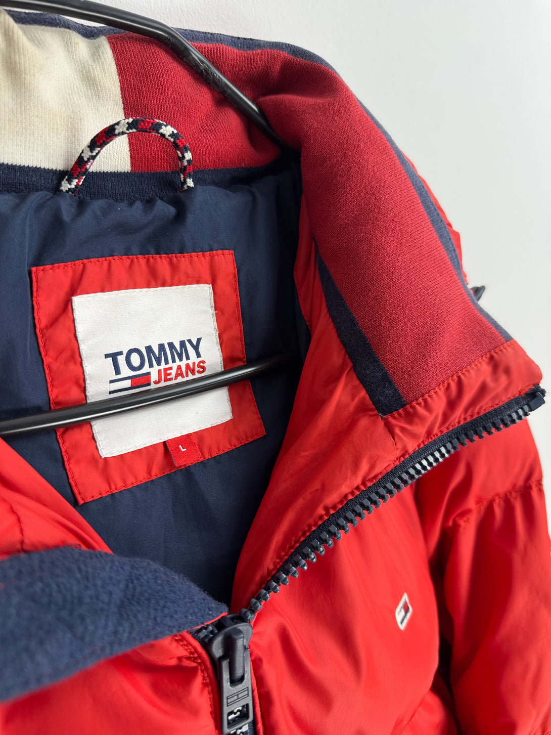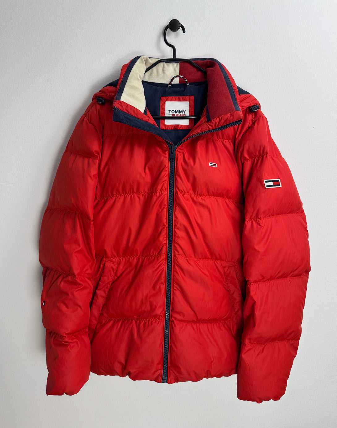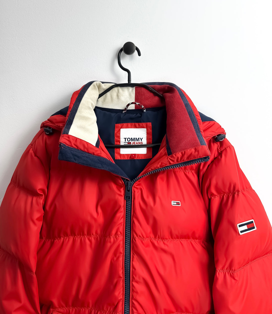 Geacă roșie de puf Tommy Jeans Essential pentru bărbați. Este fabricată din poliester 100% și are o umplutură din 70% puf de rață și 30% pene, asigurând izolare termică.