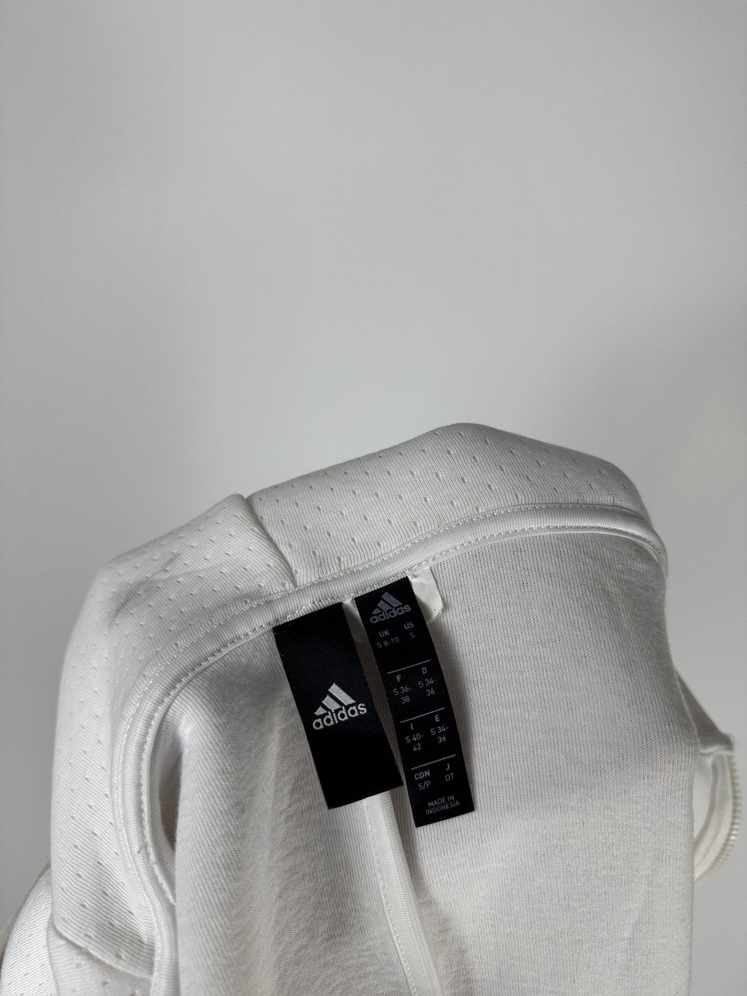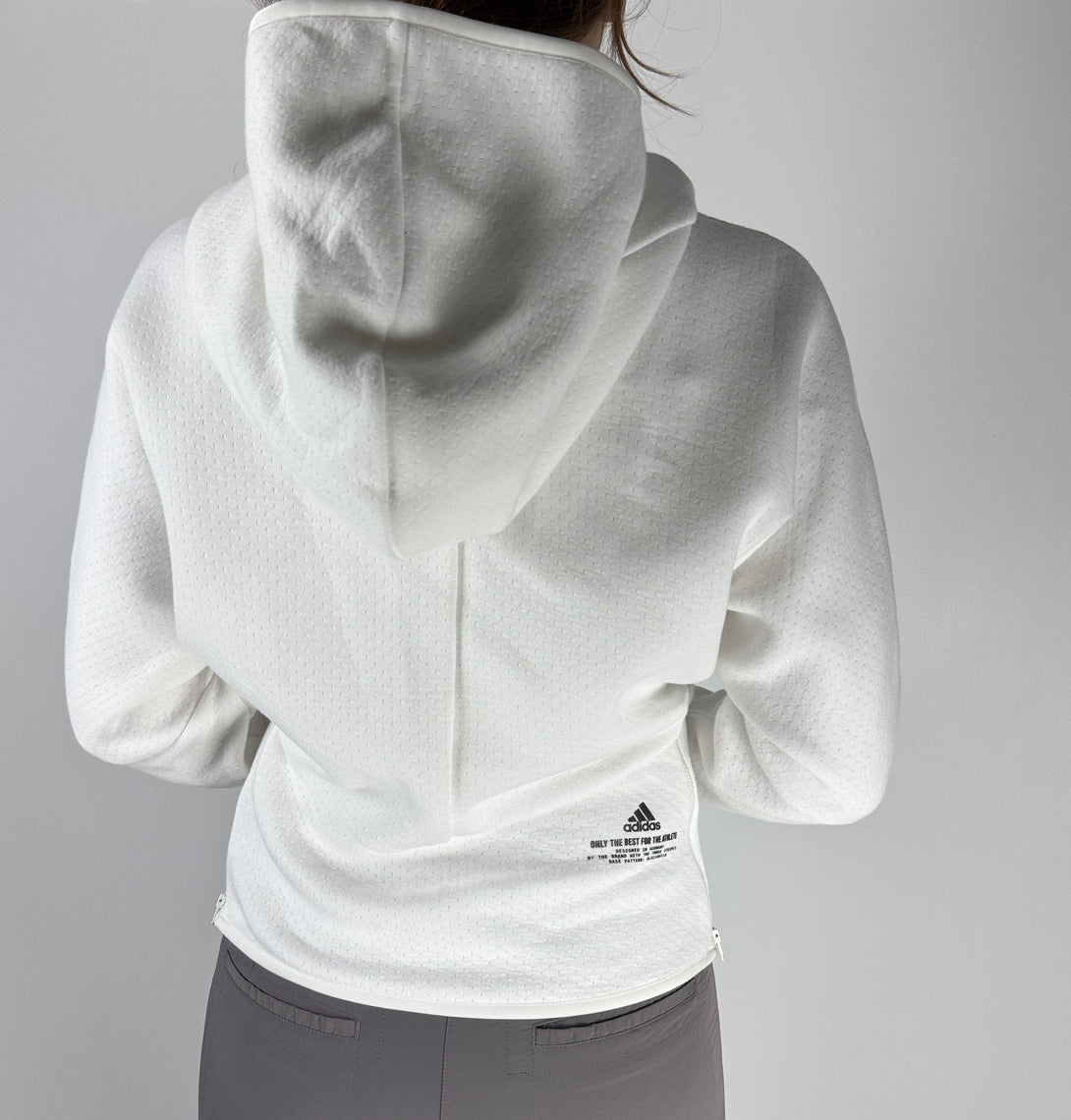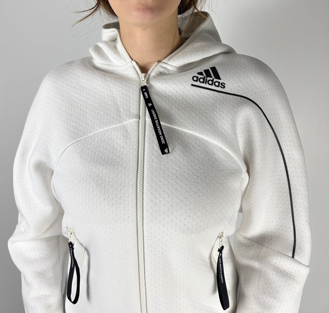 Aceasta este un hanorac sport cu glugă Adidas Z.N.E. (Zero Negative Energy) pentru femei, în culoarea alb. Este un model popular, conceput pentru a oferi confort și o libertate completă de mișcare, adesea purtat de sportivi înainte și după competiții.