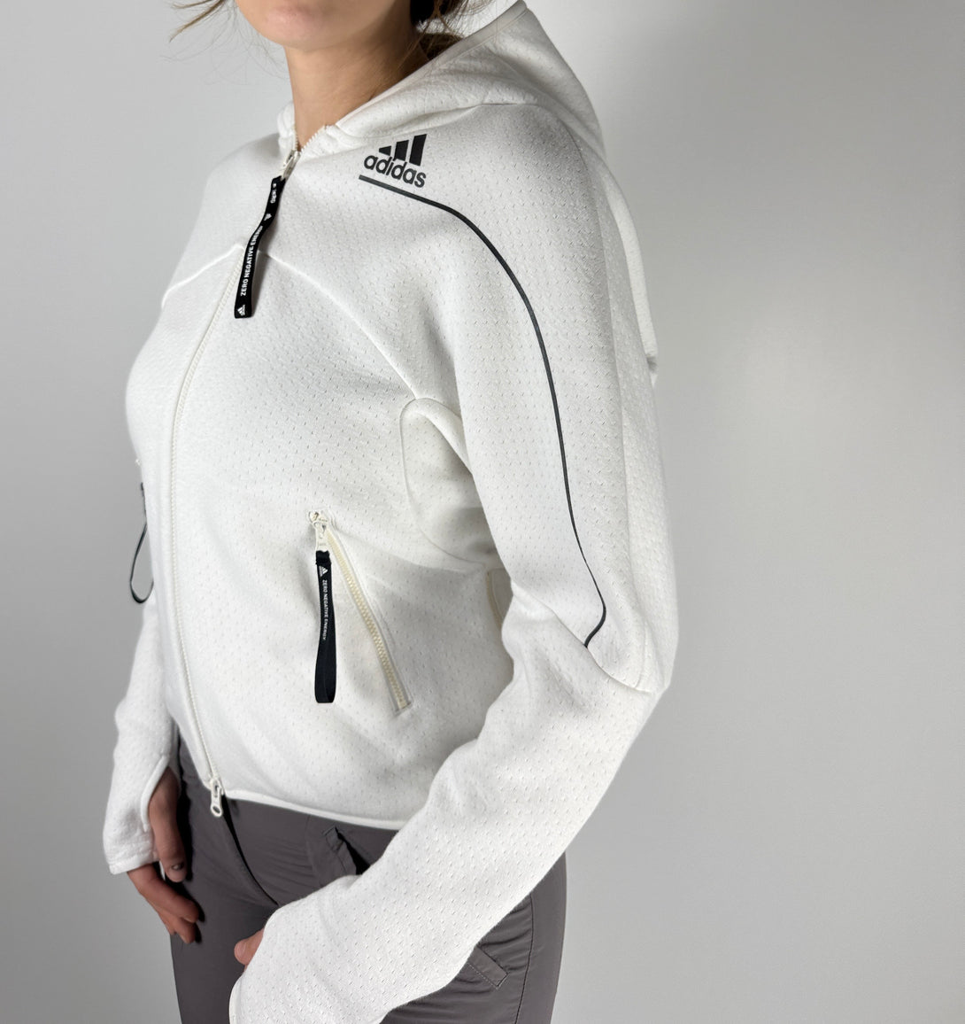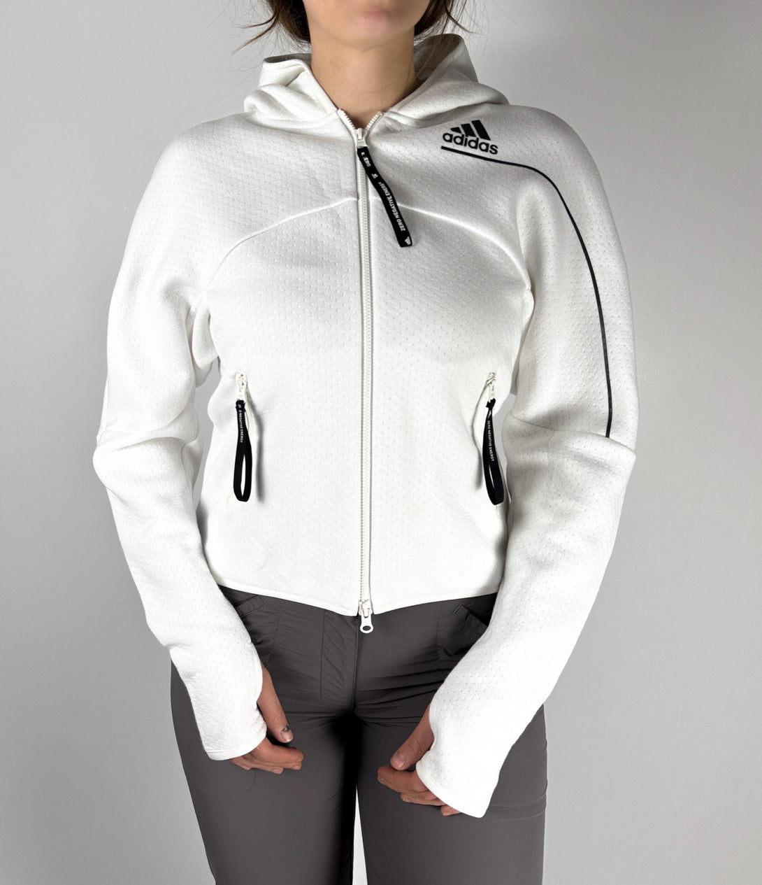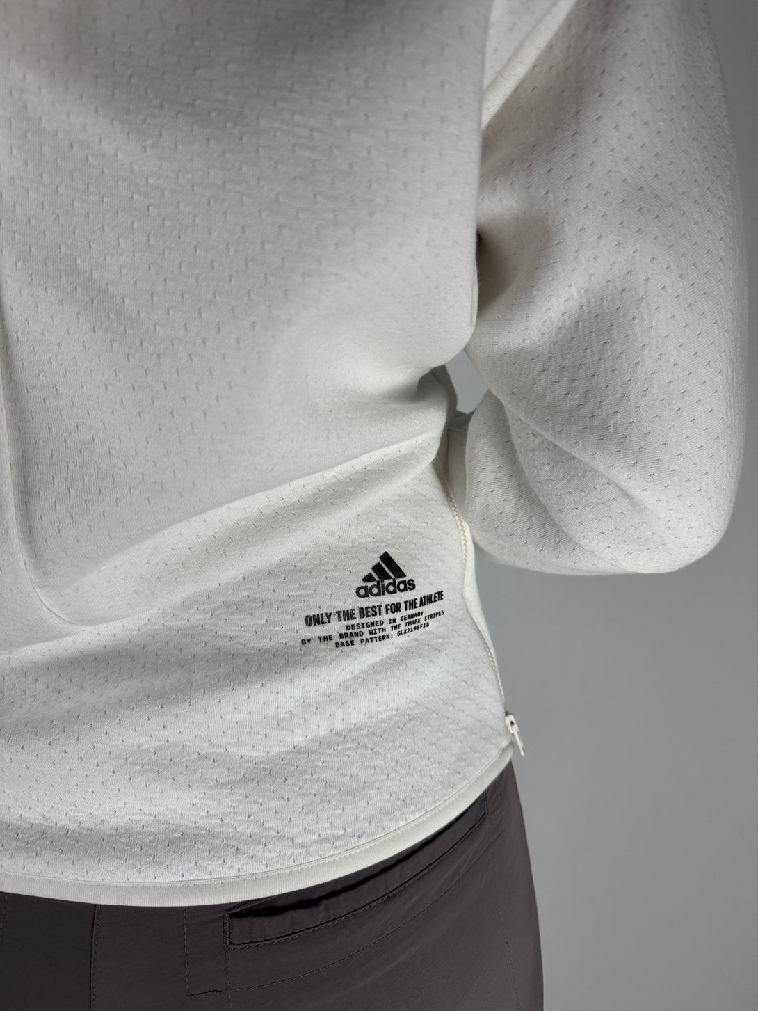 Aceasta este un hanorac sport cu glugă Adidas Z.N.E. (Zero Negative Energy) pentru femei, în culoarea alb. Este un model popular, conceput pentru a oferi confort și o libertate completă de mișcare, adesea purtat de sportivi înainte și după competiții.