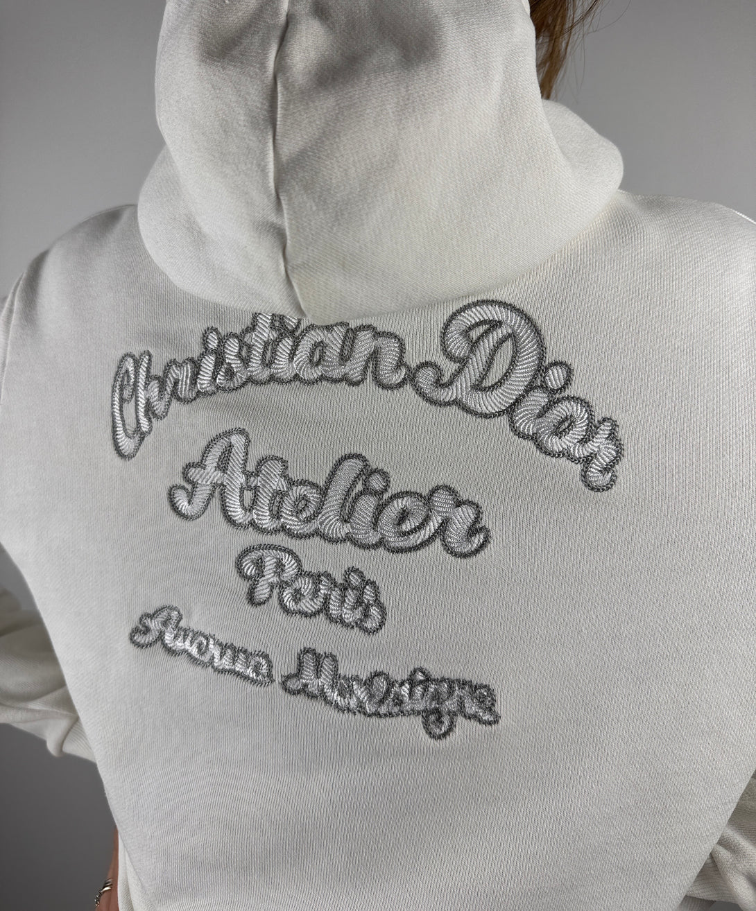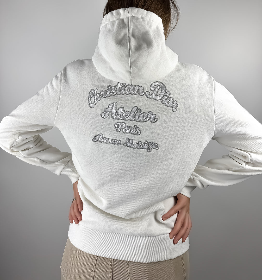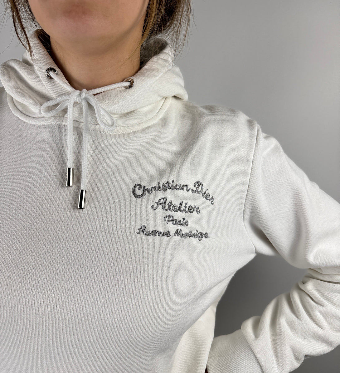 Acest articol este un hanorac alb 'Christian Dior Atelier', o piesă populară din colecția pentru damă a brandului. Hanoracul are imprimată pe spate semnătura "Christian Dior Atelier Paris, Avenue Montaigne" cu strasuri.
