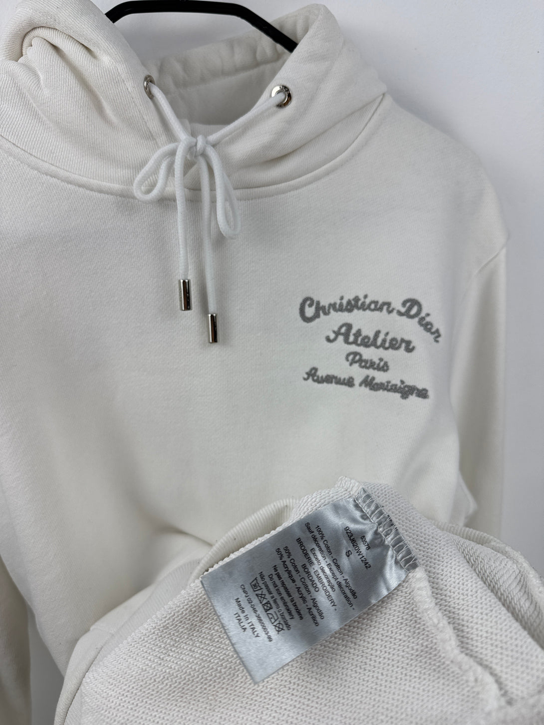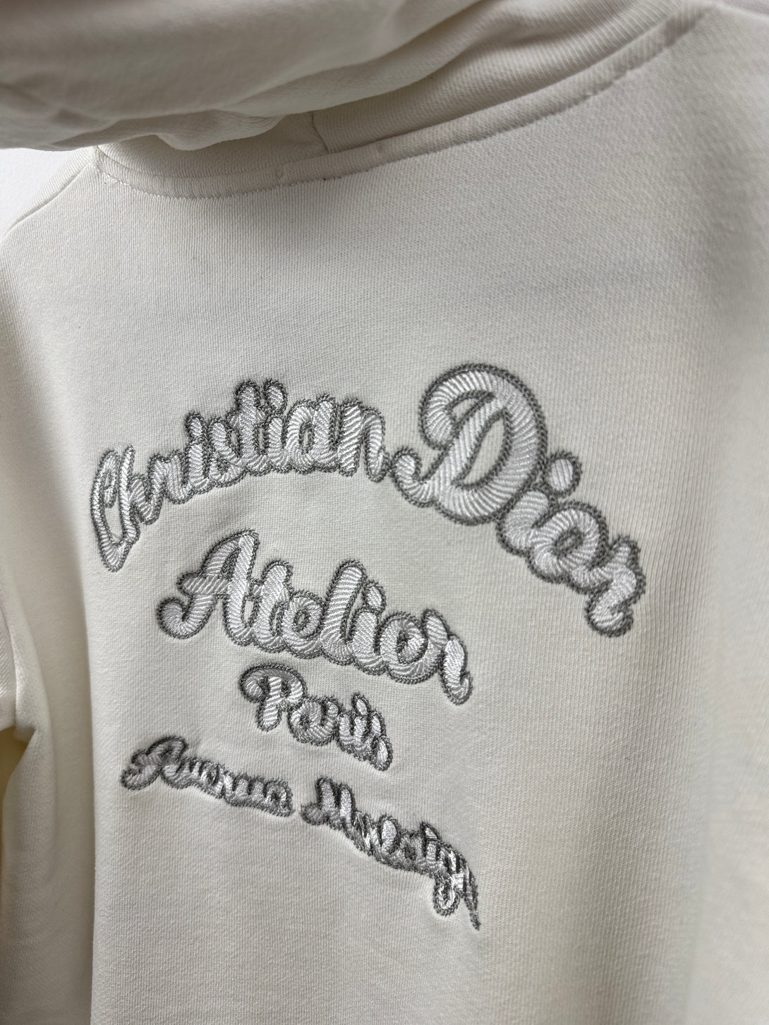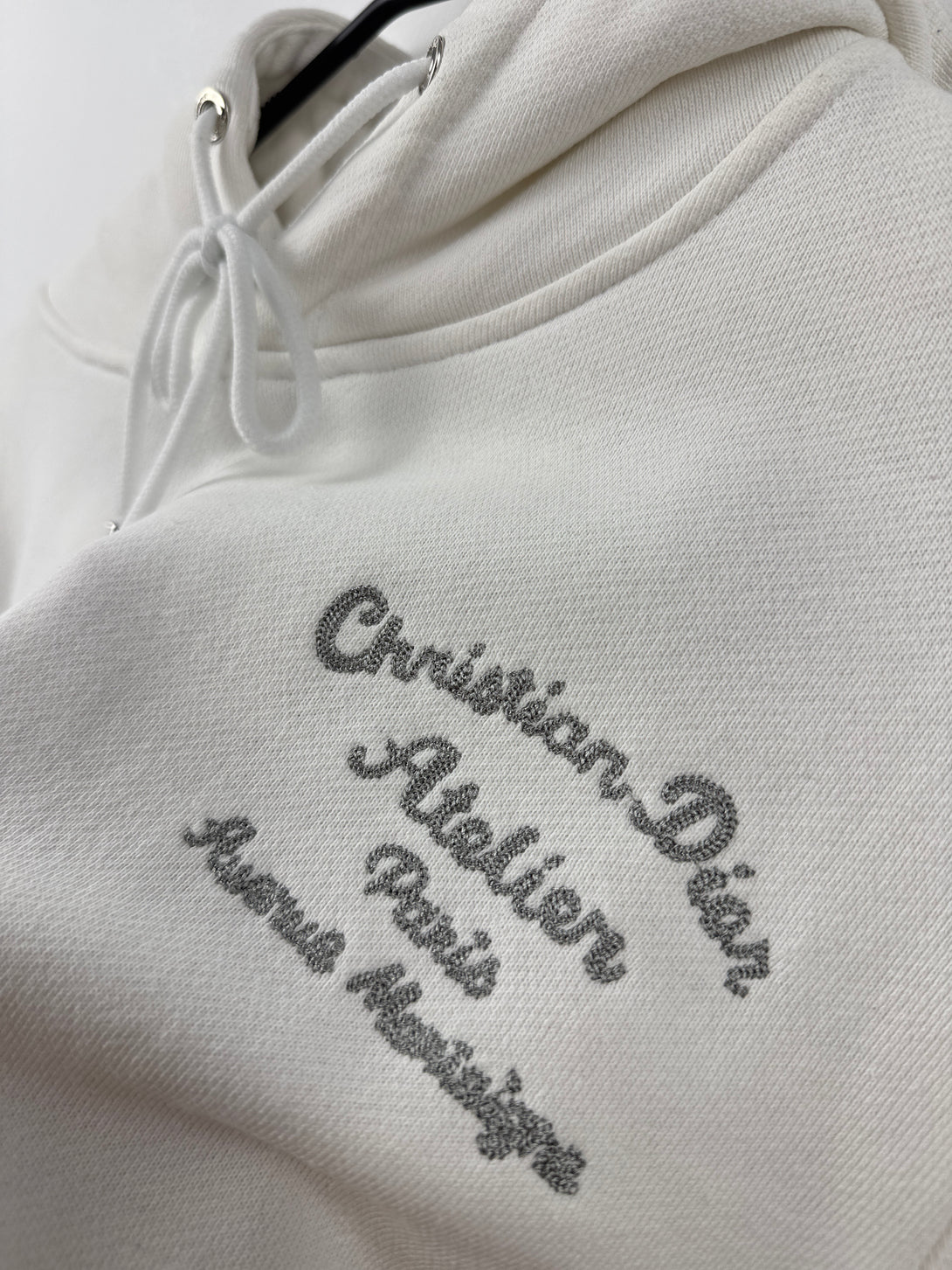 Acest articol este un hanorac alb 'Christian Dior Atelier', o piesă populară din colecția pentru damă a brandului. Hanoracul are imprimată pe spate semnătura "Christian Dior Atelier Paris, Avenue Montaigne" cu strasuri.