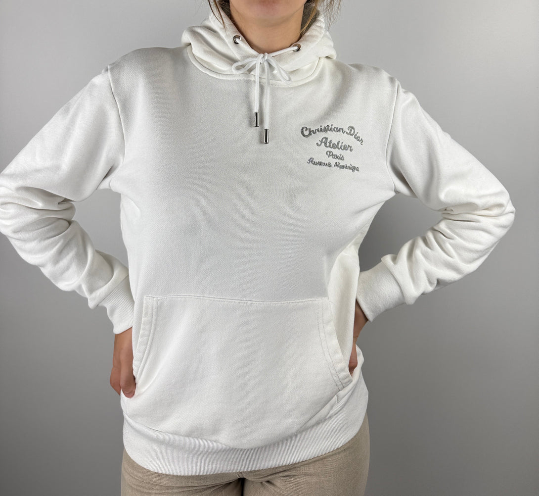 - Design: Hanorac cu glugă, de culoare albă, cu logo-ul față/spate renumitului atelier Dior brodate elemente strălucitoare pe spate.