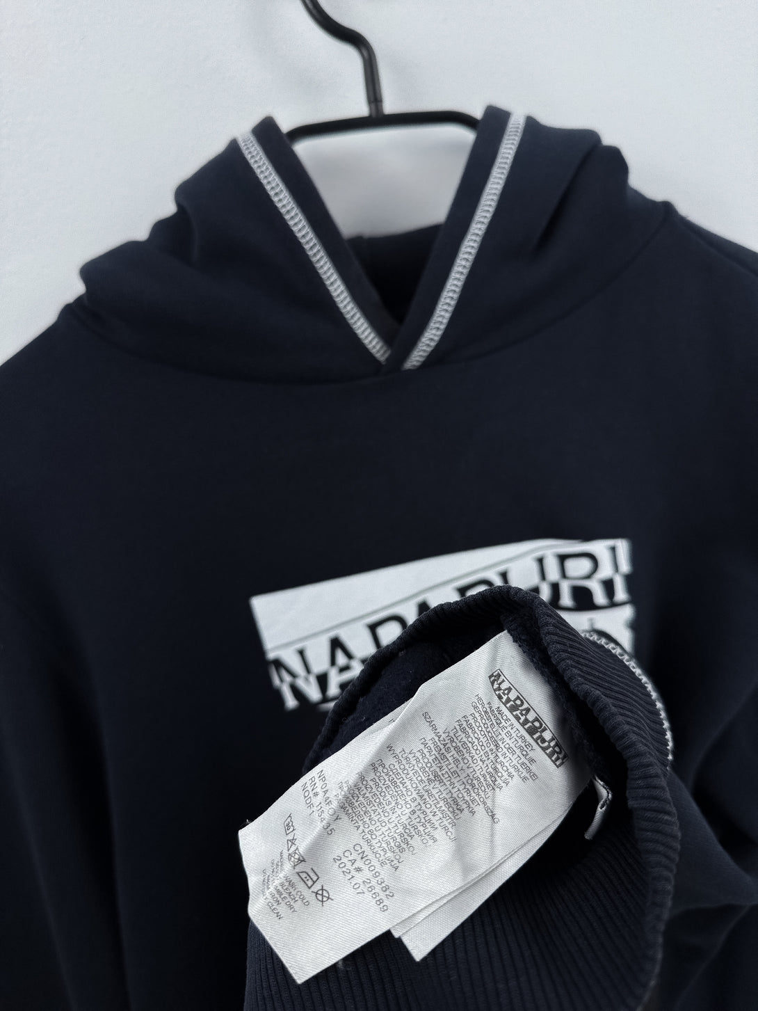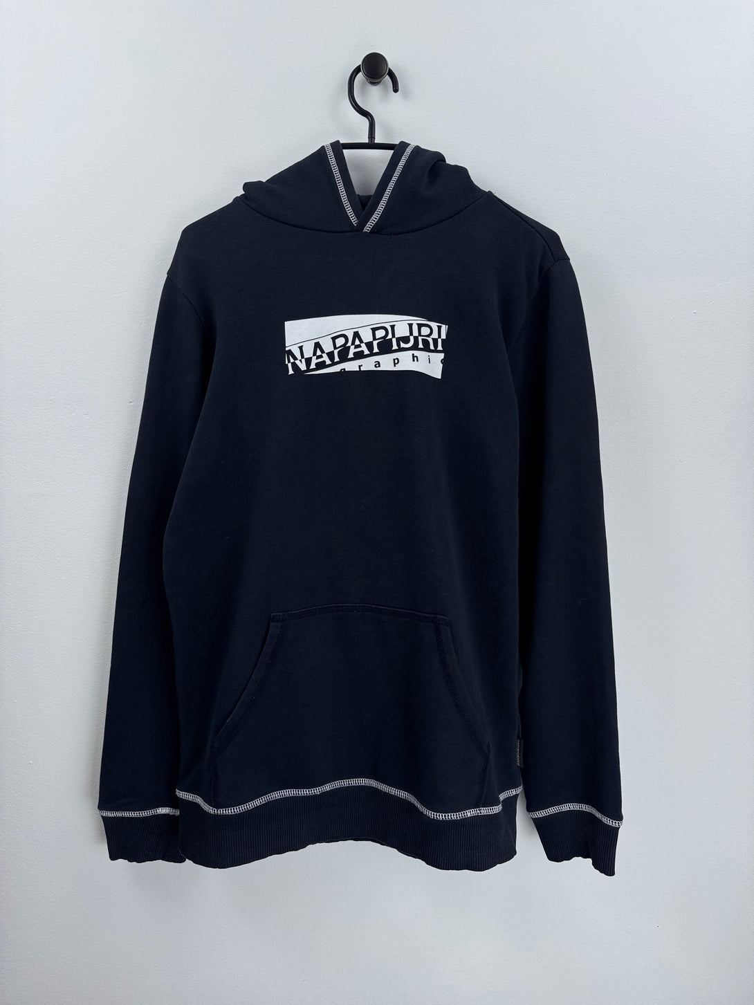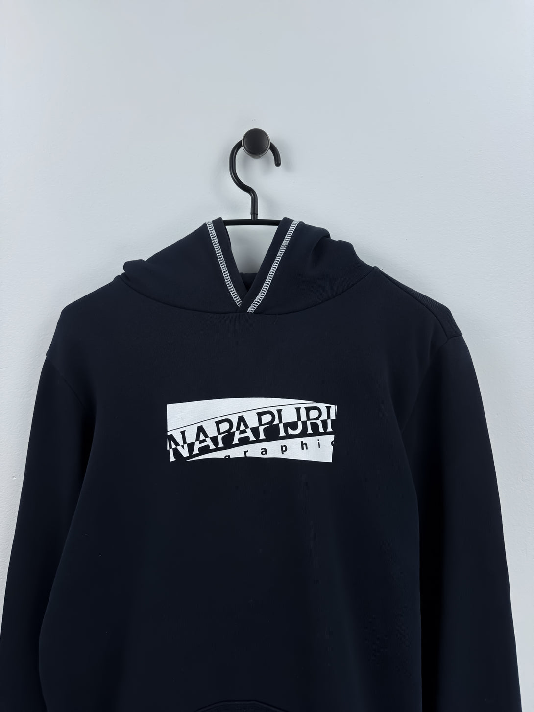- Design: Prezintă un logo rectangular alb imprimat pe piept, cu textul "NAPAPIJRI geographic" în interiorul casetei. Cusăturile albe contrastante sunt vizibile la glugă, manșete și tivul inferior.