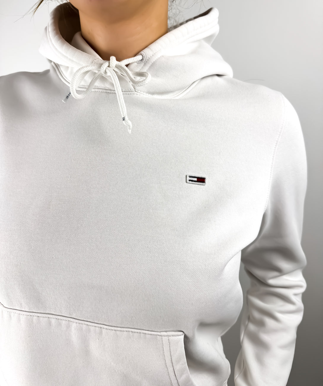 Hanorac de la Tommy Jeans. Este un hanorac alb, cu glugă și un buzunar tip marsupiu.