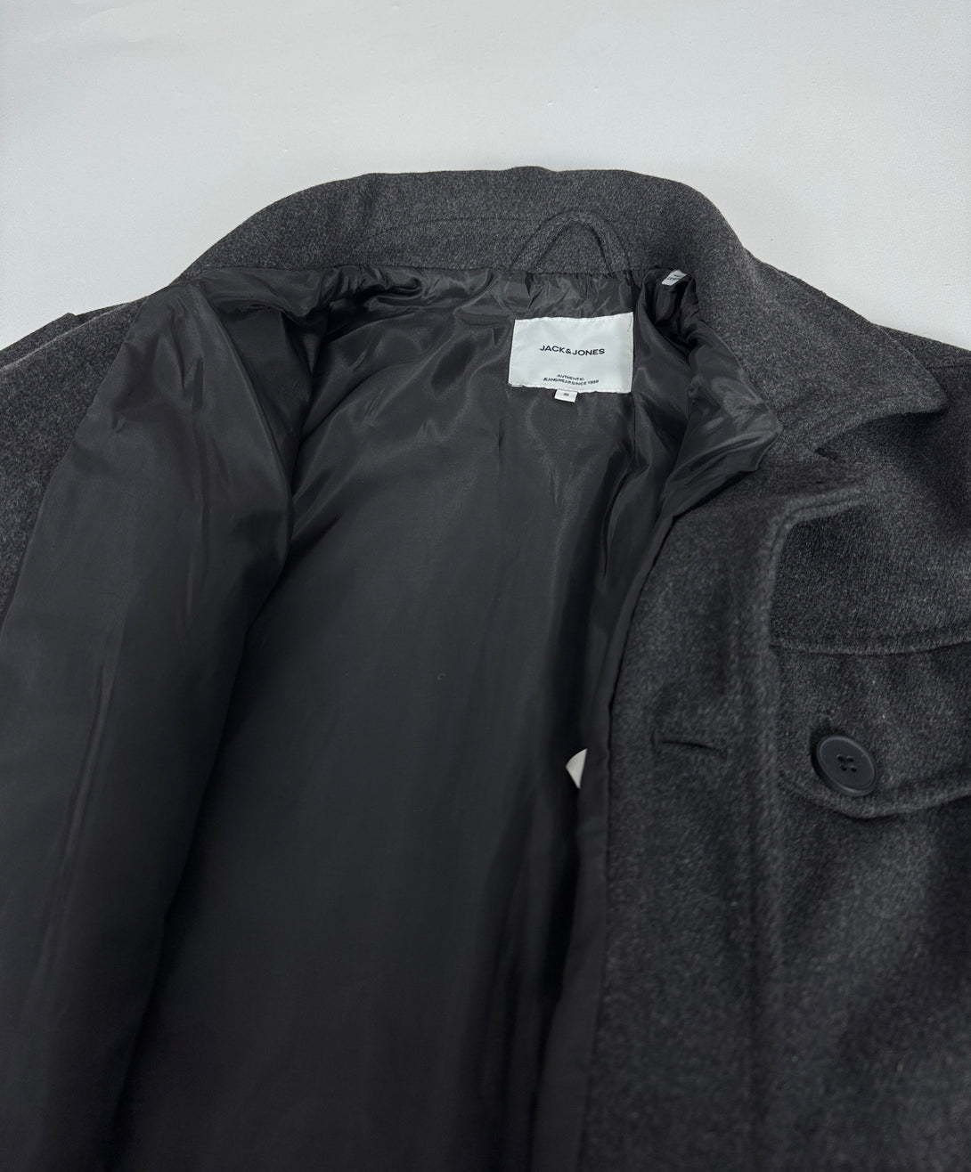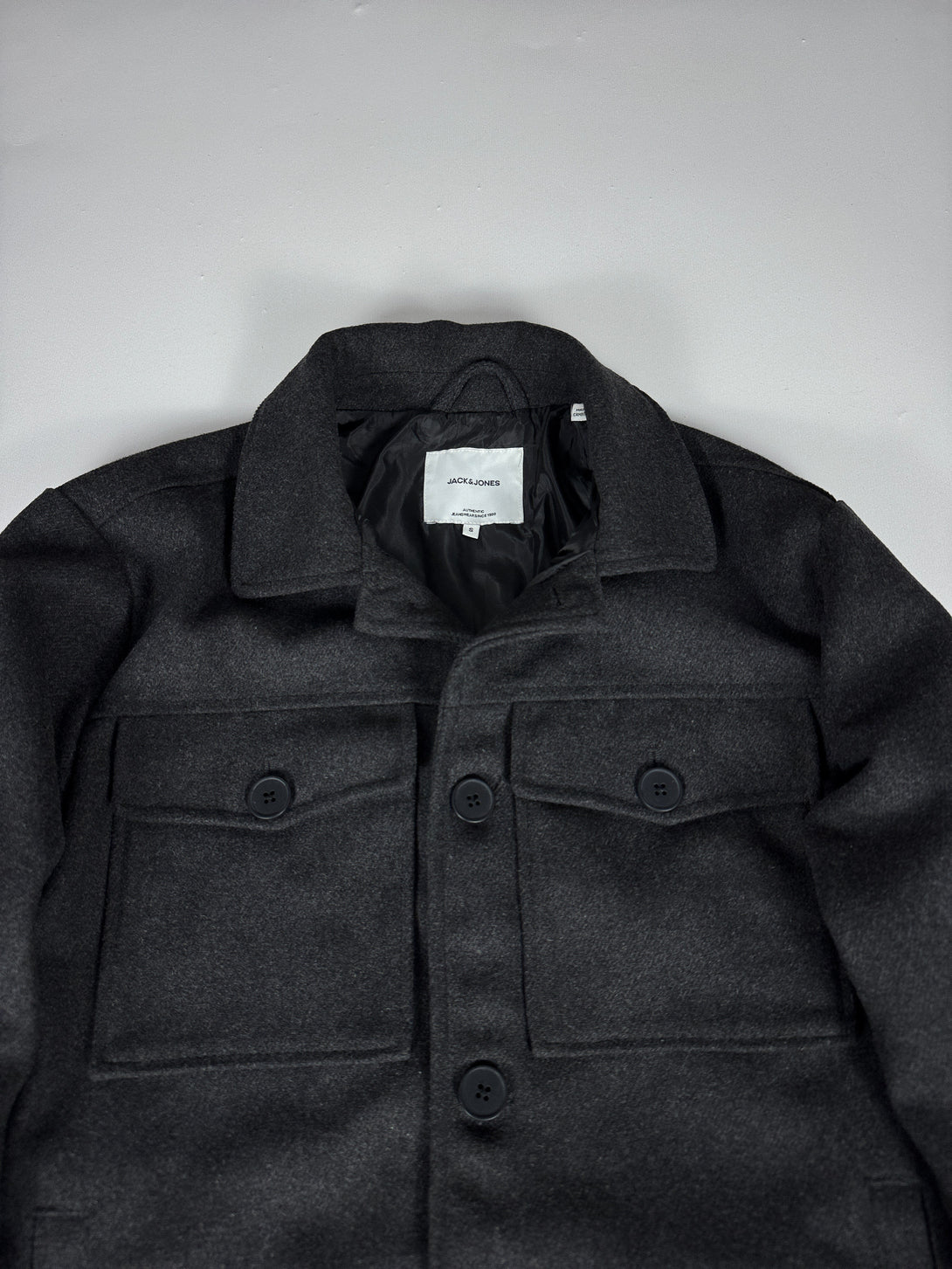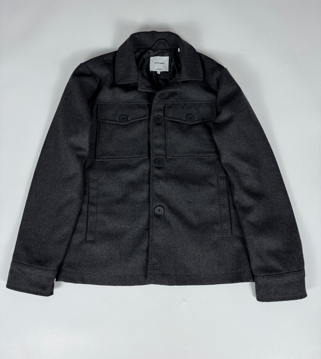 Aceasta este o jachetă-cămașă Jack & Jones de culoare gri închis (antracit), confecționată dintr-un amestec de lână.