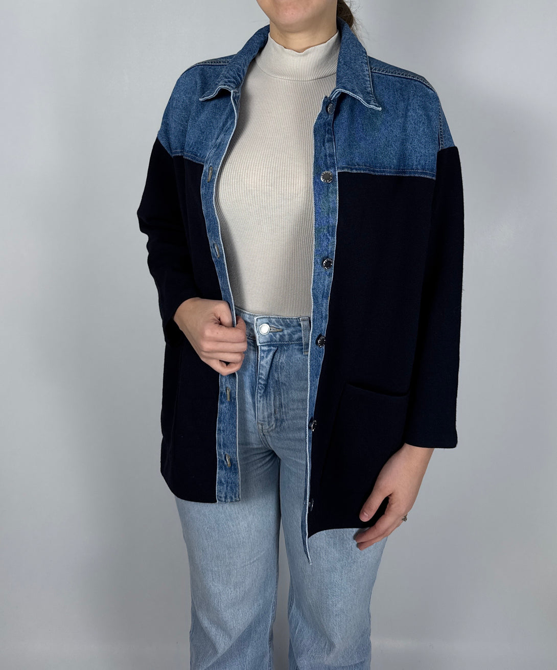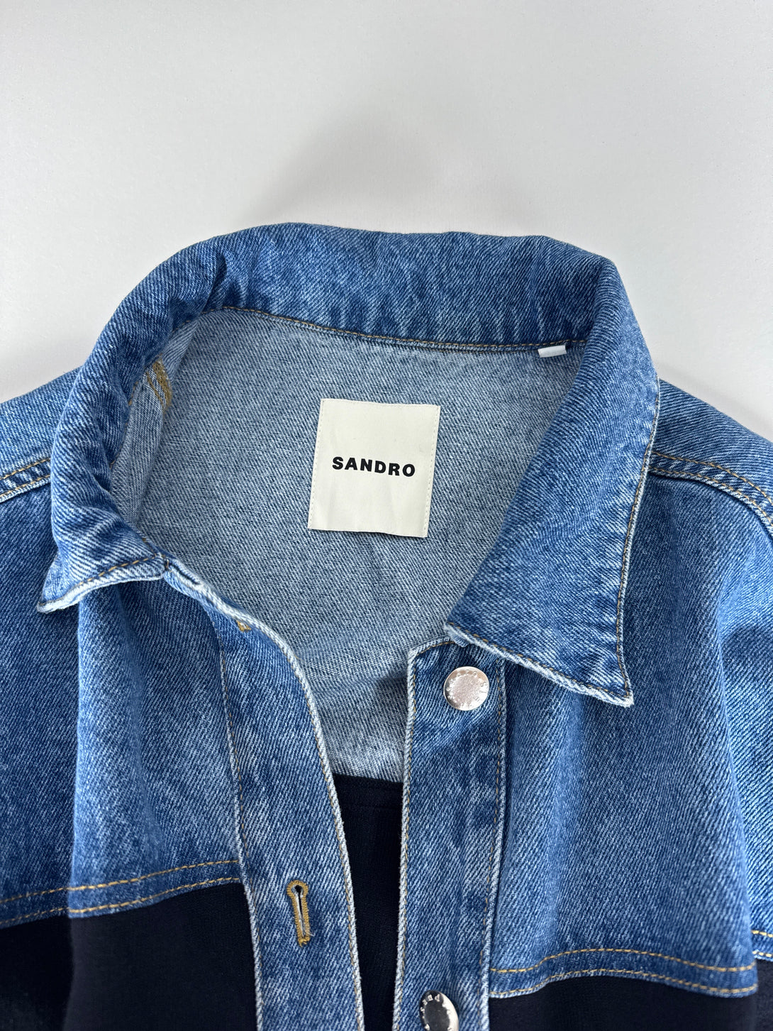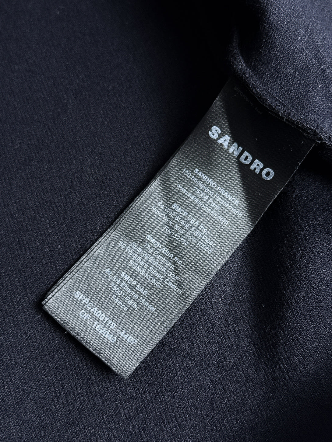 - Design: Prezintă un design în blocuri de culori contrastante, cu partea superioară albastră și partea inferioară neagră. Nasturi inscripționați cu brandul Sandro