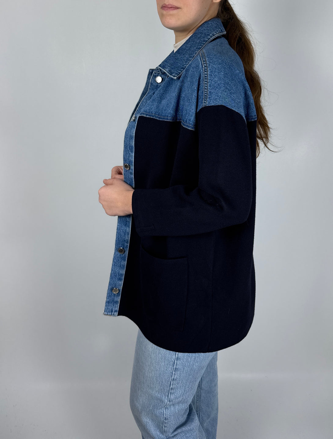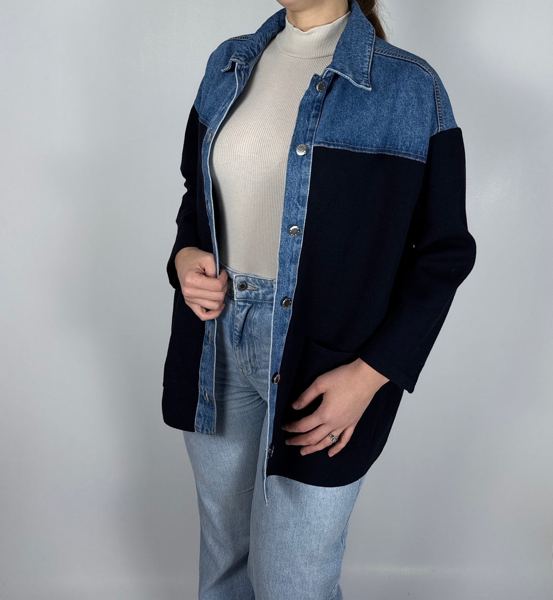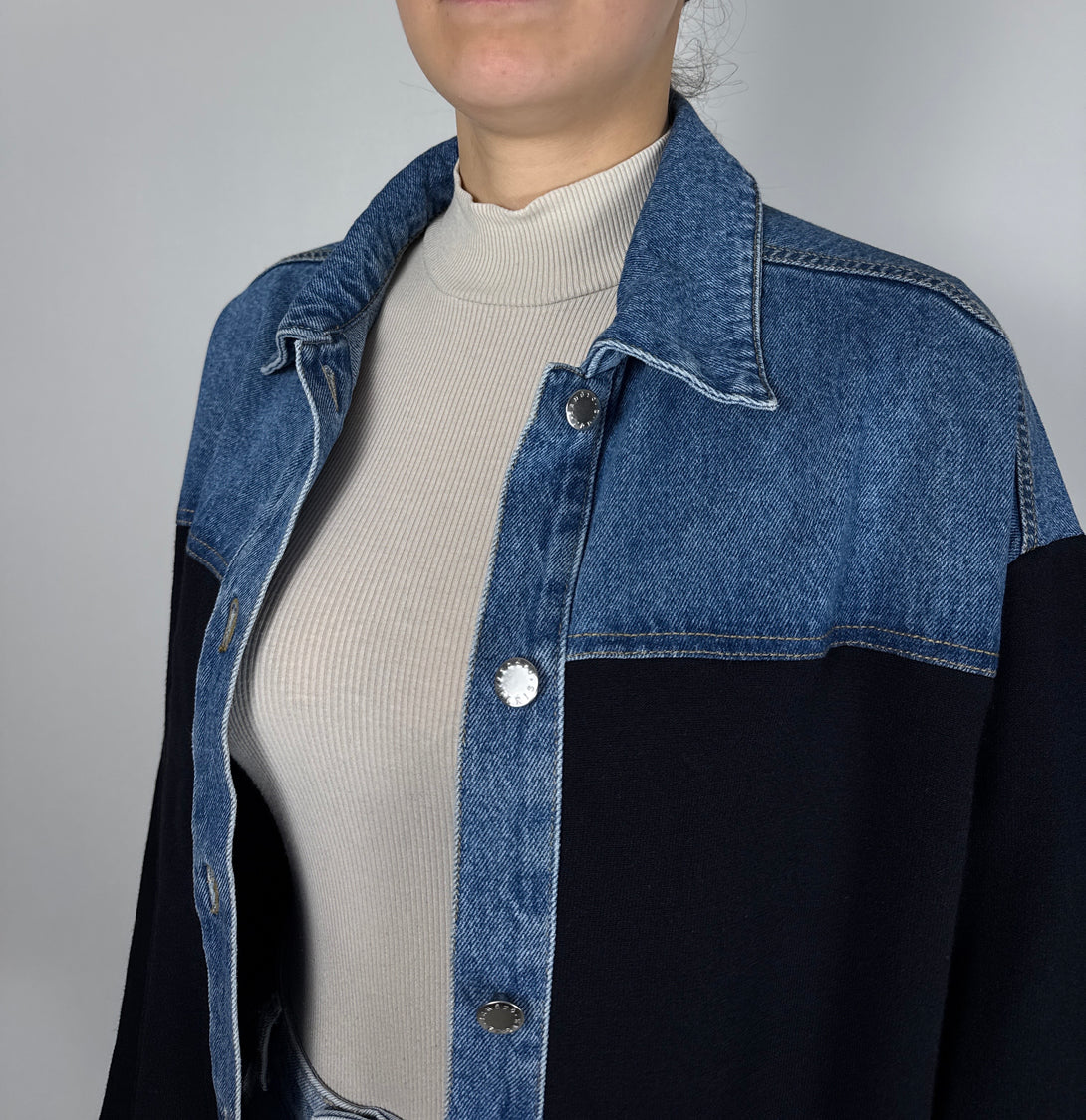 - Design: Prezintă un design în blocuri de culori contrastante, cu partea superioară albastră și partea inferioară neagră. Nasturi inscripționați cu brandul Sandro