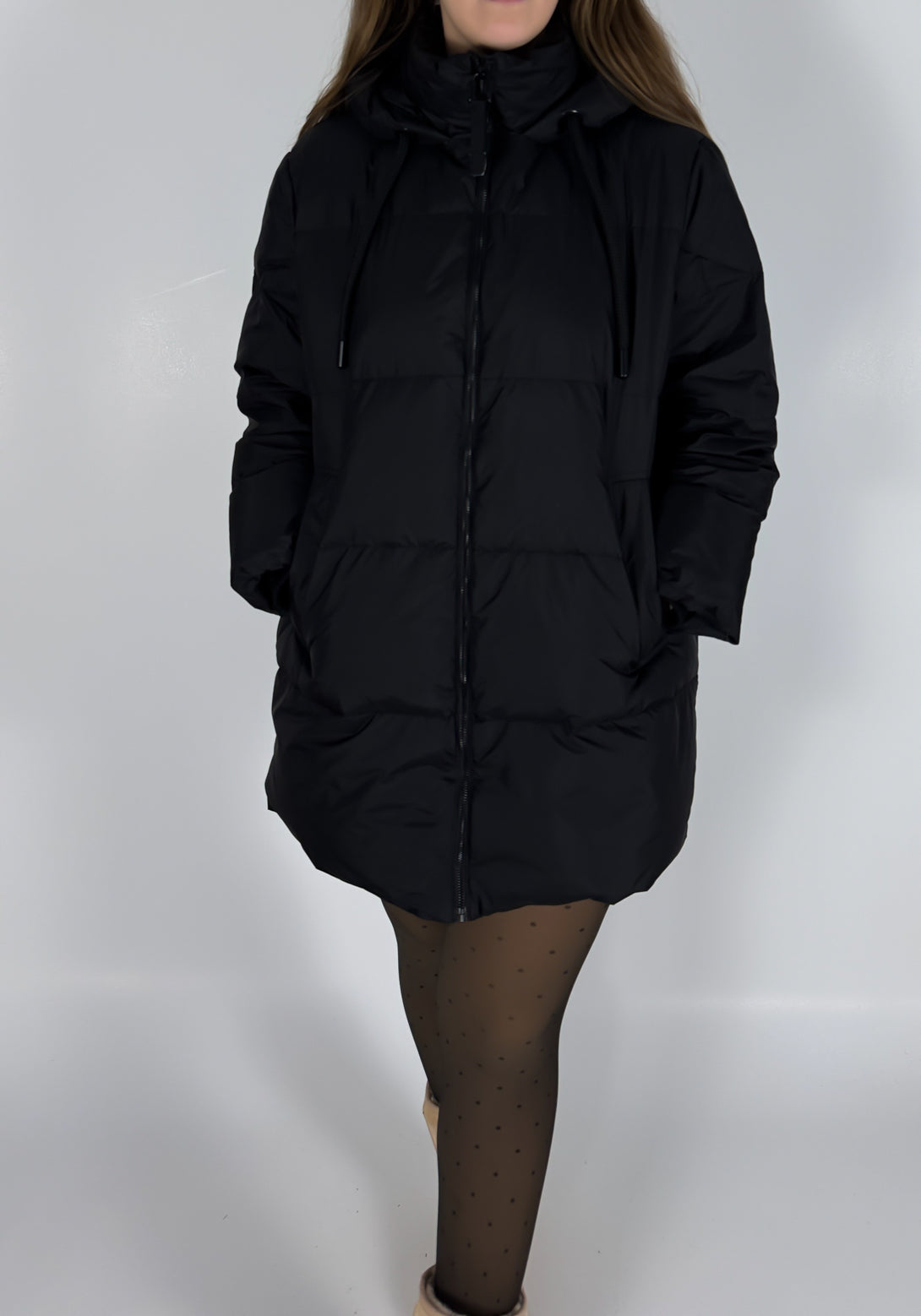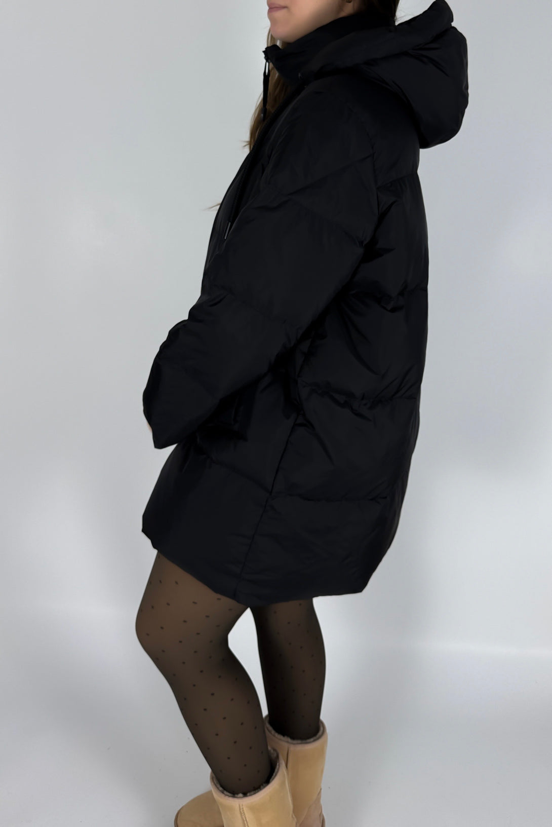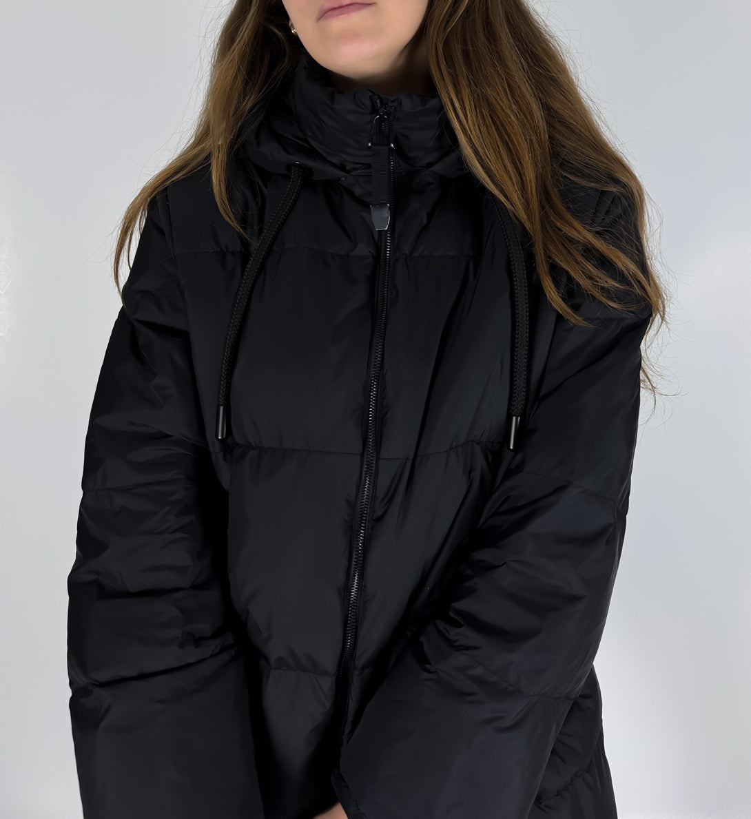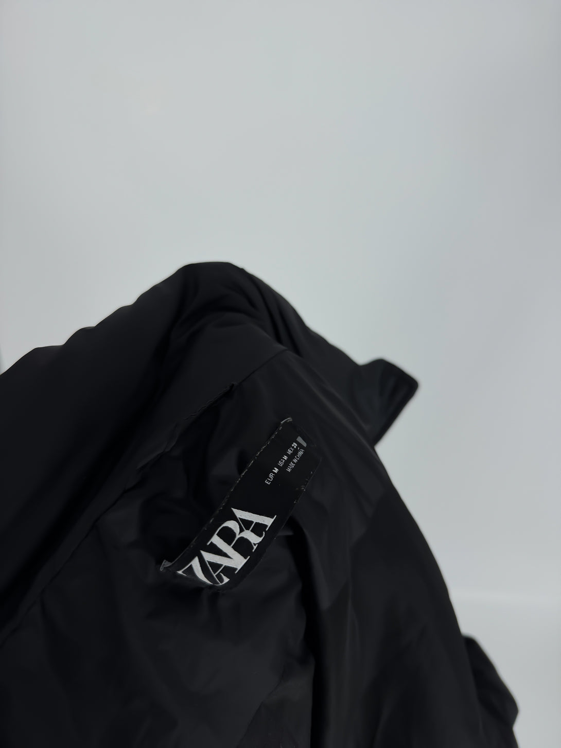 Geacă lungă neagră de puf de la Zara. Este o jachetă supradimensionată, rezistentă la apă și vânt, concepută pentru a oferi izolare termică în climatele reci.