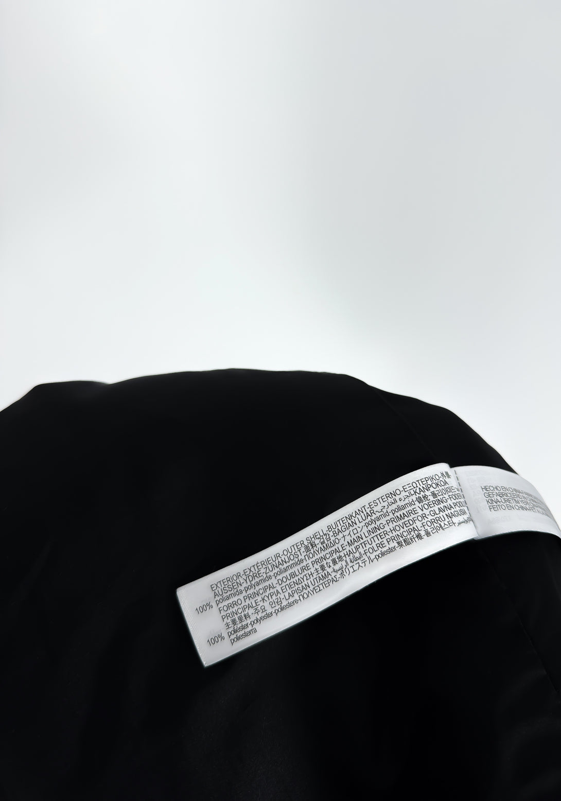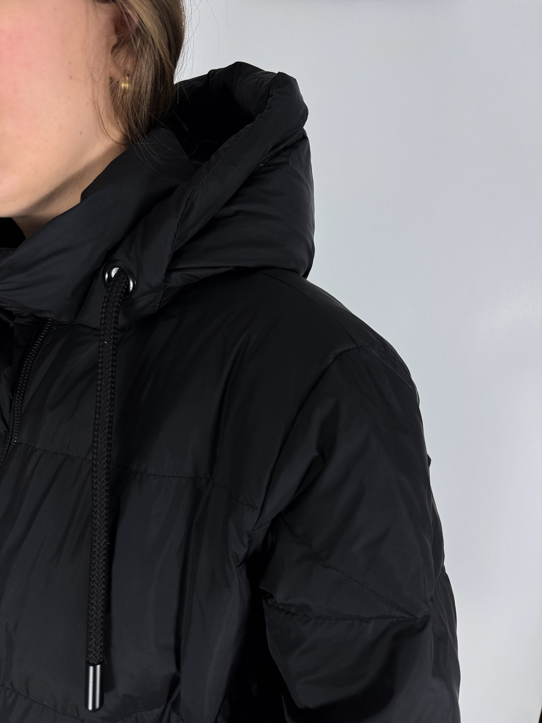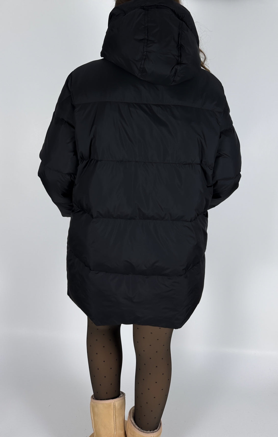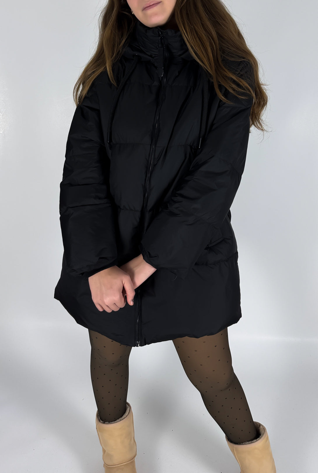 Geacă lungă neagră de puf de la Zara. Este o jachetă supradimensionată, rezistentă la apă și vânt, concepută pentru a oferi izolare termică în climatele reci.