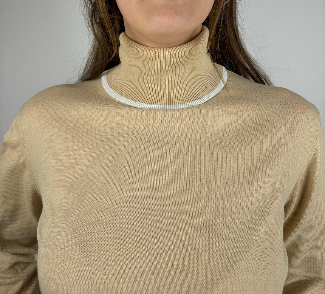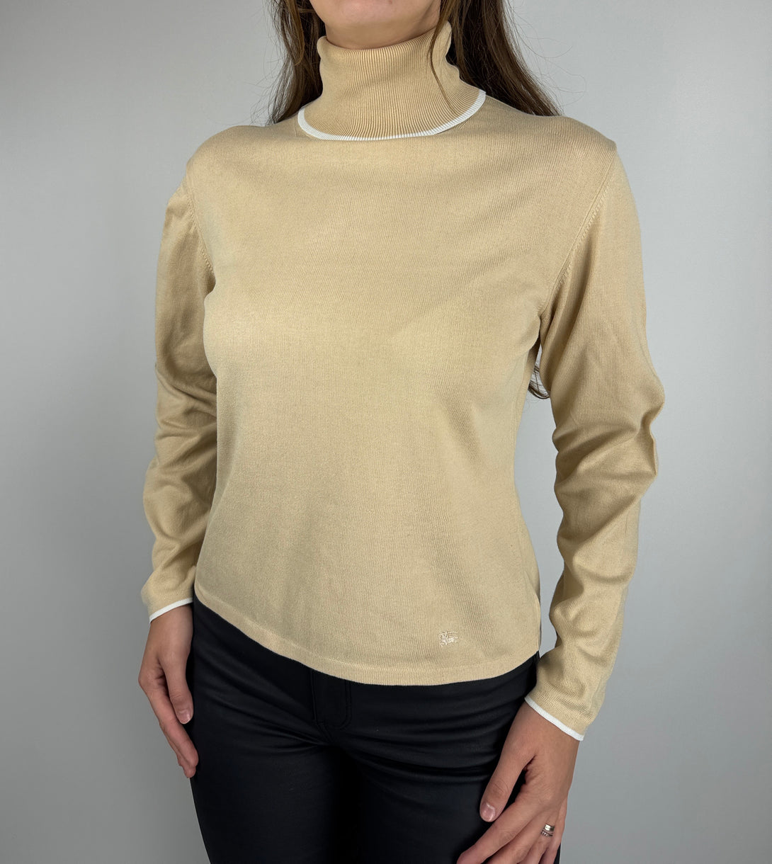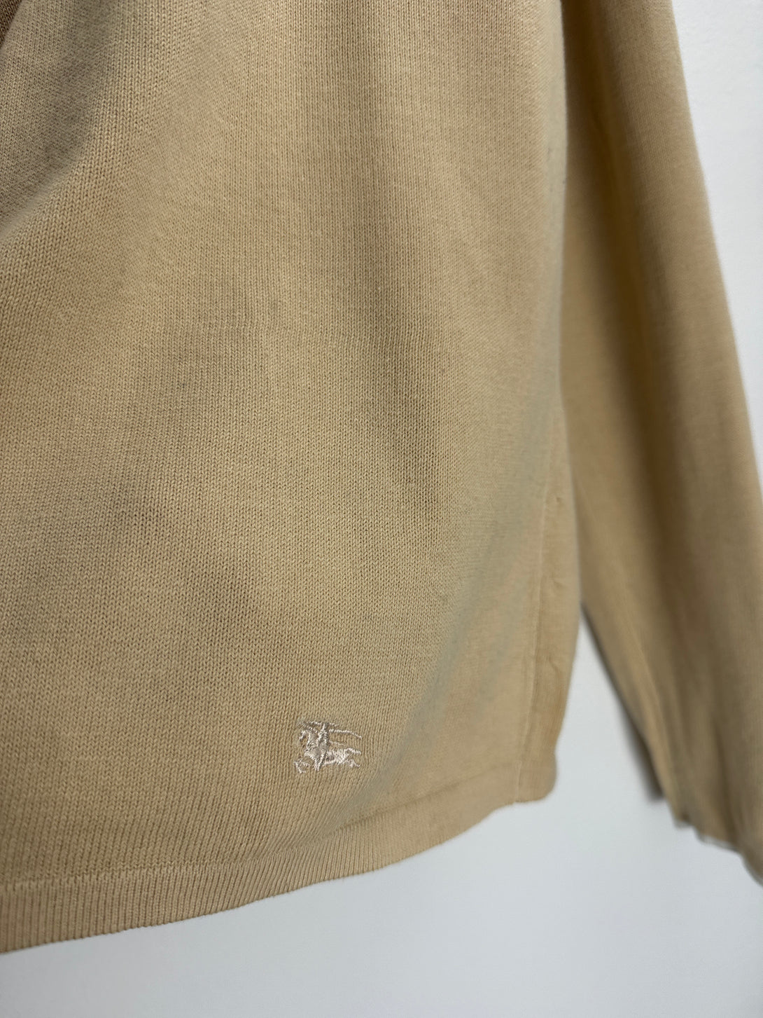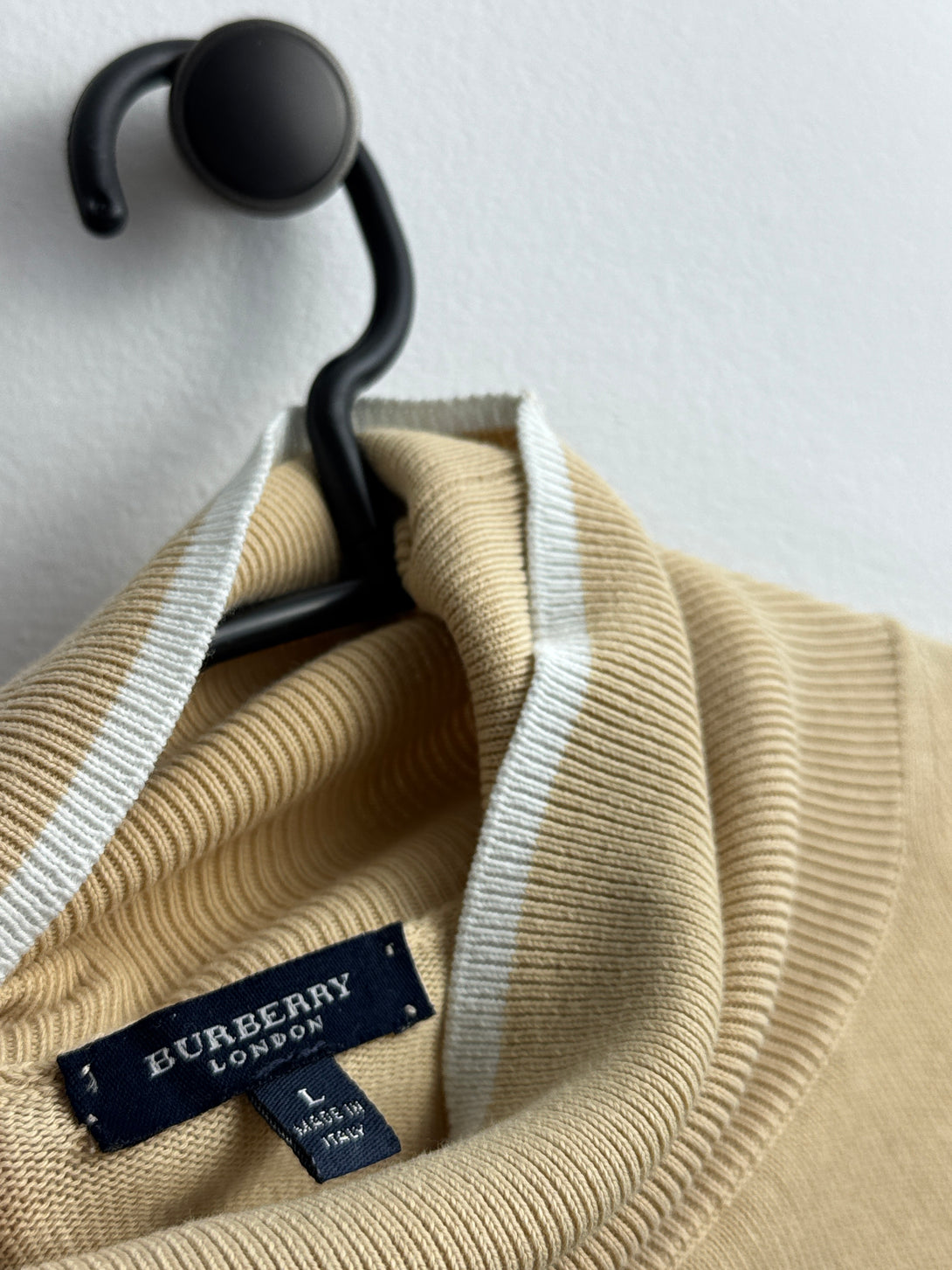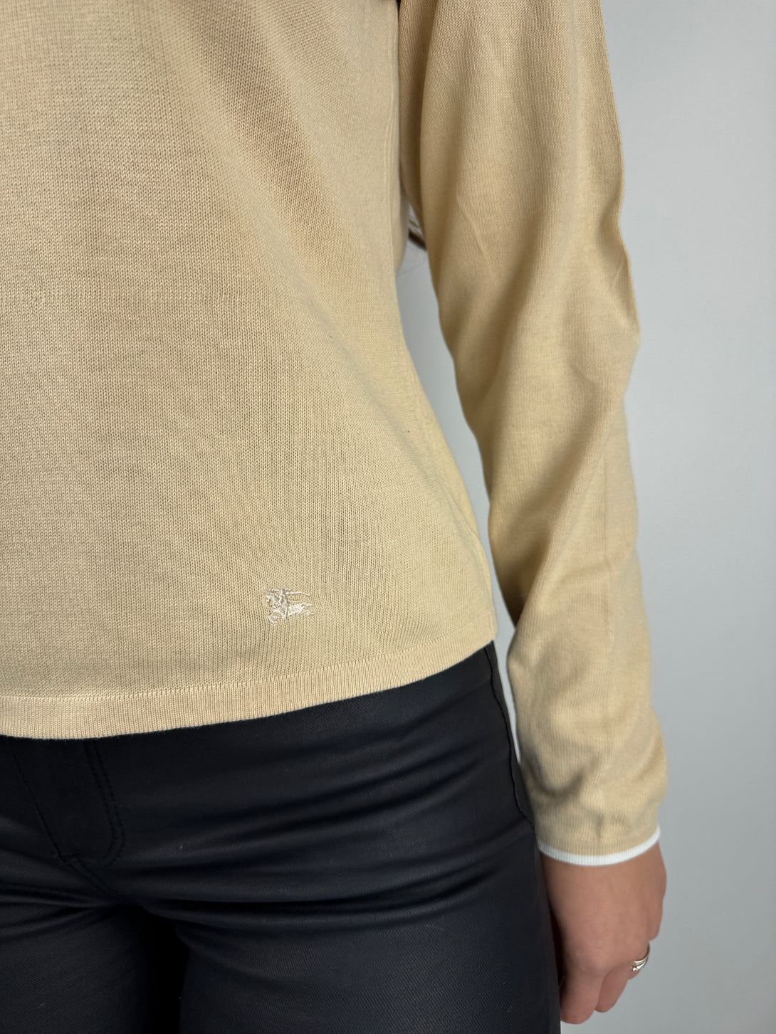 Pulover Burberry. Prezintă o țesătură fină de culoare bej (sau nisip), un mic logo ecvestru Burberry brodat în aceeași nuanță pe partea stângă jos și manșete albe contrastante.