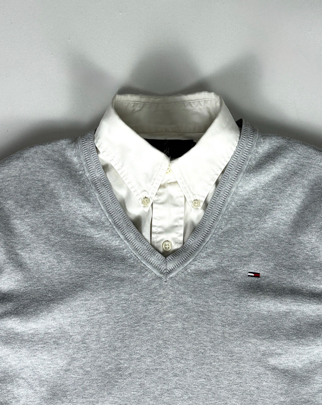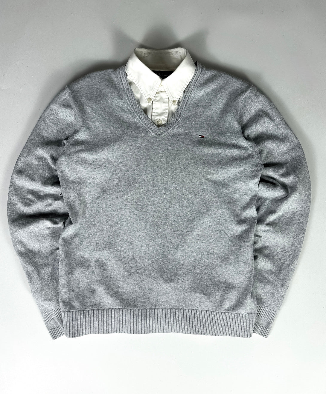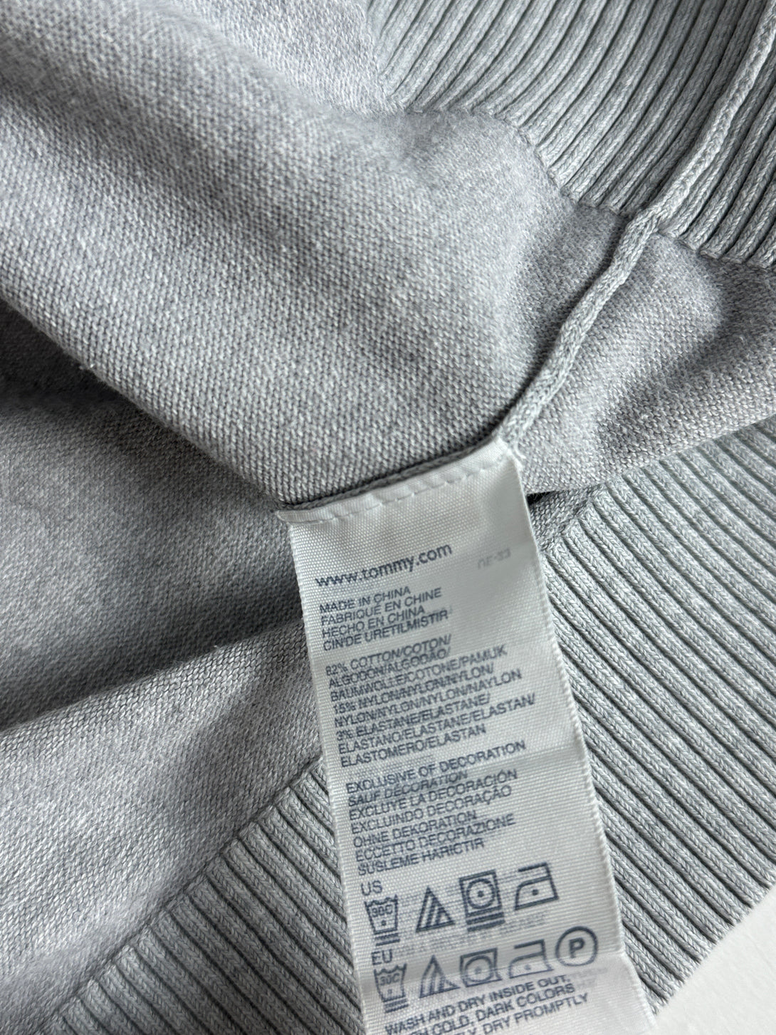 Tommy Hilfiger V-neck (cu decolteu în V) pentru bărbați, de culoare gri deschis, logo brodat, mărimea M, confecționat din 82% bumbac, 15% nylon, 3% elastan, material elastic (lungime 66cm, bust 54cm)