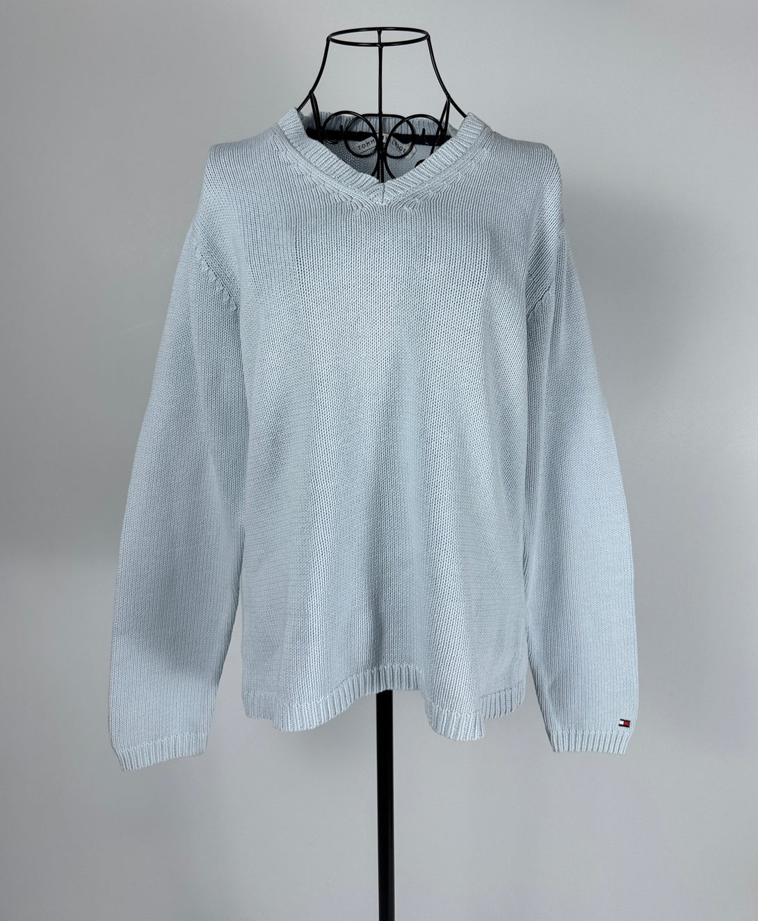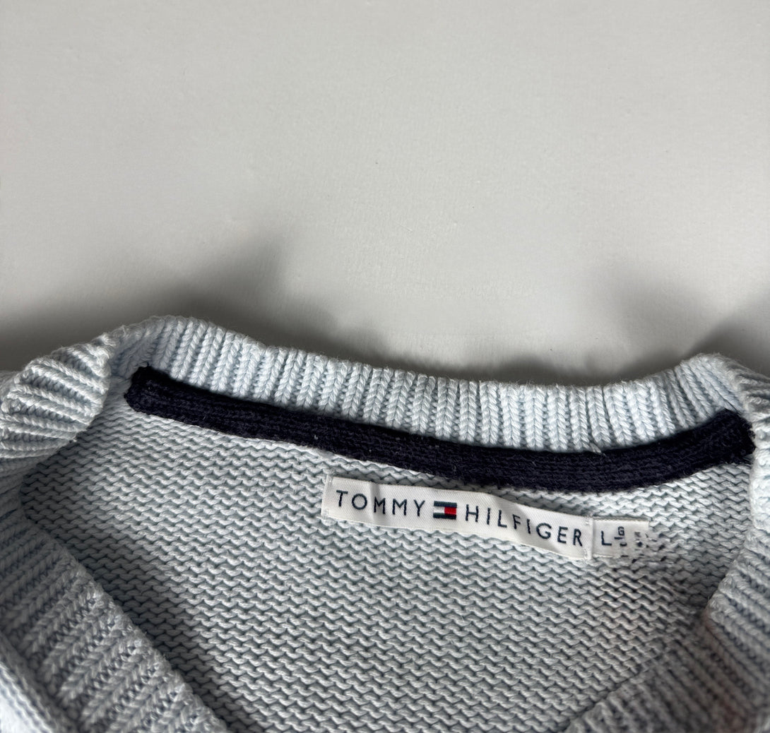 Pulover tricotate Tommy Hilfiger cu decolteu în V, albastru deschis. Prezintă logo-ul distinctiv al mărcii, steagul roșu, alb și albastru, brodat discret pe mânecă.