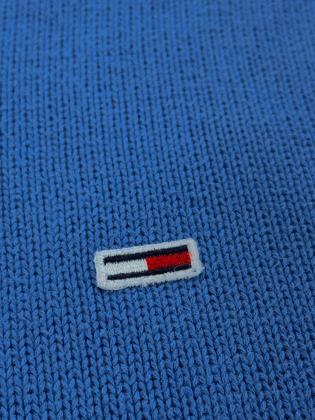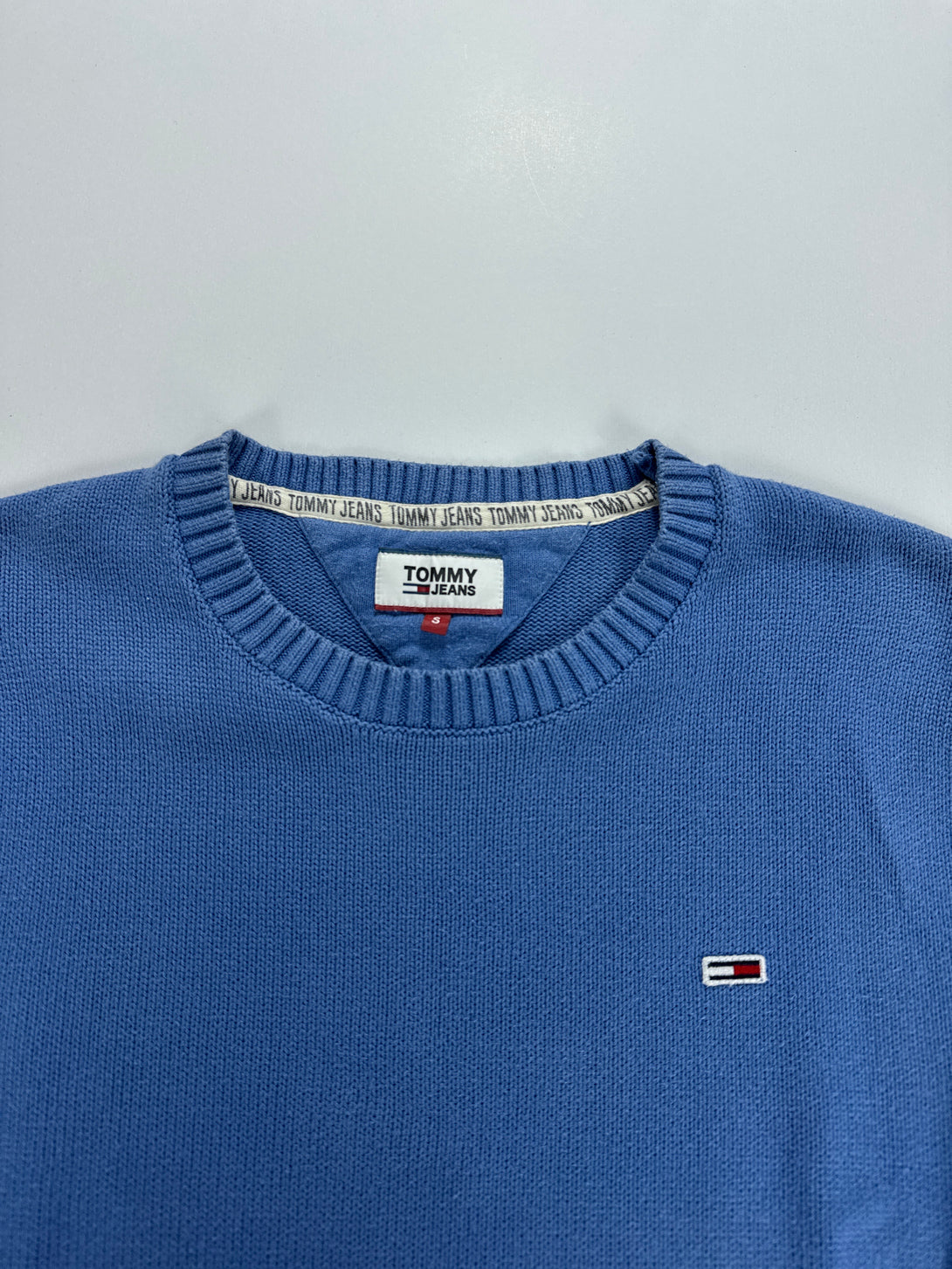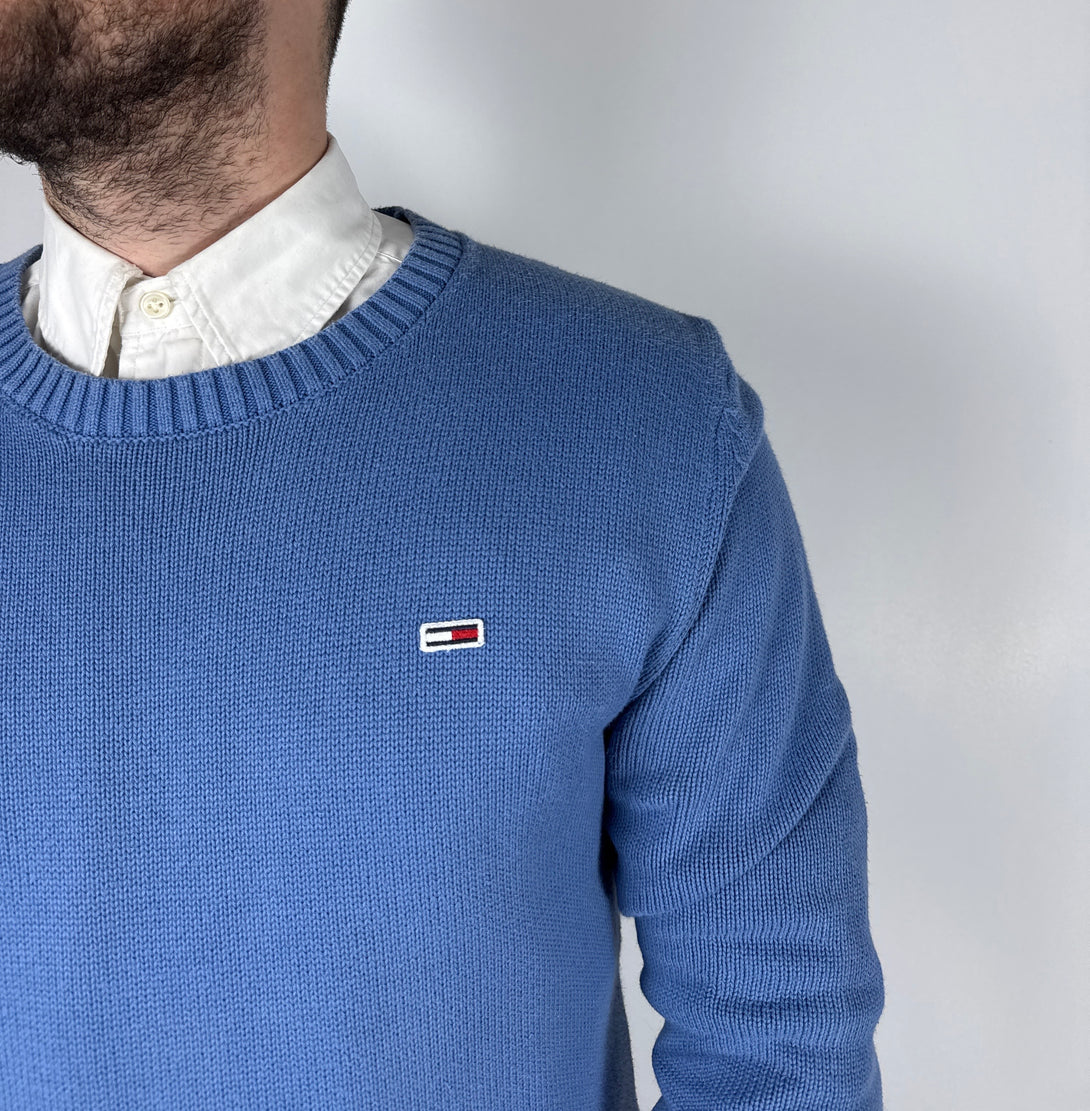 Pulover Tommy Jeans pentru bărbați, de culoare albastră, cu decolteu la baza gâtului. Este confecționat dintr-un material tricotat din bumbac, și prezintă un mic logo distinctiv Tommy Hilfiger pe piept.