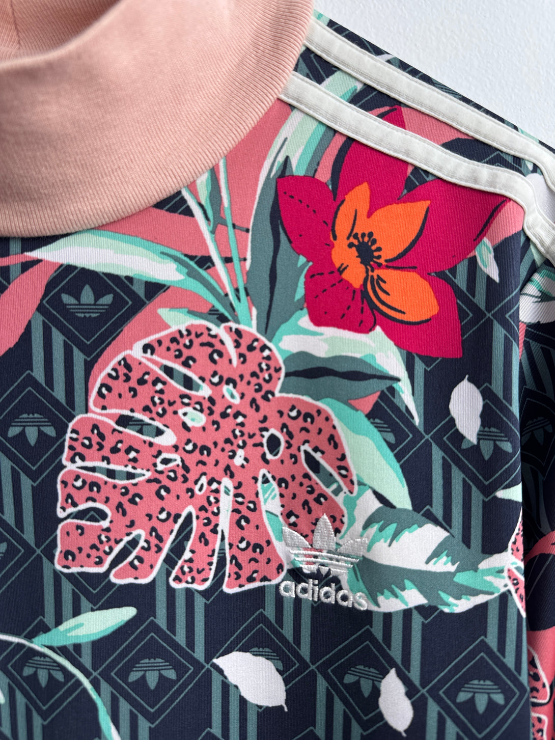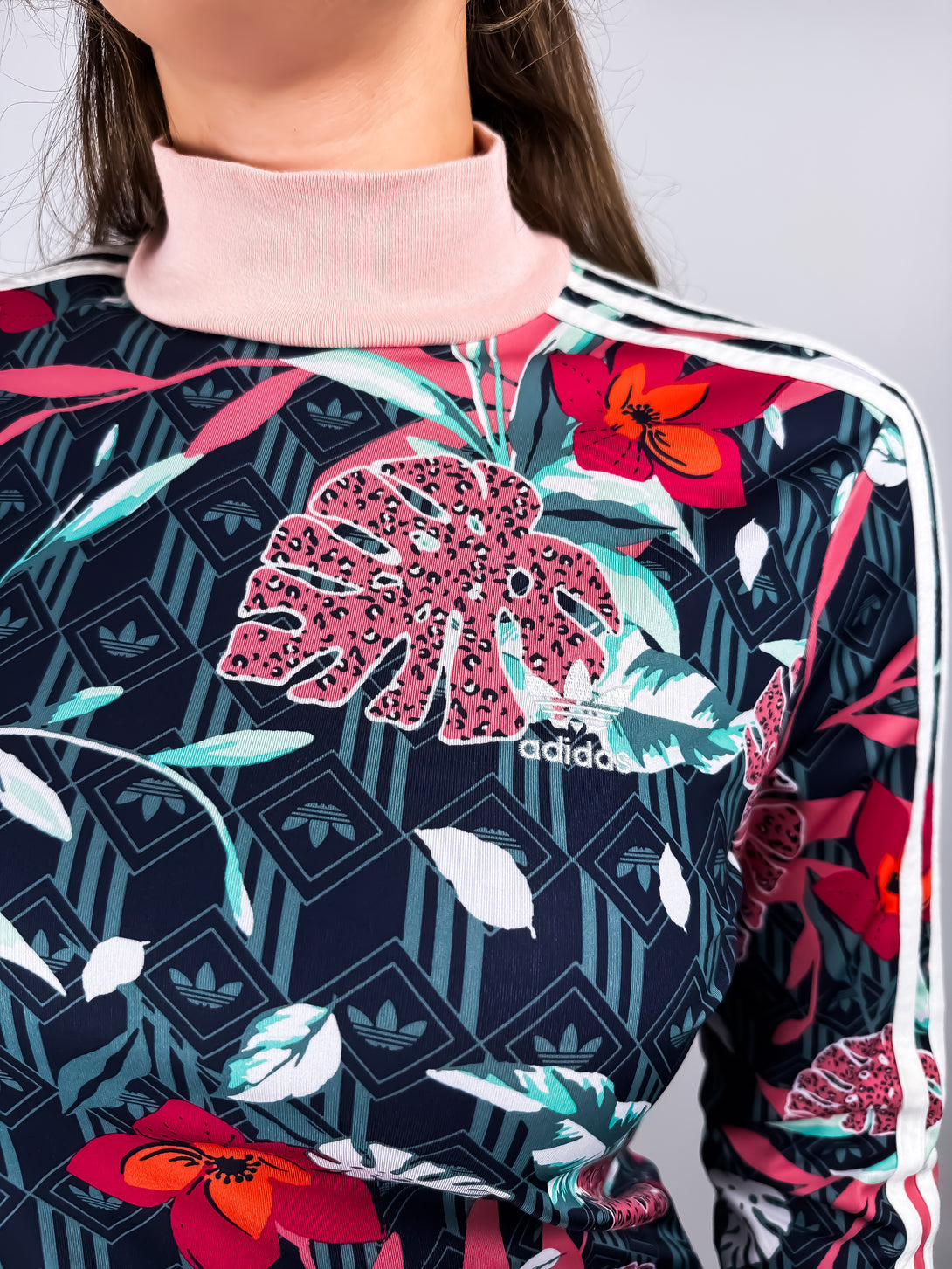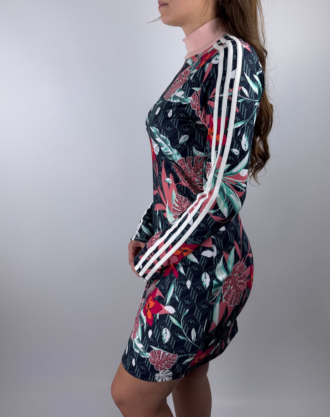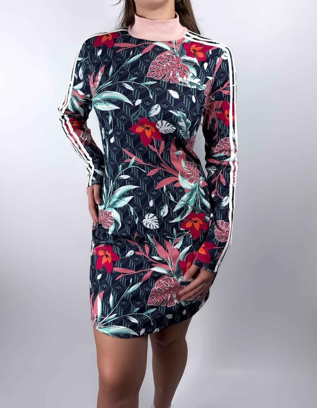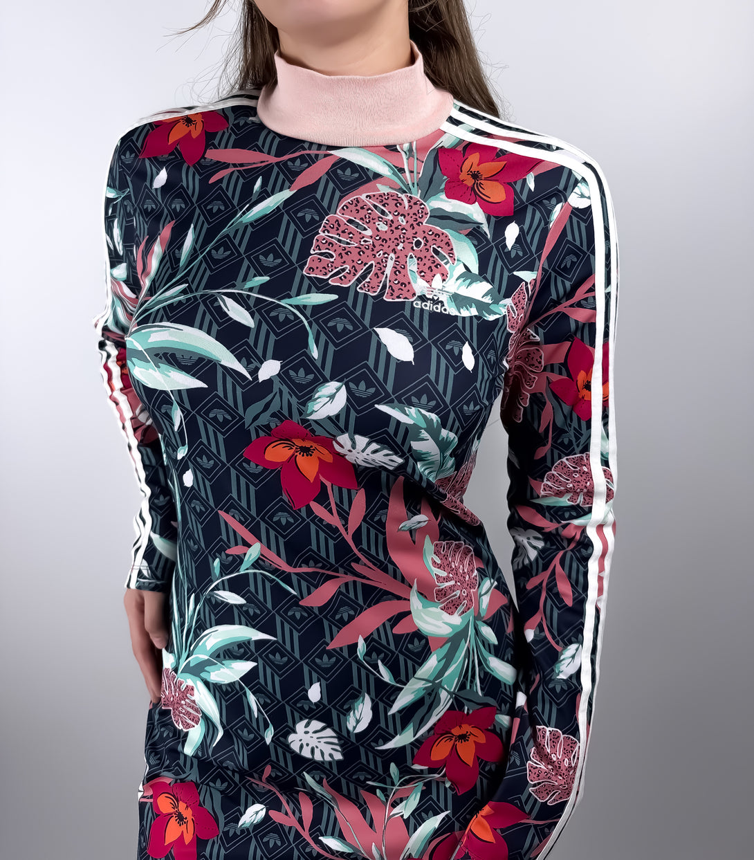 - Stil: Prezintă un guler înalt și cele trei dungi albe caracteristice Adidas pe mânecile lungi, o croială mulată pe corp (bodycon).