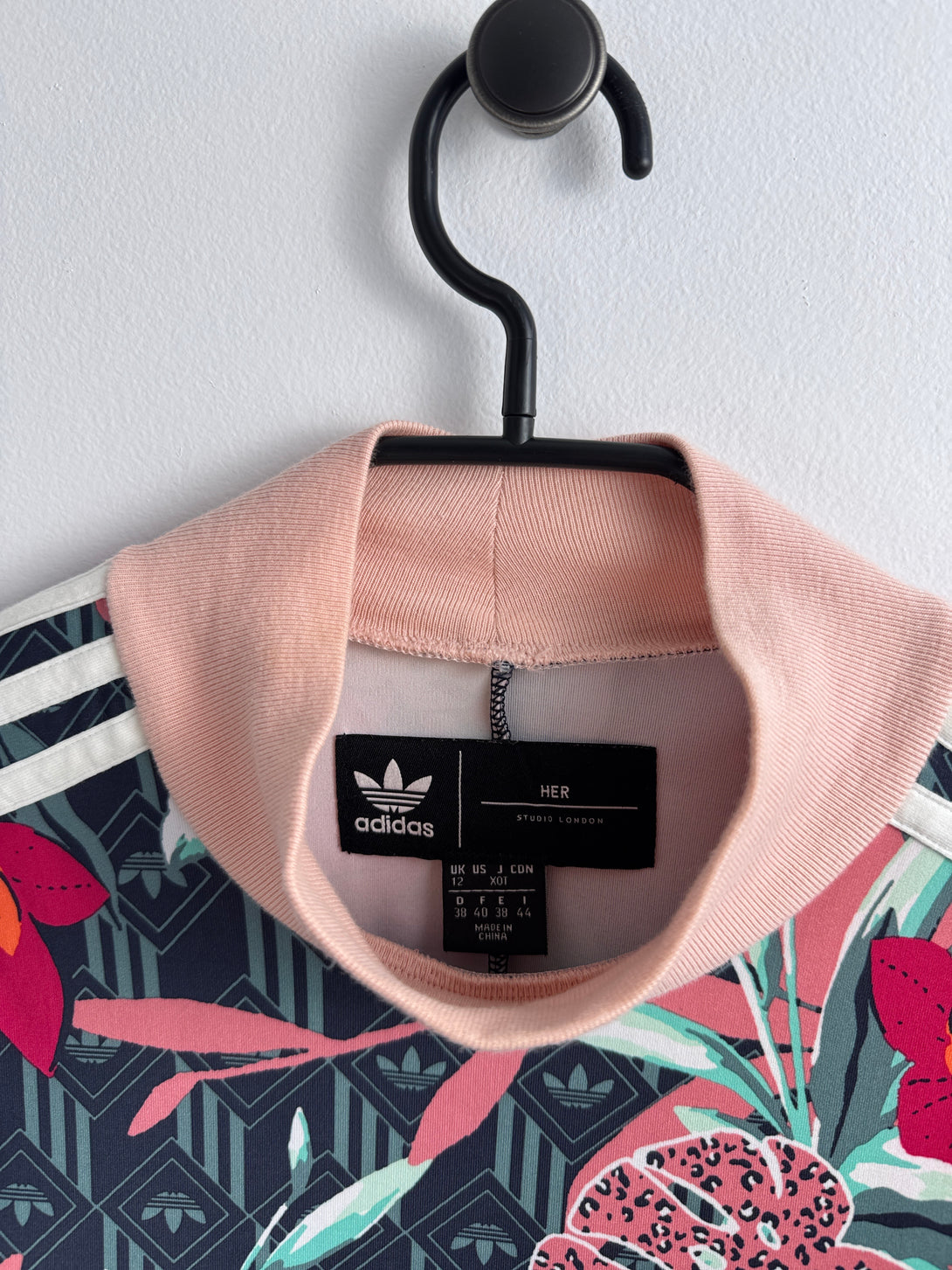 Aceasta este rochia Adidas HER Studio London, o colaborare vestimentară care combină stilul sportiv clasic cu imprimeuri florale vibrante.