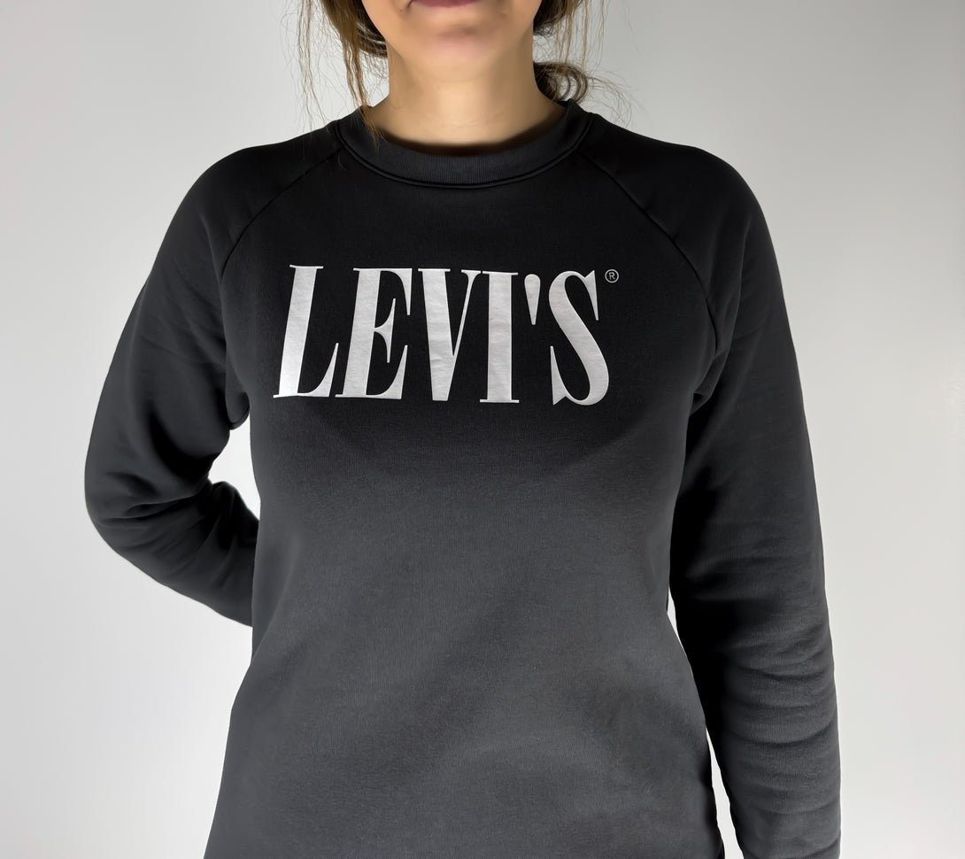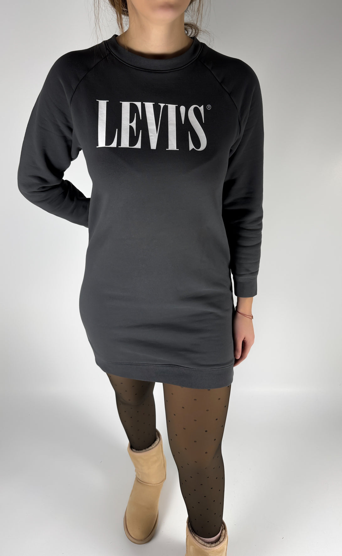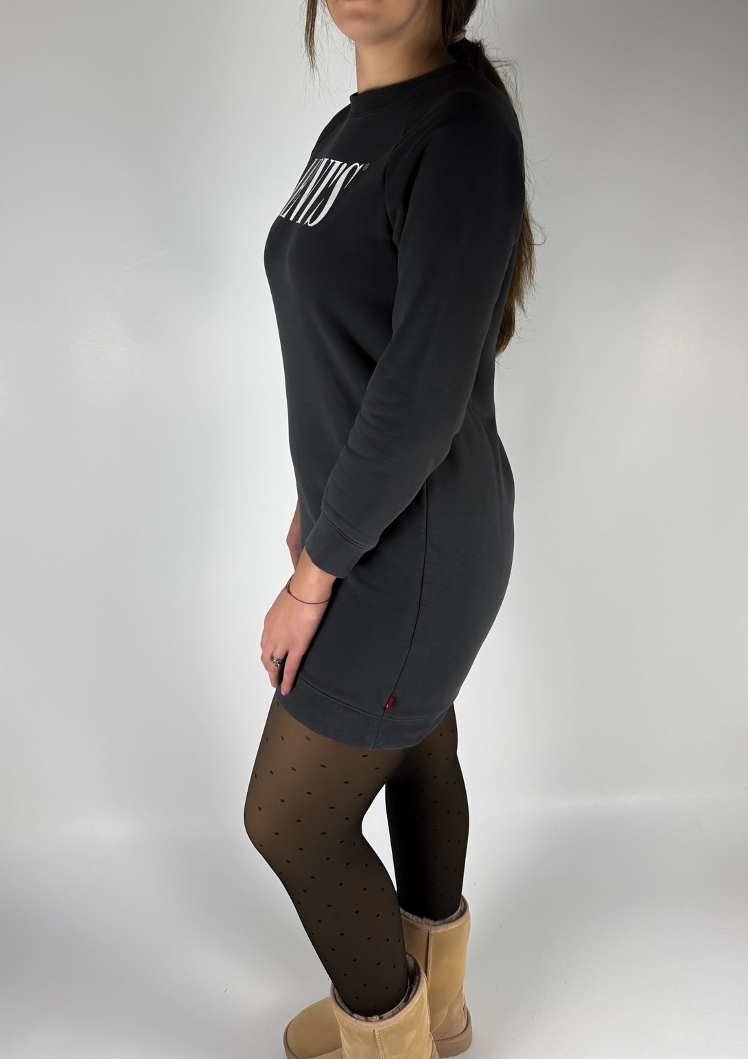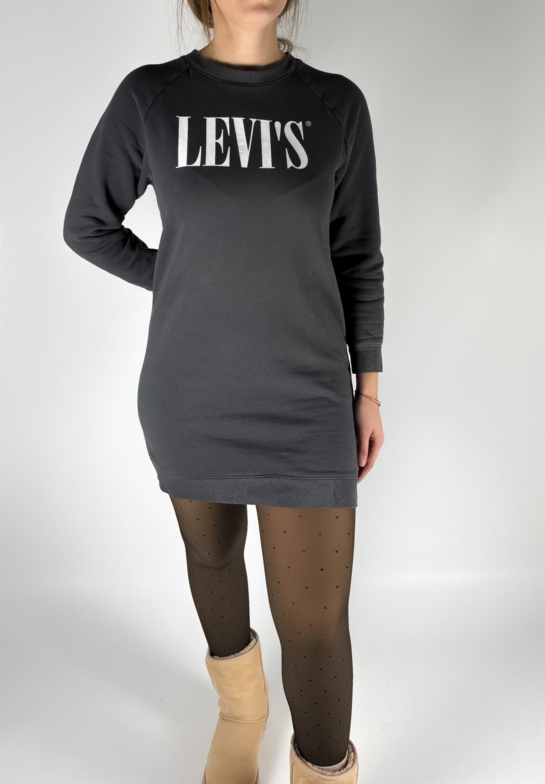 rochie tip hanorac (sweatshirt dress) Levi's de culoare gri închis, cu logo-ul mărcii imprimat pe piept. Rochia are un croi lejer, mâneci lungi raglan, decolteu rotund și este confecționată dintr-un amestec de bumbac și poliester.