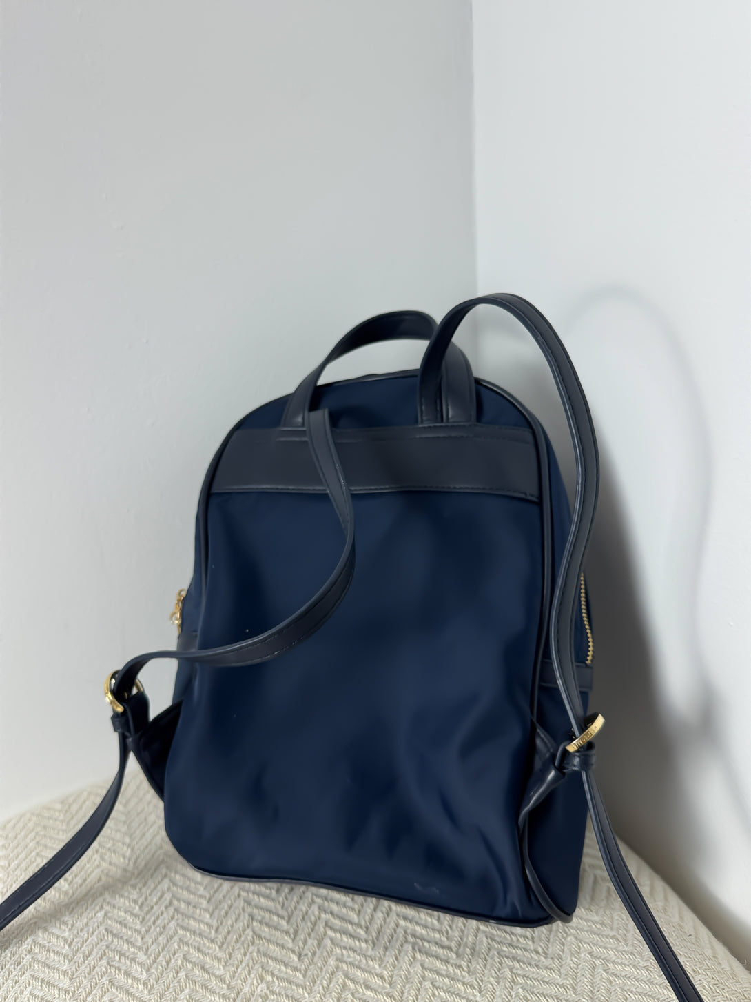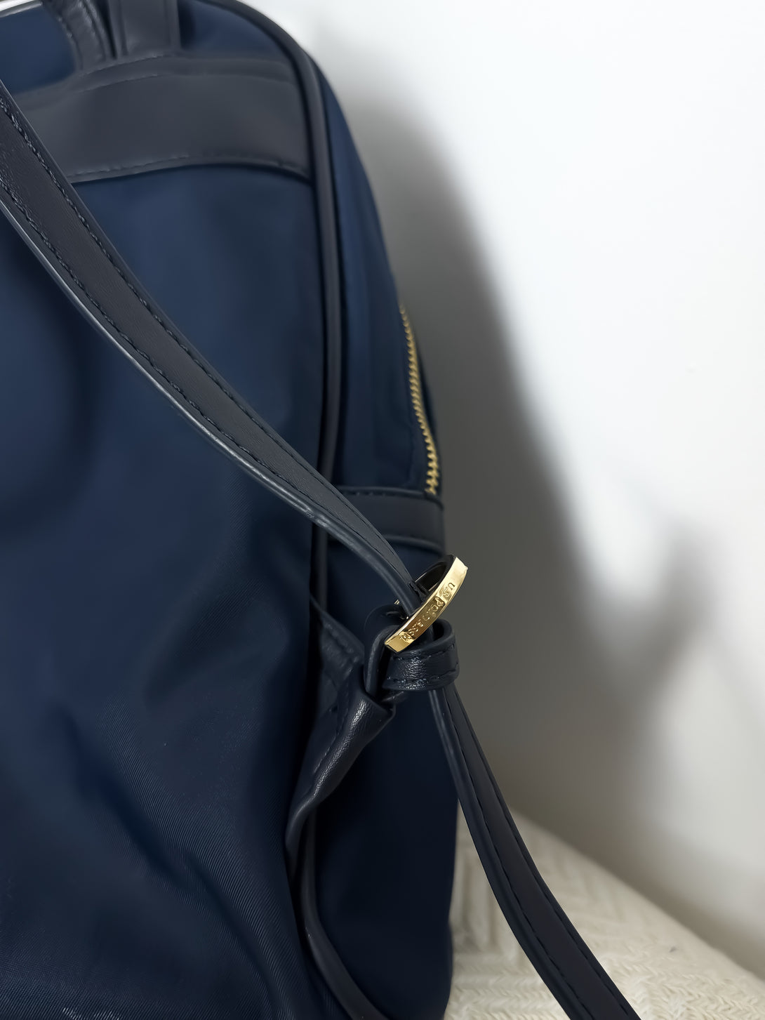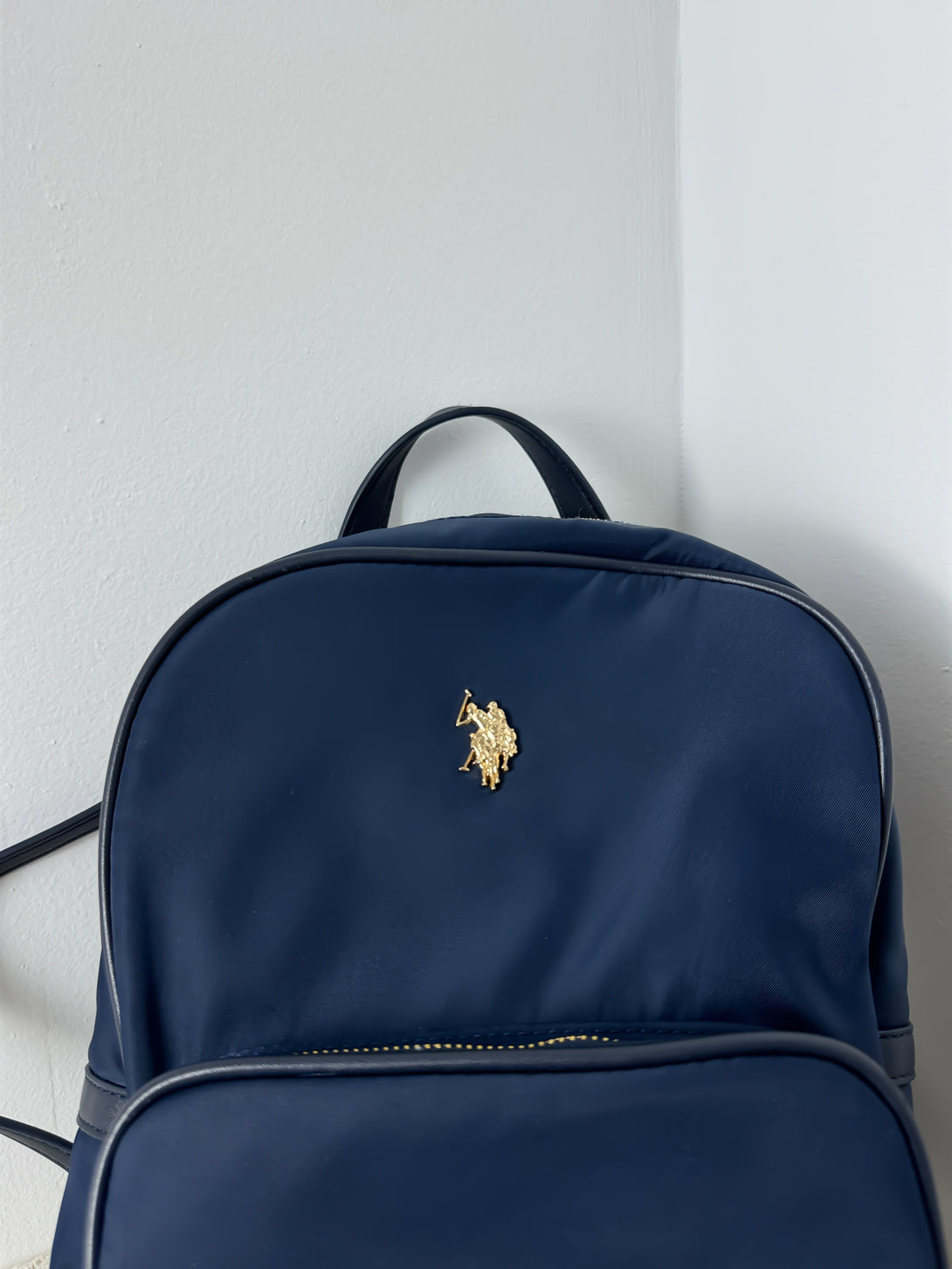 Rucsacul este un model Houston de la brandul U.S. Polo Assn.. Este confecționat dintr-un amestec de material textil (nailon) și poliuretan, având o textură netedă și lucioasă. Culoarea predominantă este albastru marin (navy blue), completată de accente metalice aurii și logo-ul distinctiv al mărcii pe partea frontală.