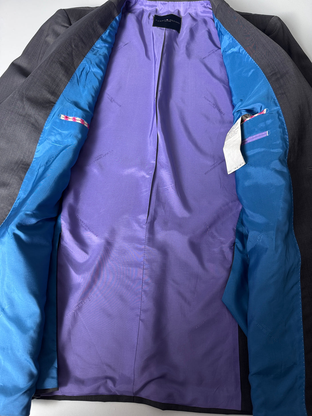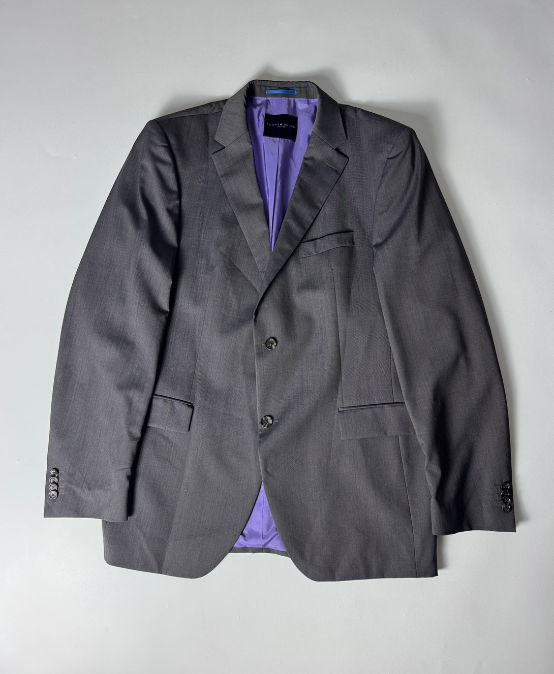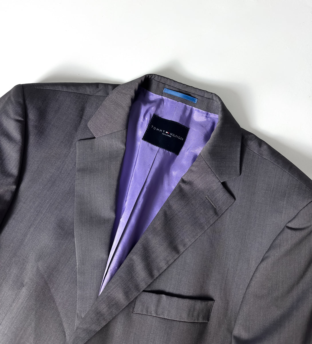 Acesta este un sacou Tommy Hilfiger gri, cu căptușeală mov/albastru vibrantă.