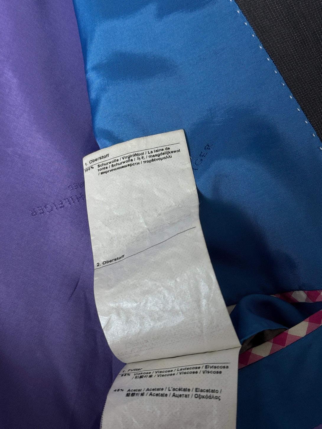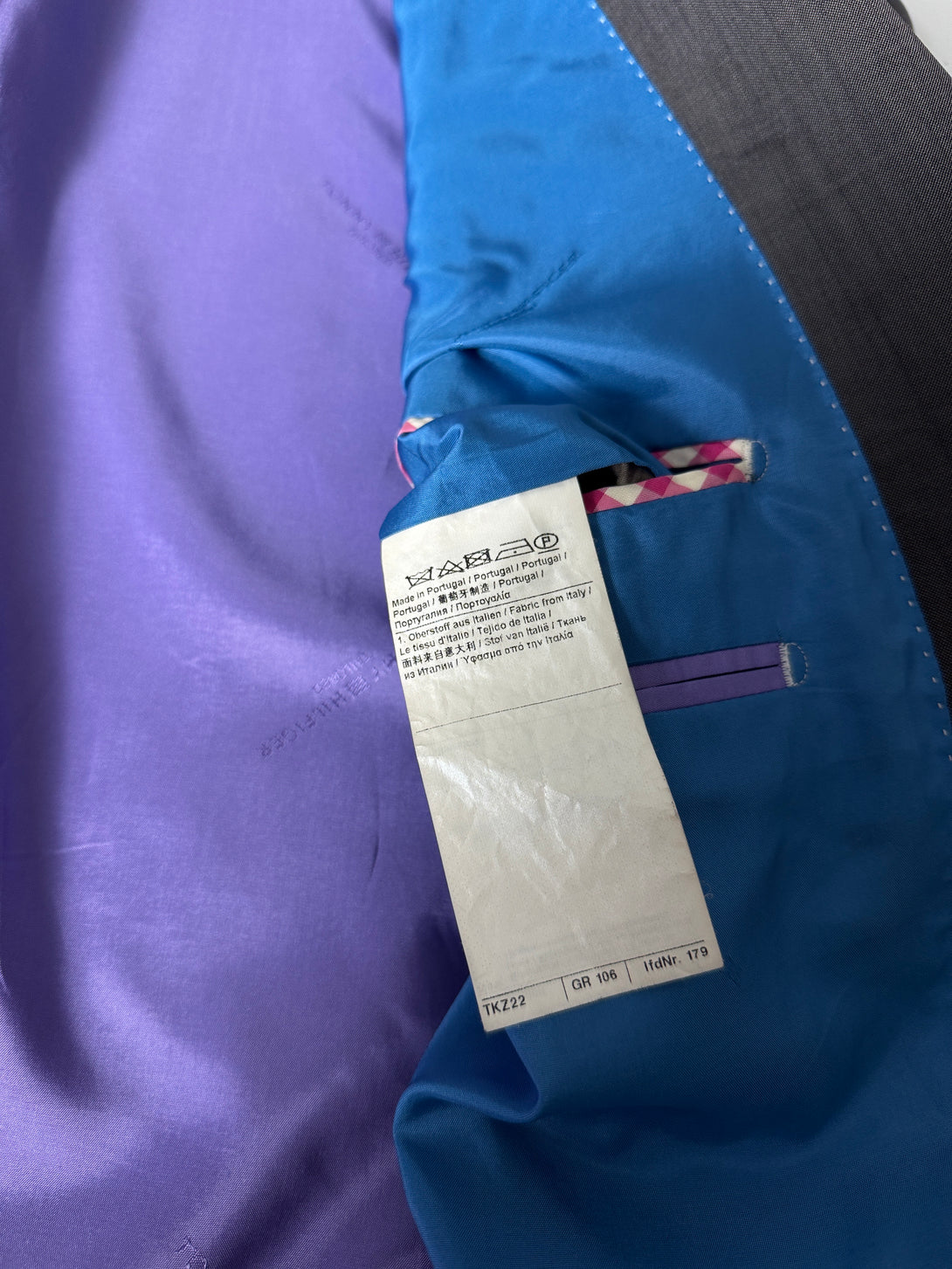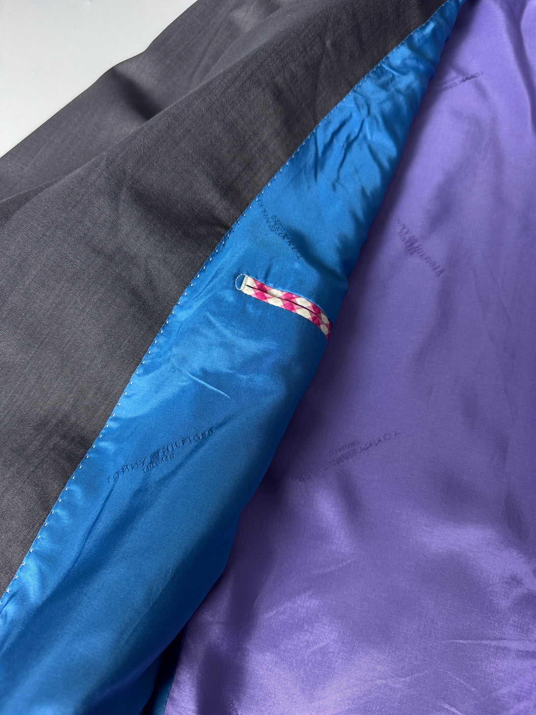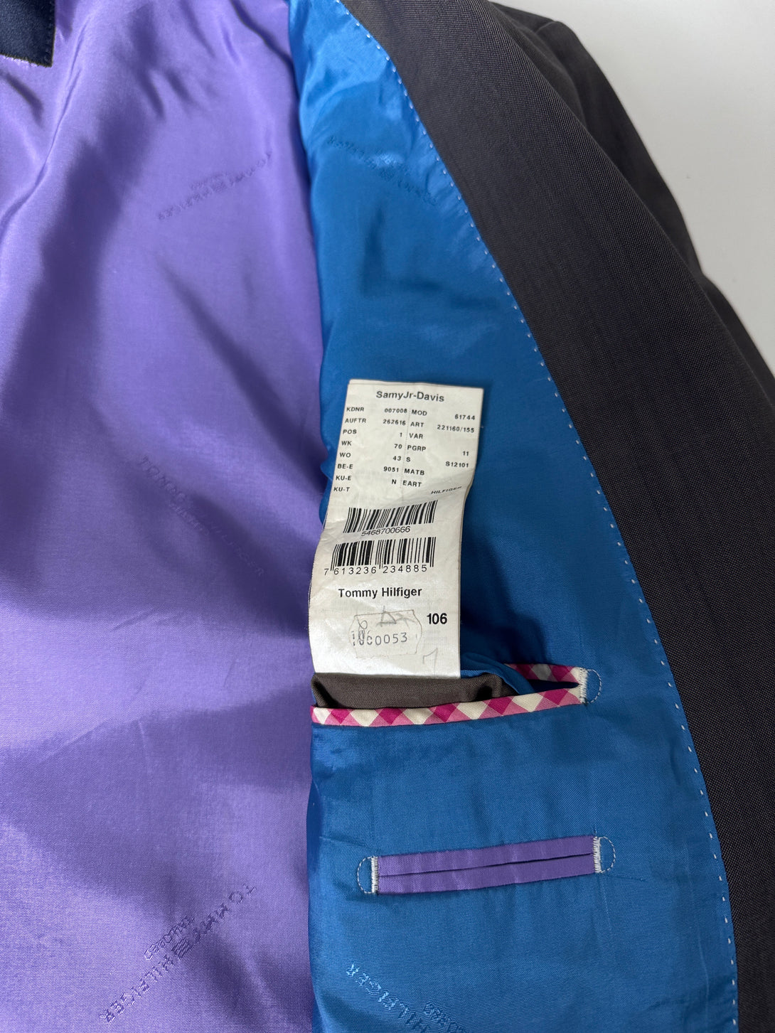 Acesta este un sacou Tommy Hilfiger gri, cu căptușeală mov/albastru vibrantă.
