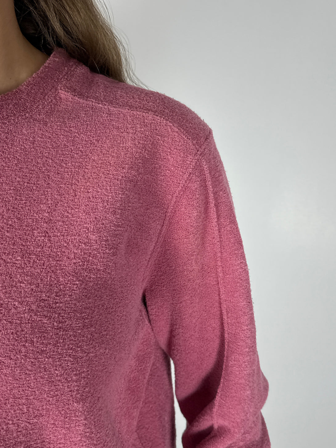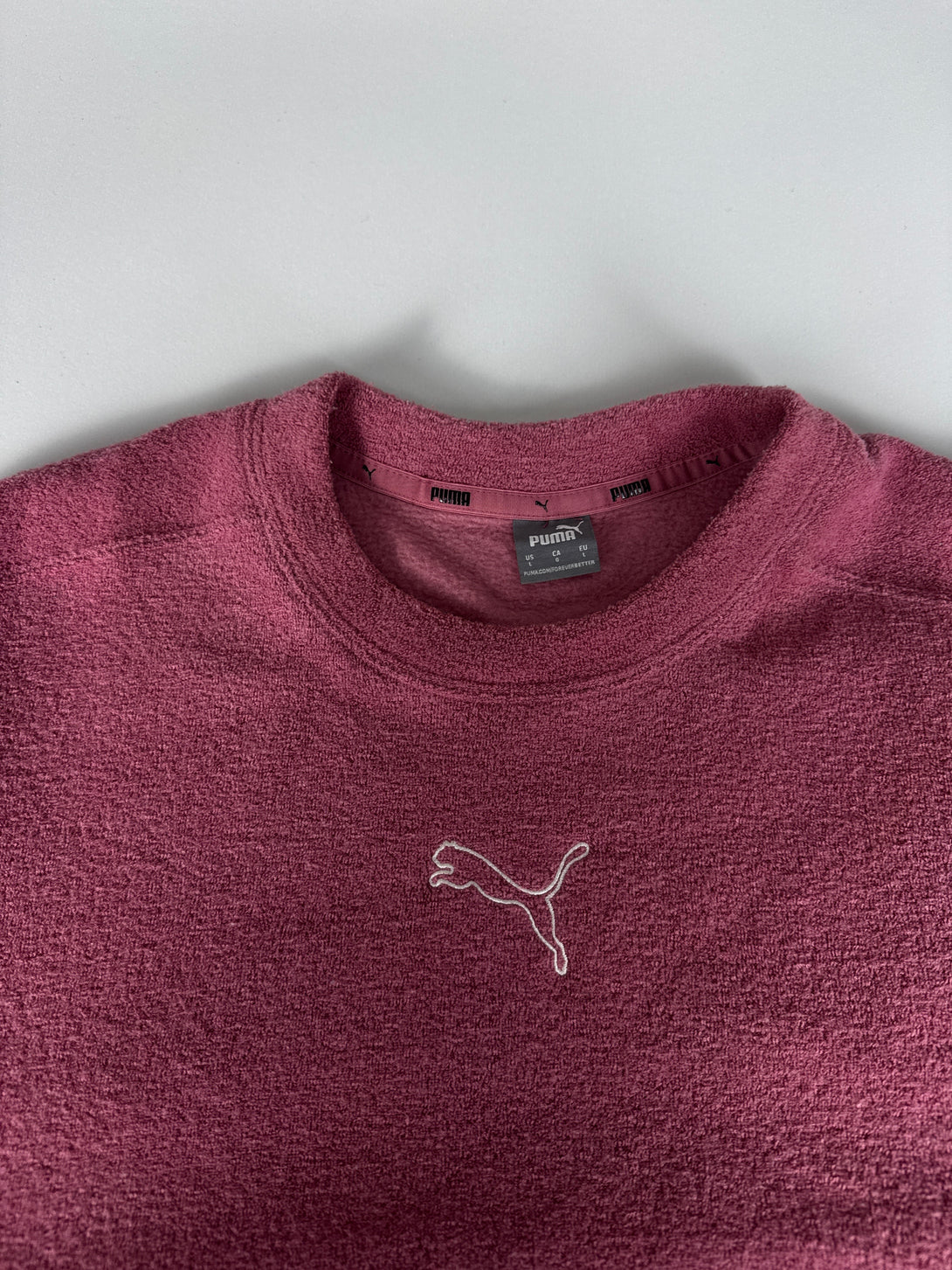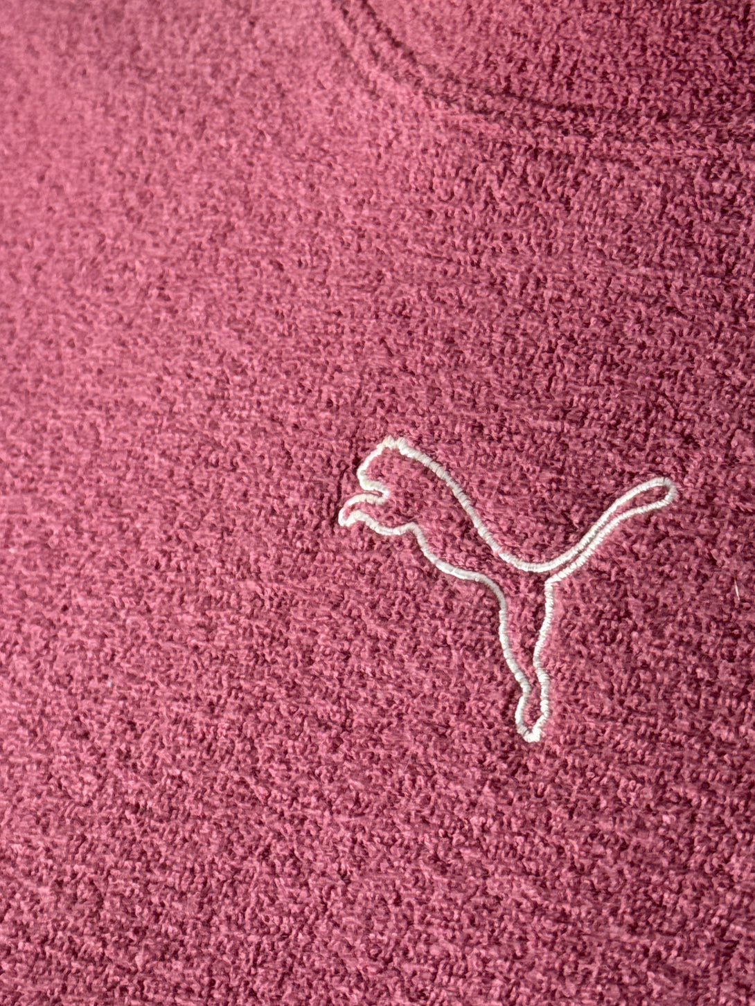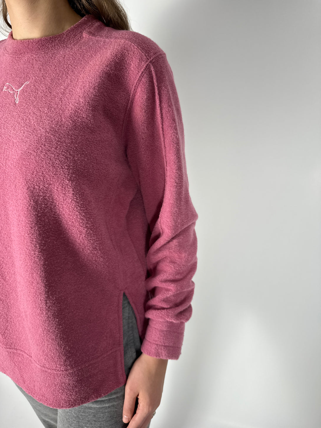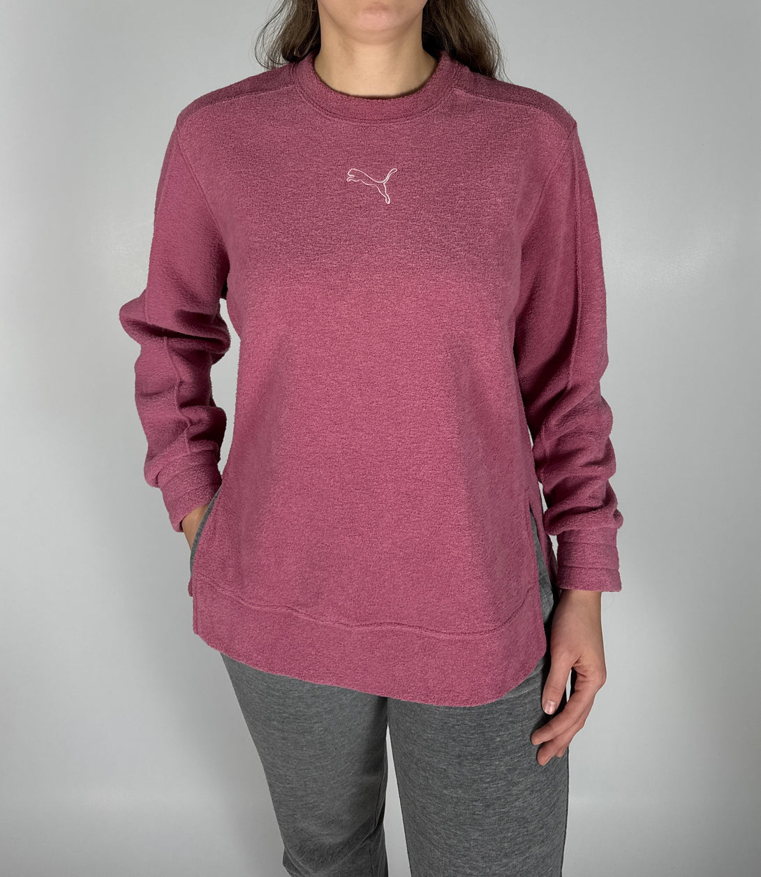 Acesta este un hanorac de damă Puma Her Winterized Crew, de culoare orhidee prăfuită (dusty orchid) sau magenta, cu o croială lejeră și un logo mic brodat pe piept. Este confecționat dintr-un amestec de bumbac și poliester, având o textură moale de fleece sau jerseu French Terry