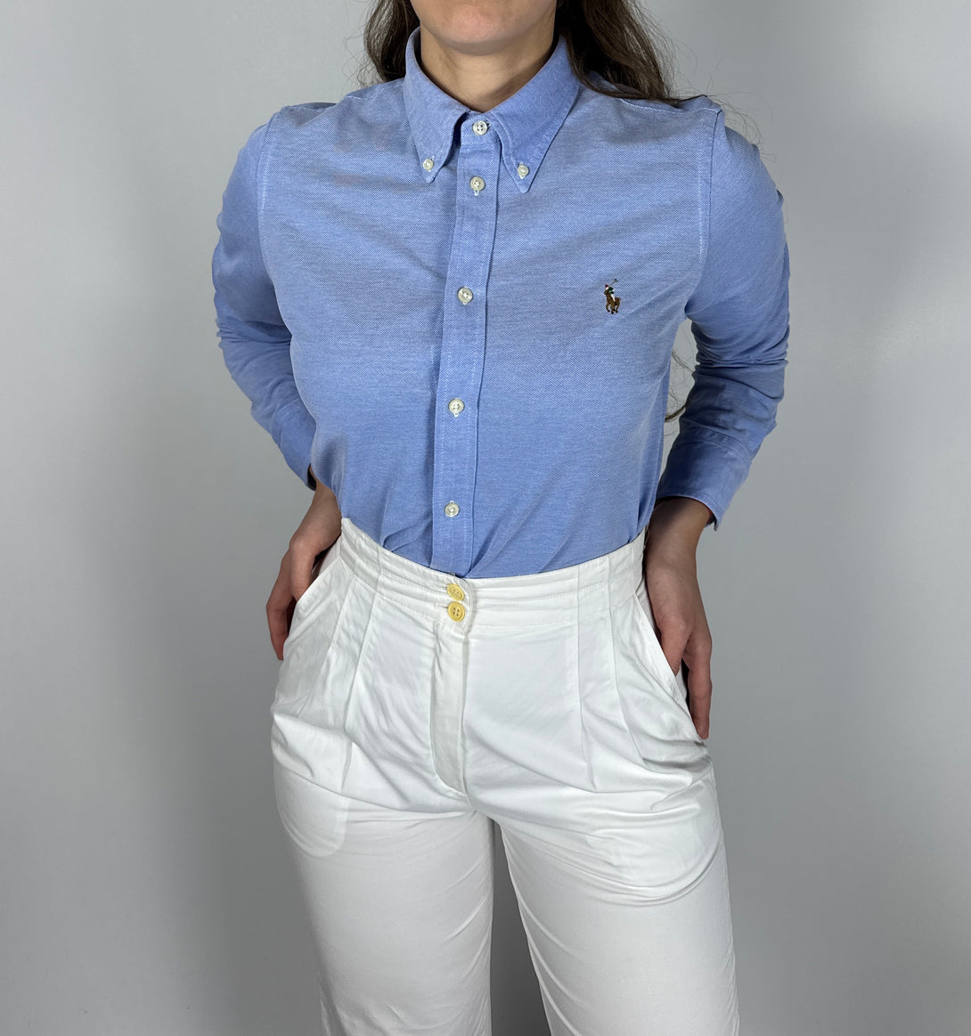 - Detalii: Prezintă guler cu nasturi (button-down) și manșete cu nasturi