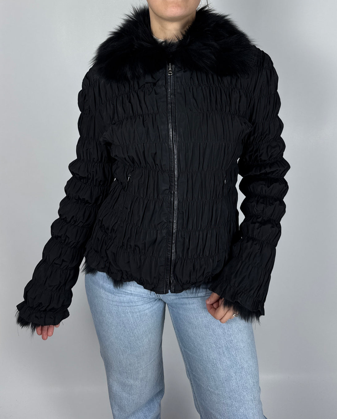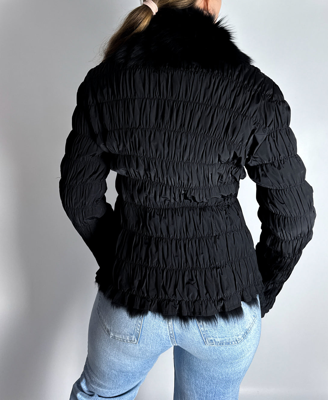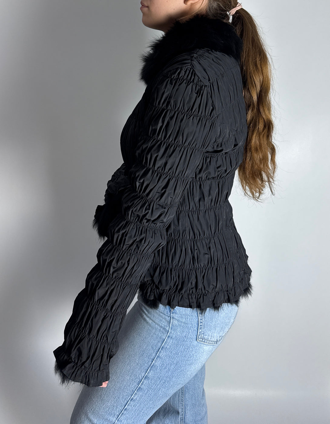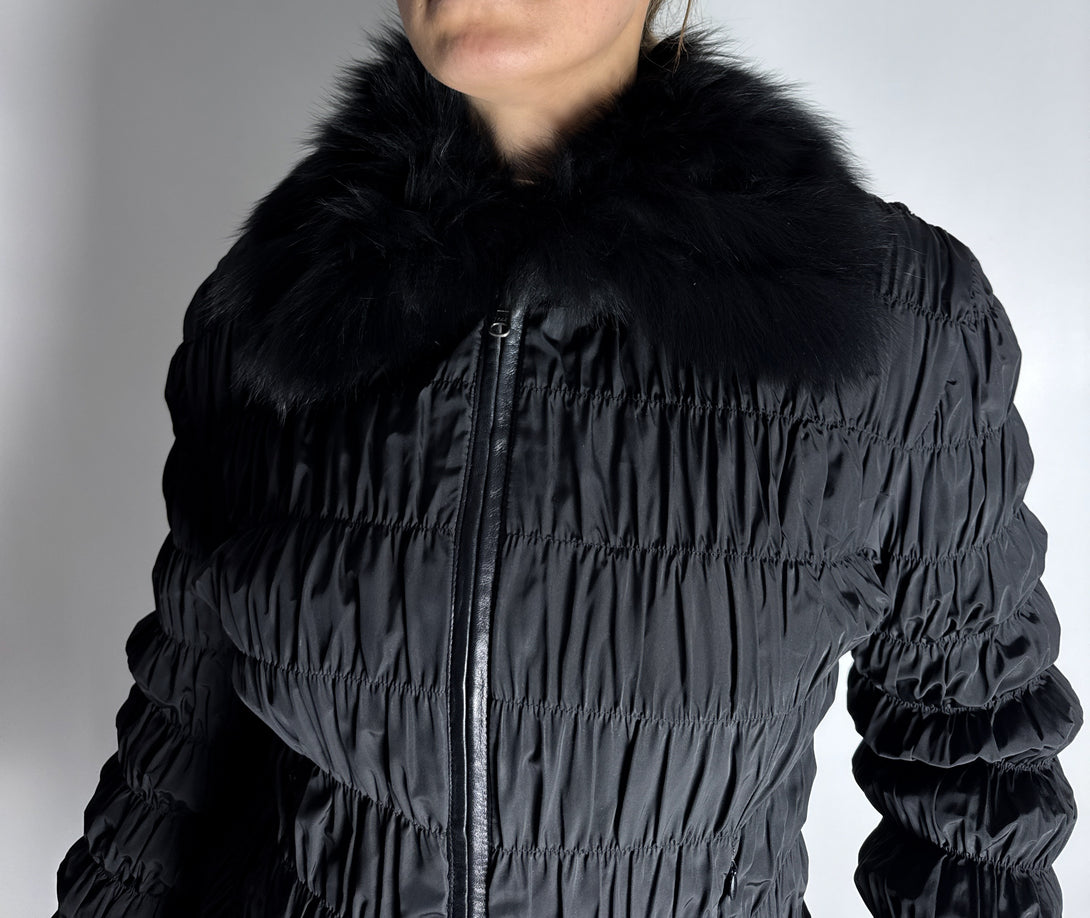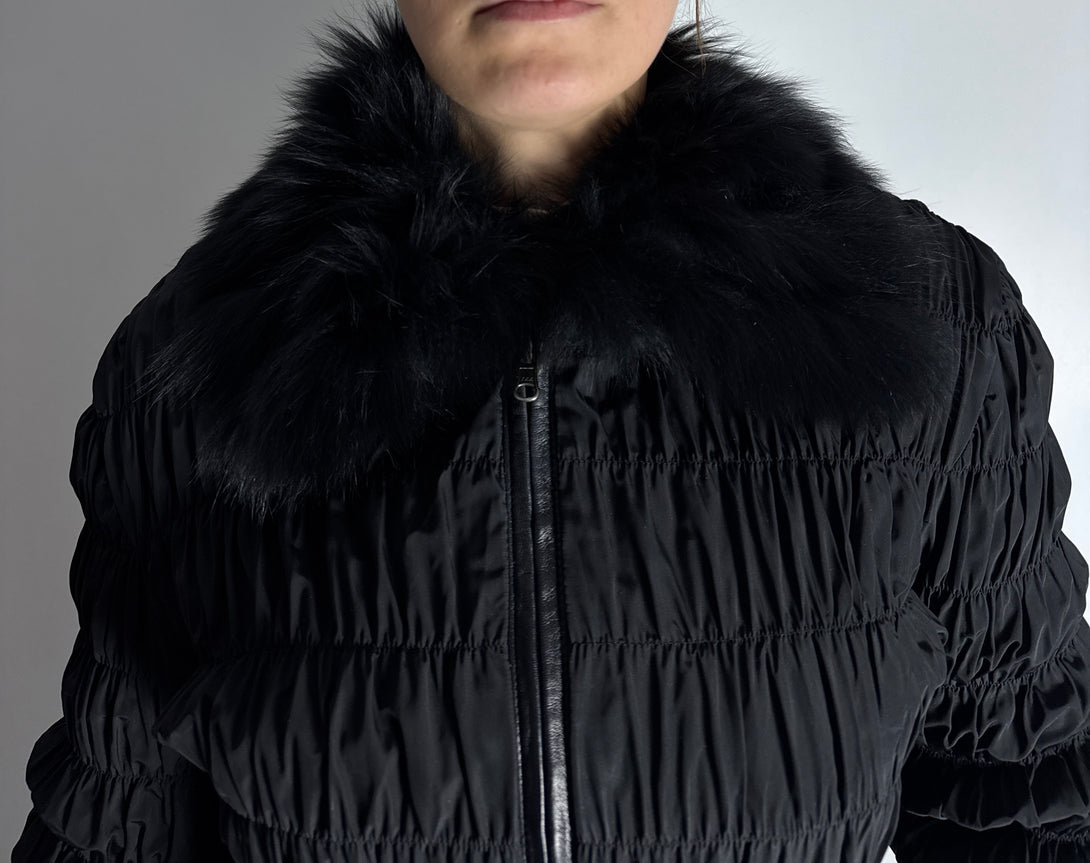 - Detalii din blană: Gulerul, manșetele si interiorul sunt împodobite cu blană neagră pufoasă.