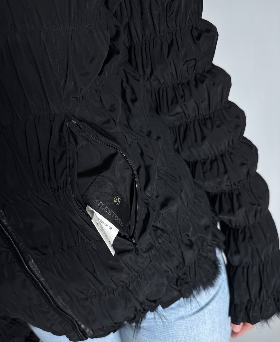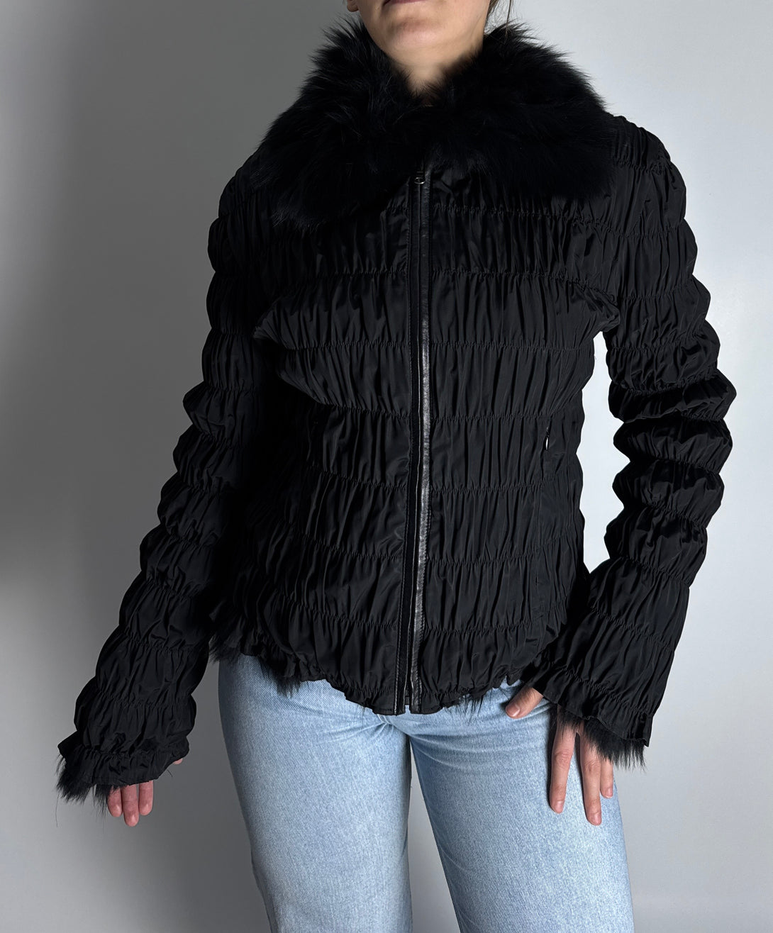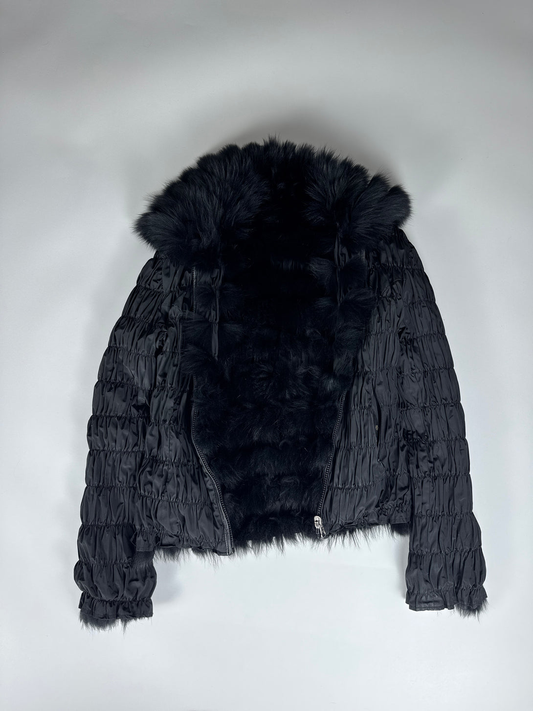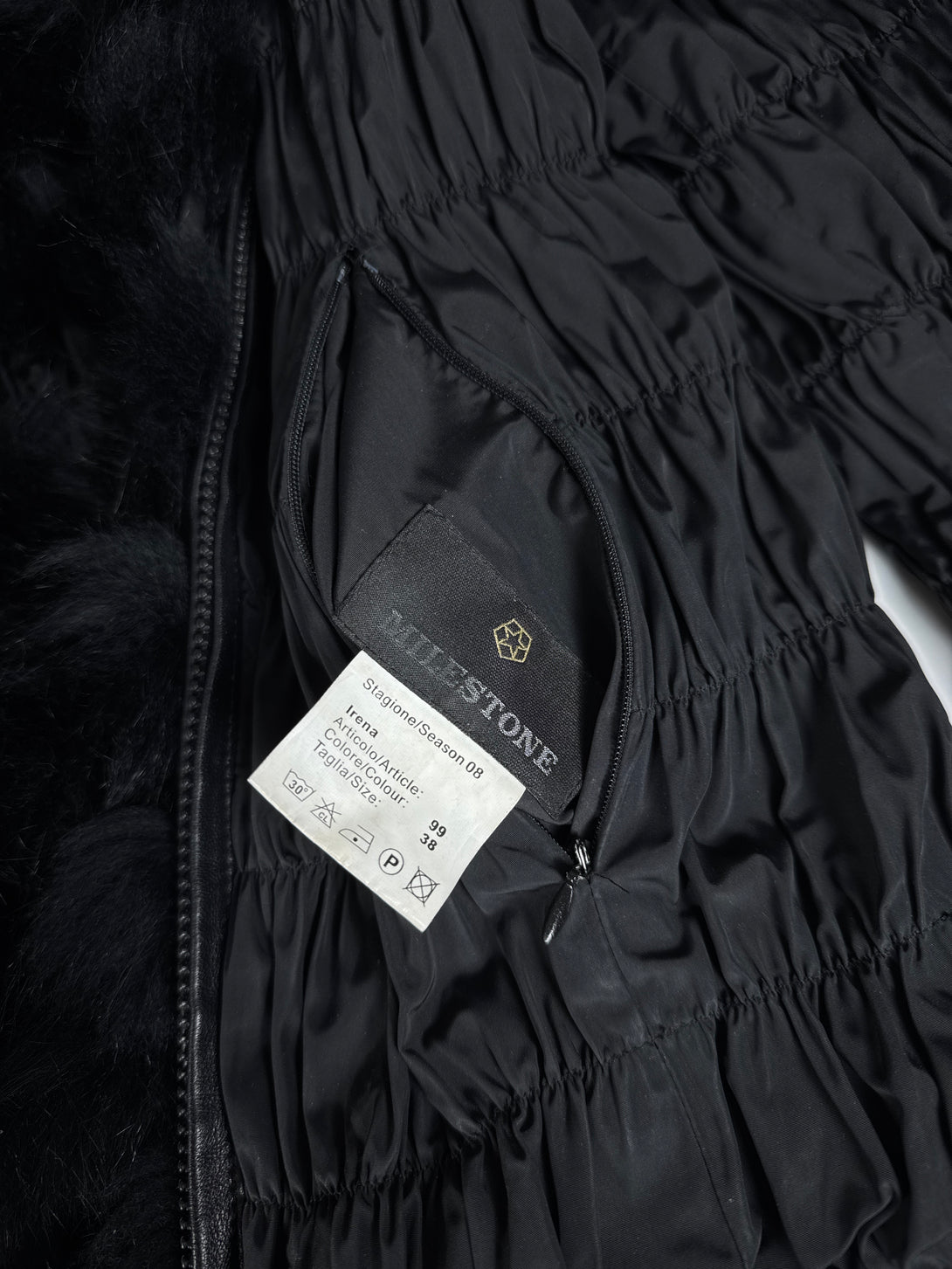 - Detalii din blană: Gulerul, manșetele si interiorul sunt împodobite cu blană neagră pufoasă.