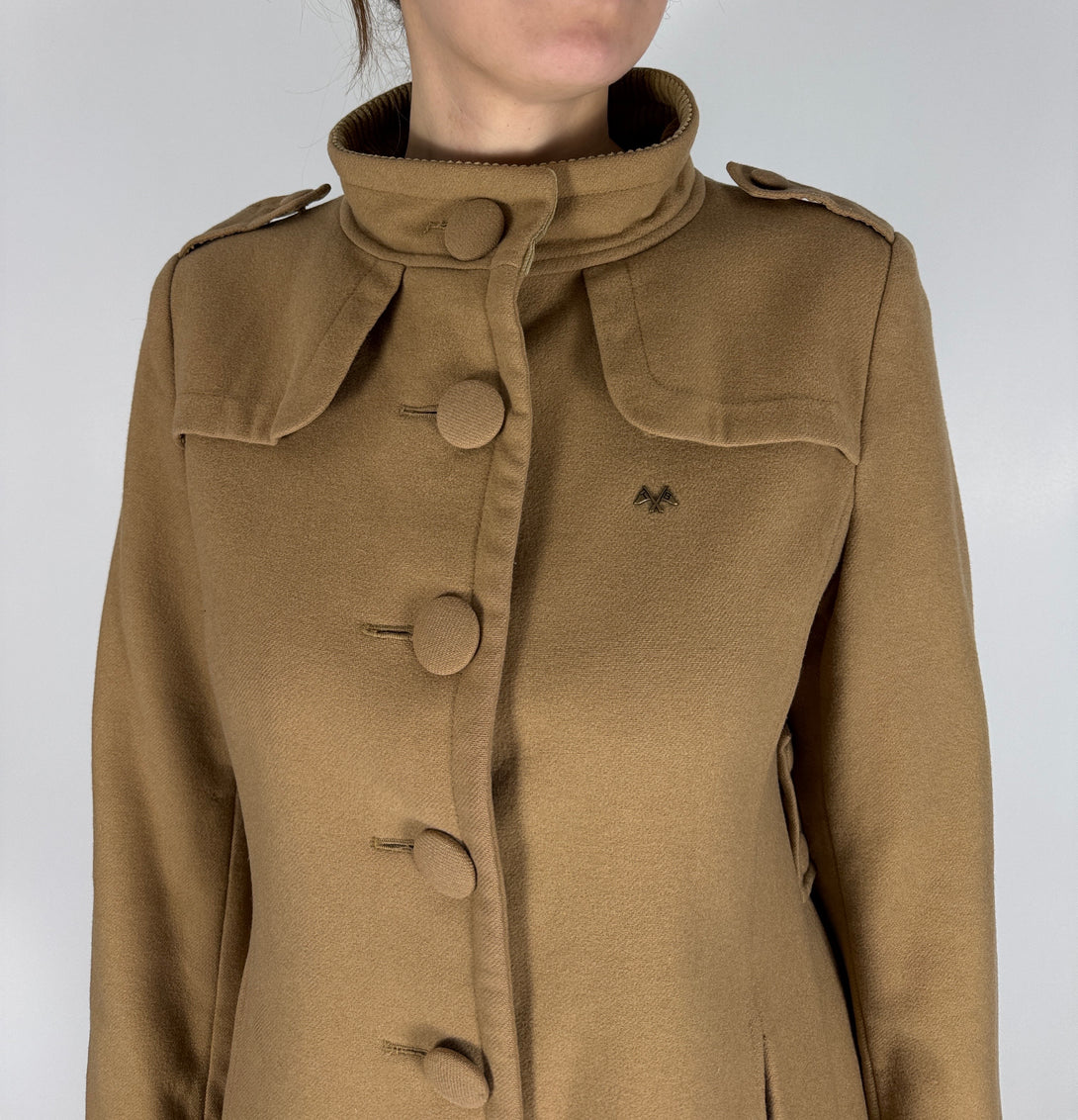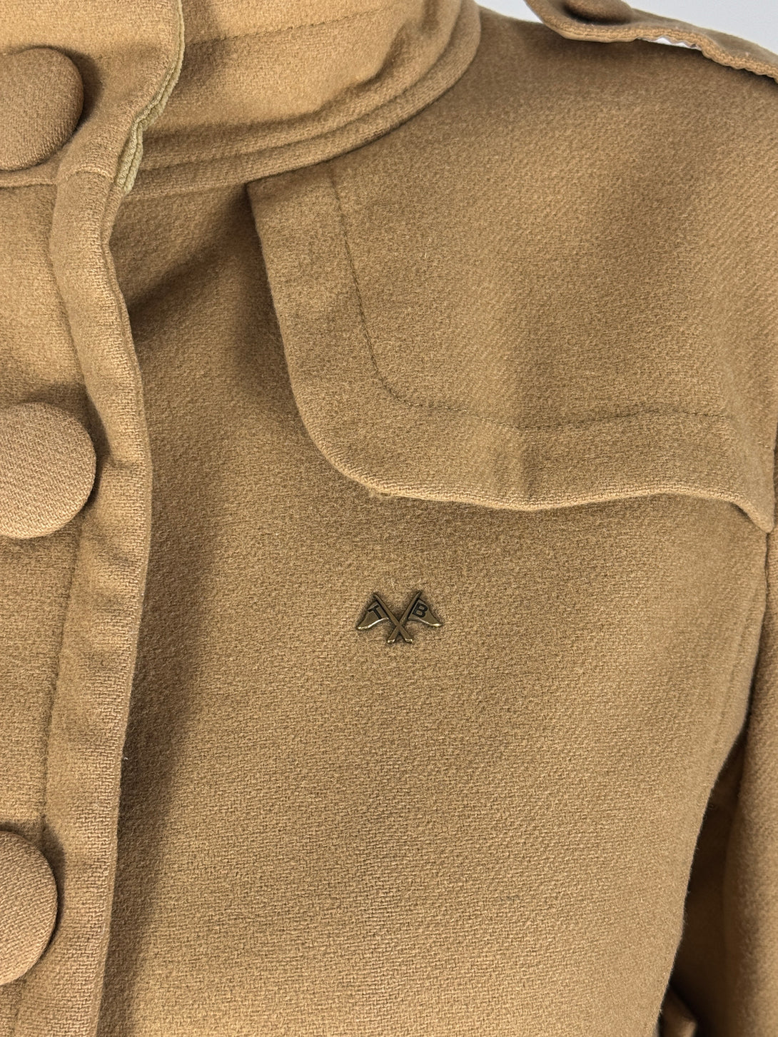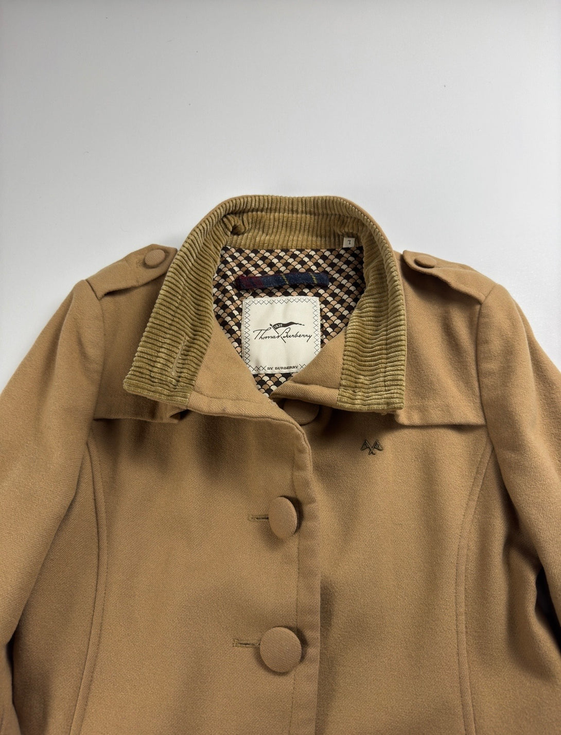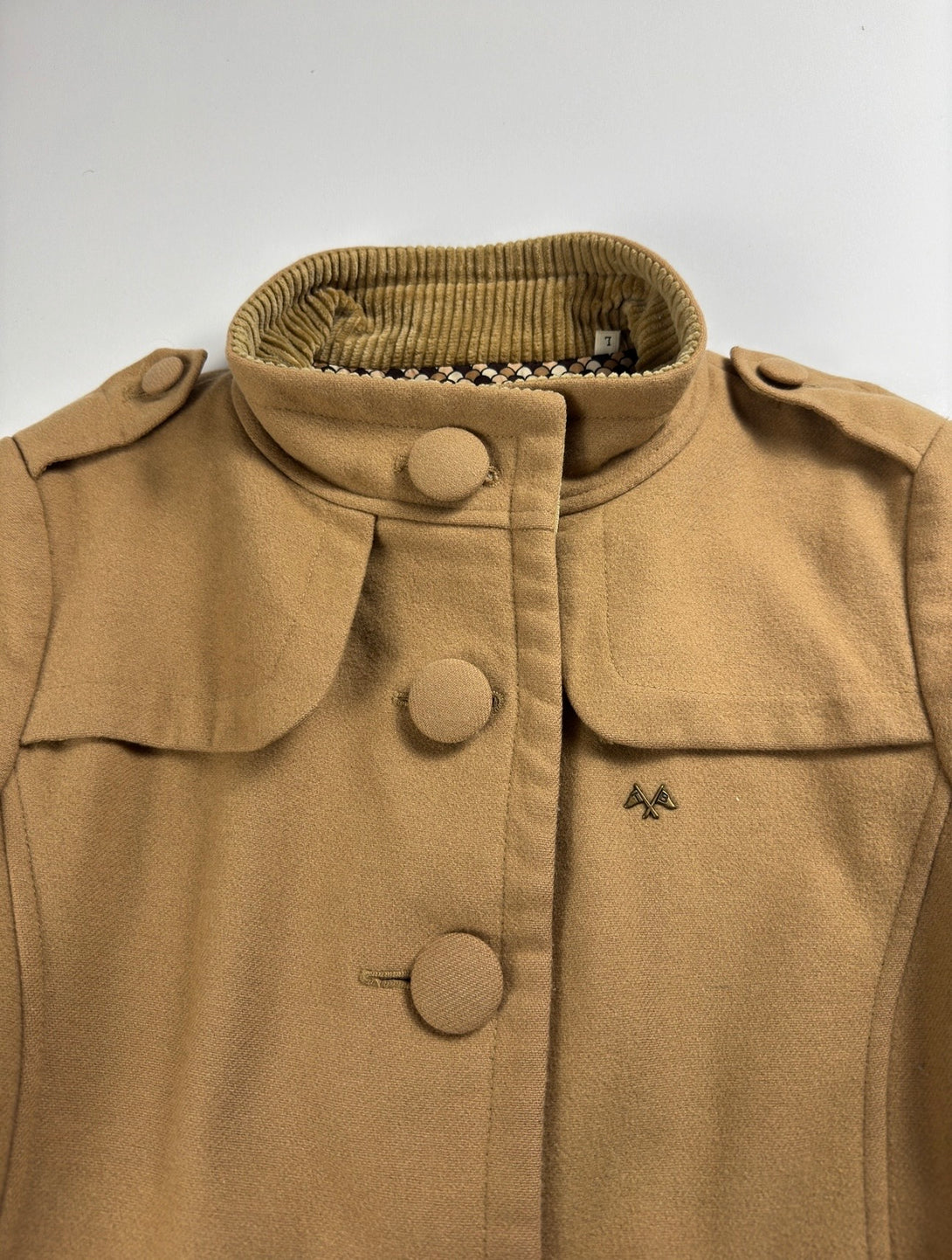 - Design: Paltonul are un guler înalt (de tip pâlnie) cu nasturi, nasturi frontali pe o singură linie, epoleți decorativi pe umeri și un logo brodat subtil (cavalerul ecvestru Burberry) pe piept.