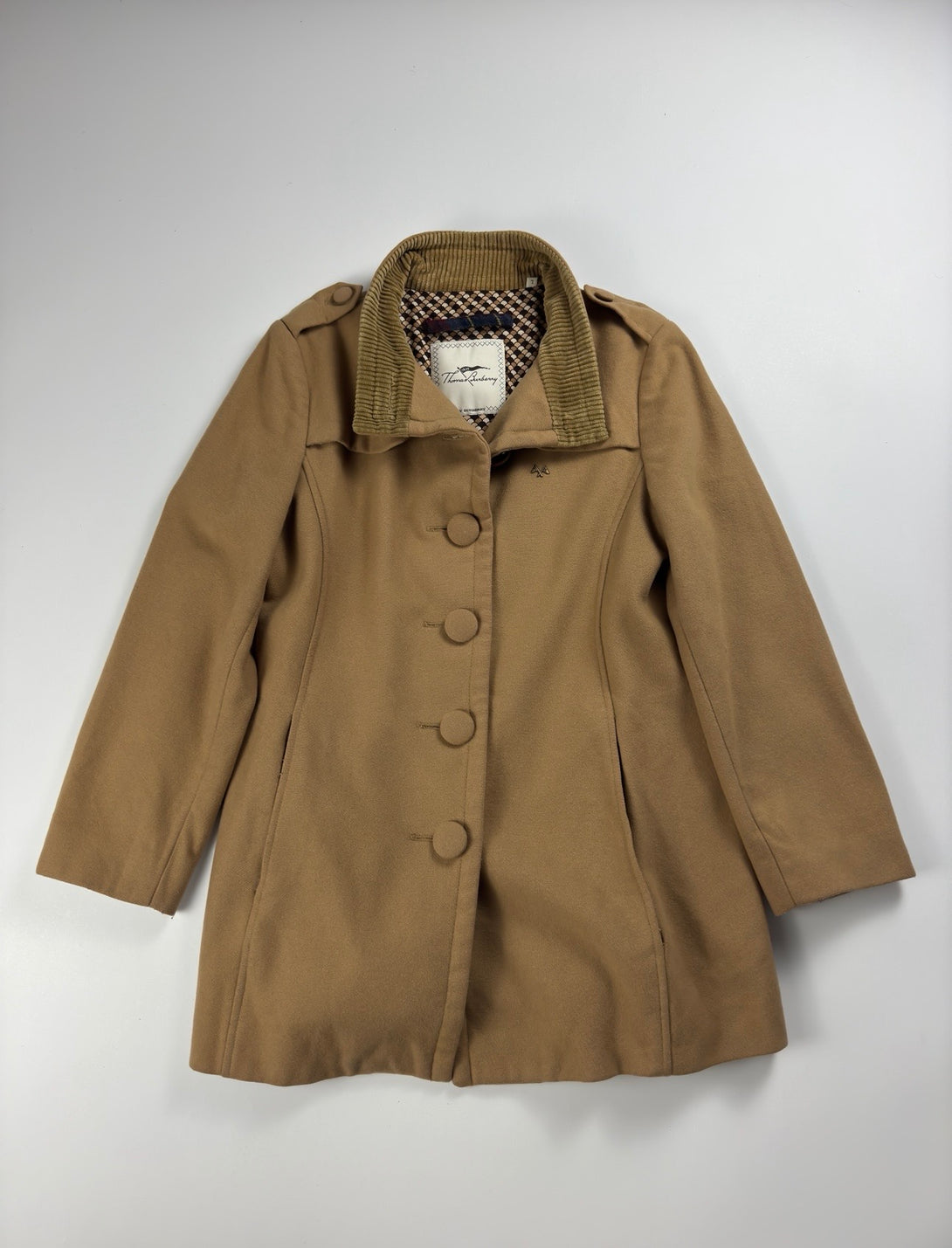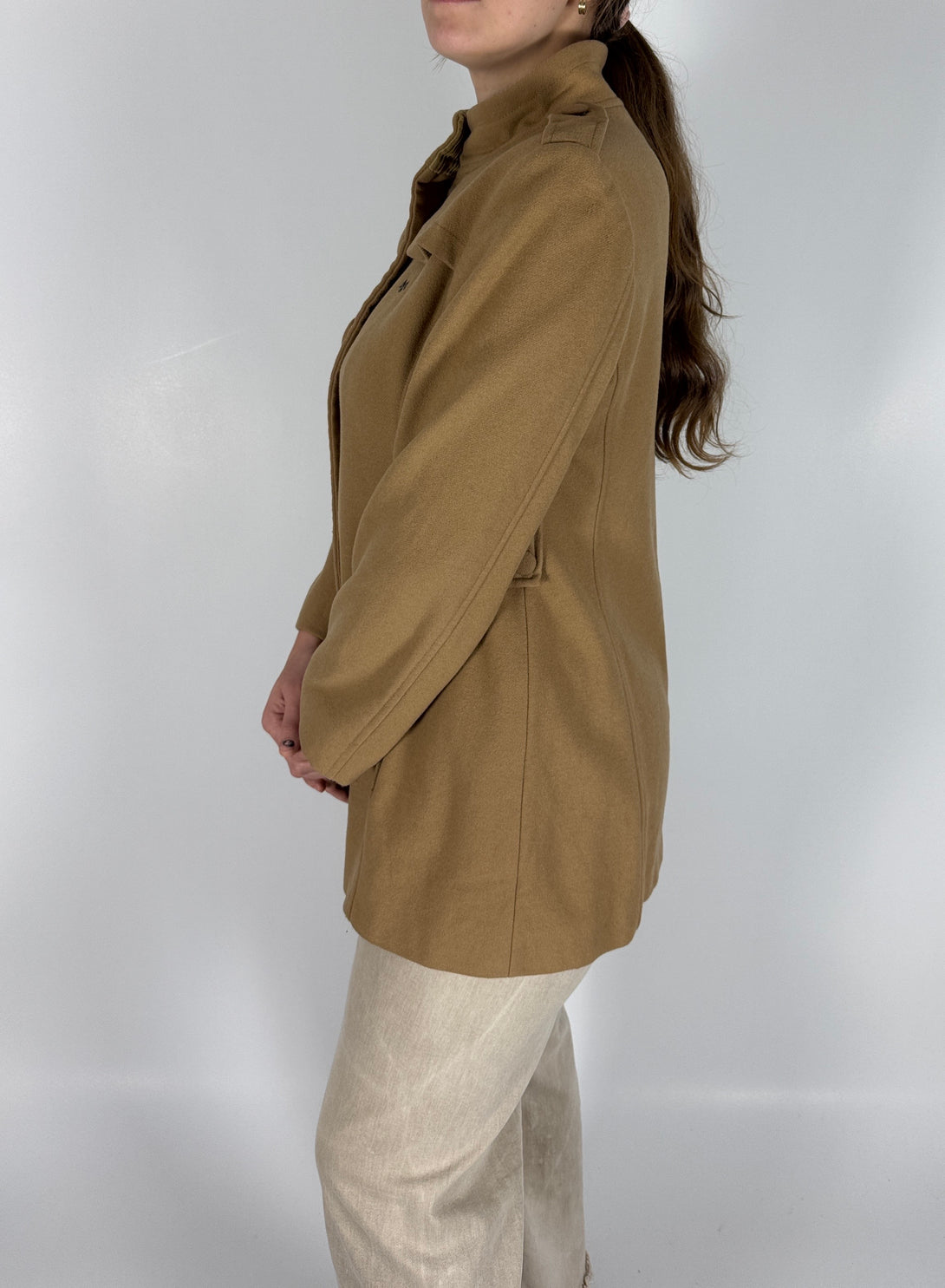 PAlton vintage Thomas Burberry pentru femei, confecționat dintr-un amestec de lână și cașmir, în culoarea camel. Materialul exterior conține lână și poliamidă (85% lână, 20% poliamidă, iar căptușeala este 100% viscoză.