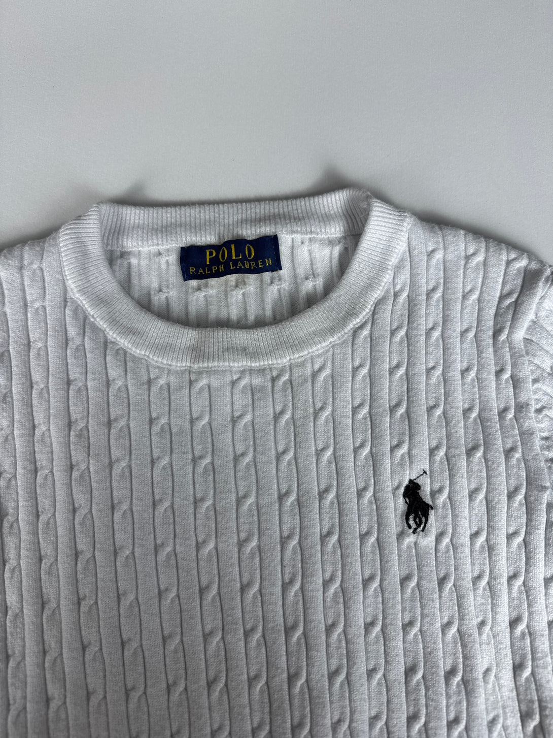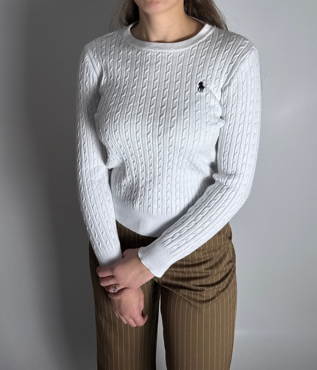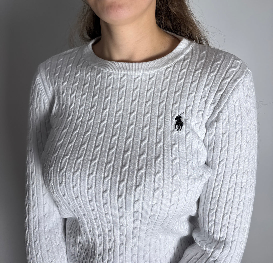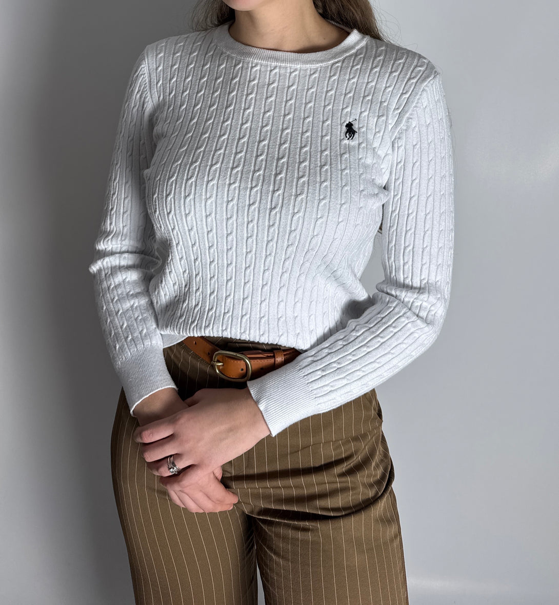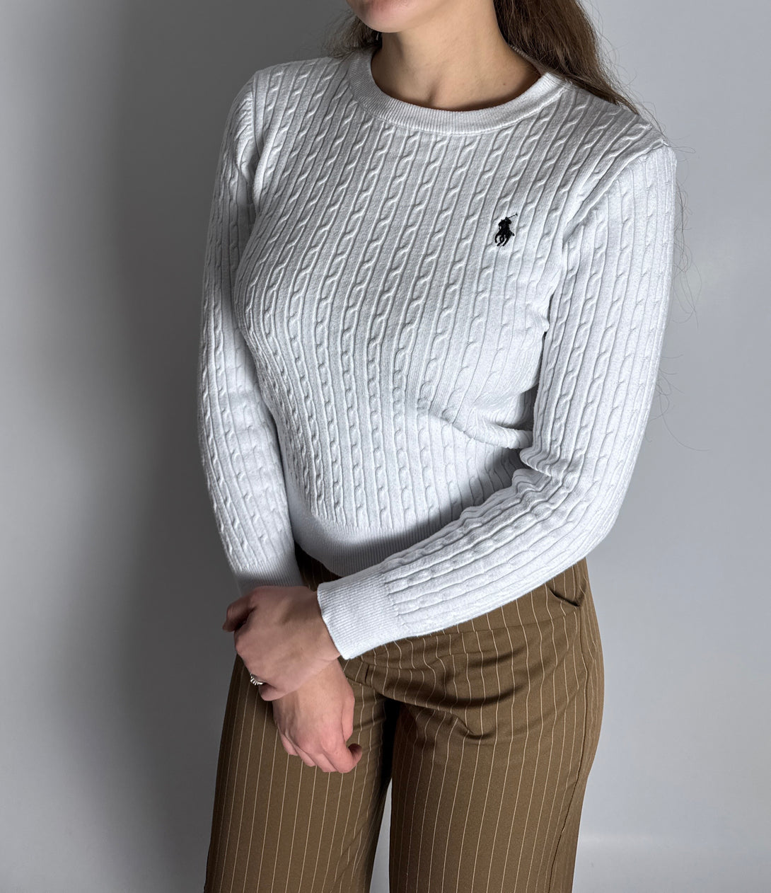 - Design: Tricotat în model cu cablu (torsade), cu guler rotund și manșete/tivuri elastice