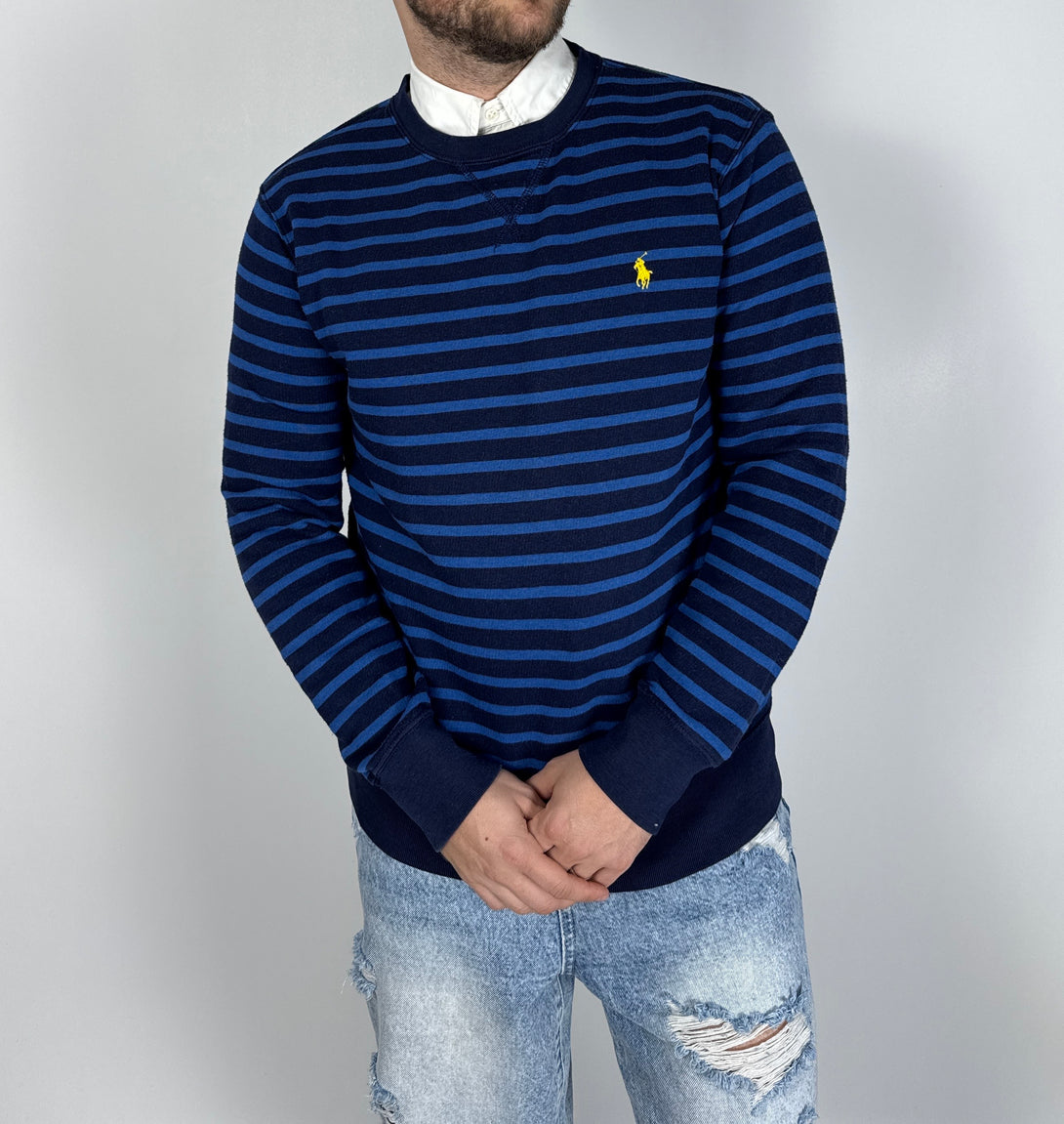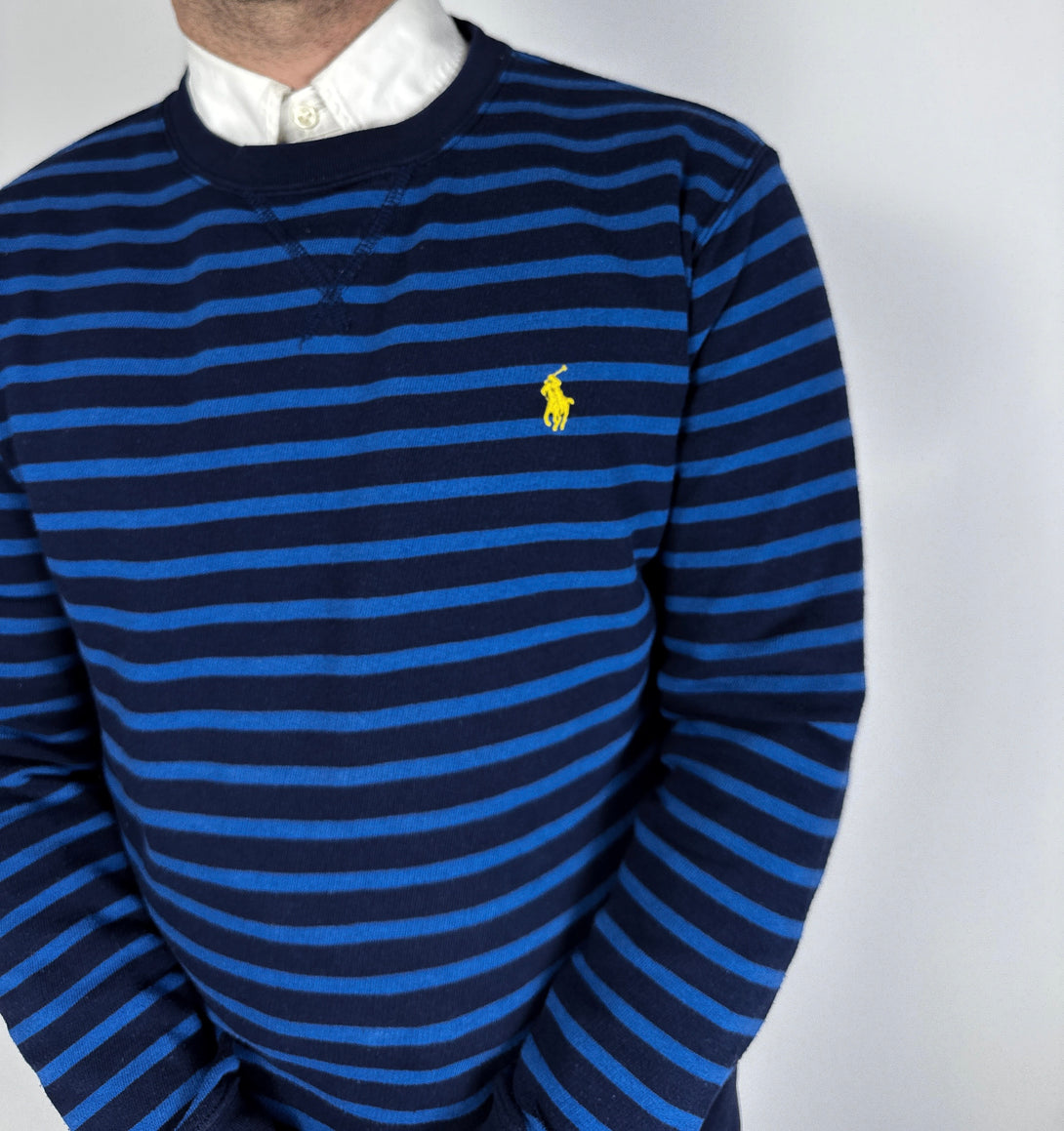- Croială: Guler rotund (crew neck) și manșete/tivuri elastice, striate