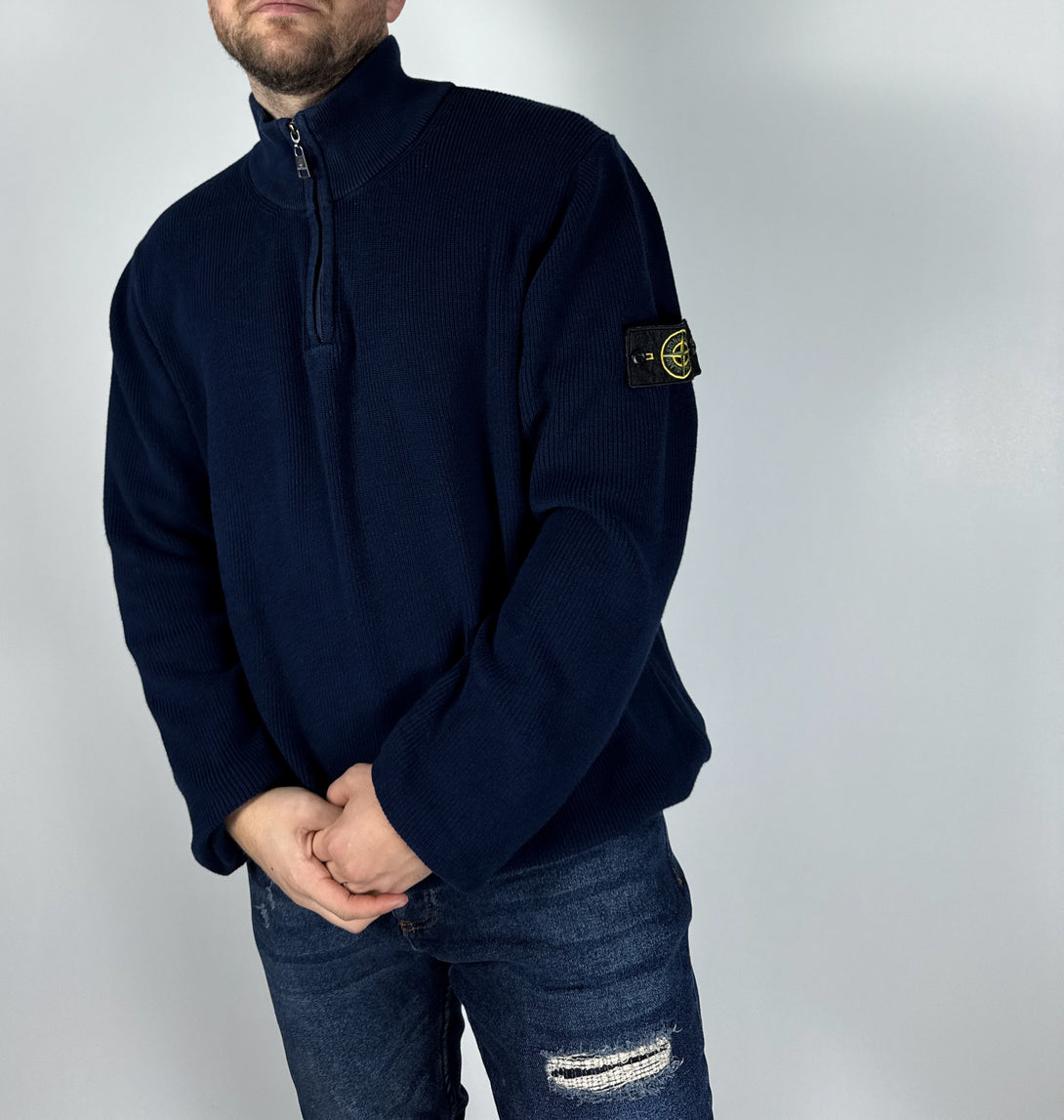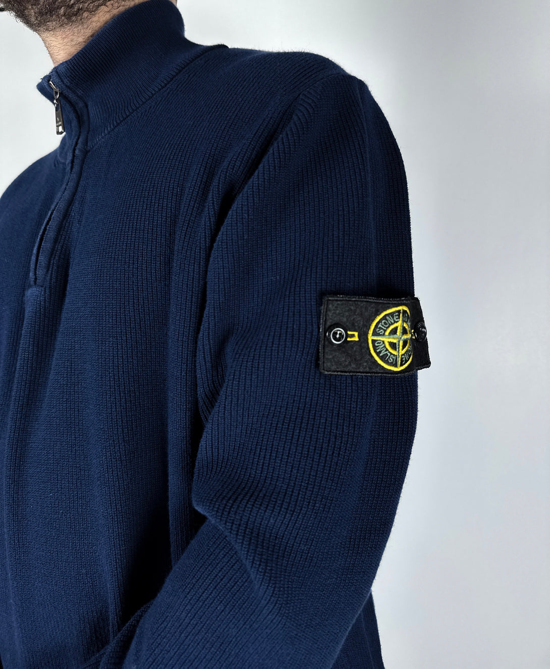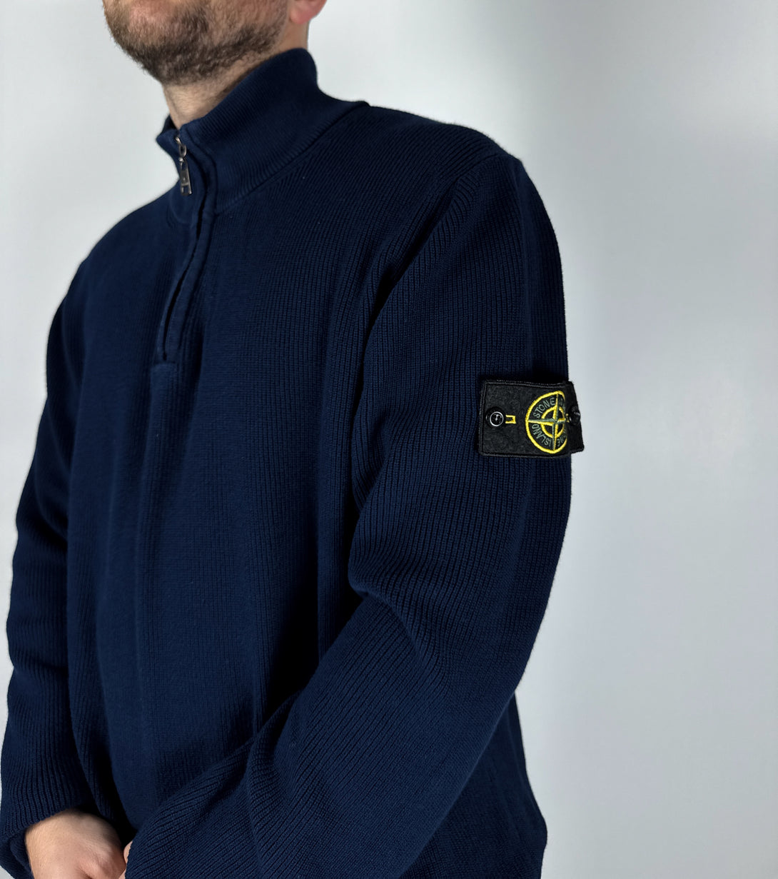 - Caracteristici: Design cu nervuri (ribbed knit), închidere cu jumătate de fermoar (half-zip/quarter-zip), guler ridicat și patch cu logo detașabil pe mânecă.