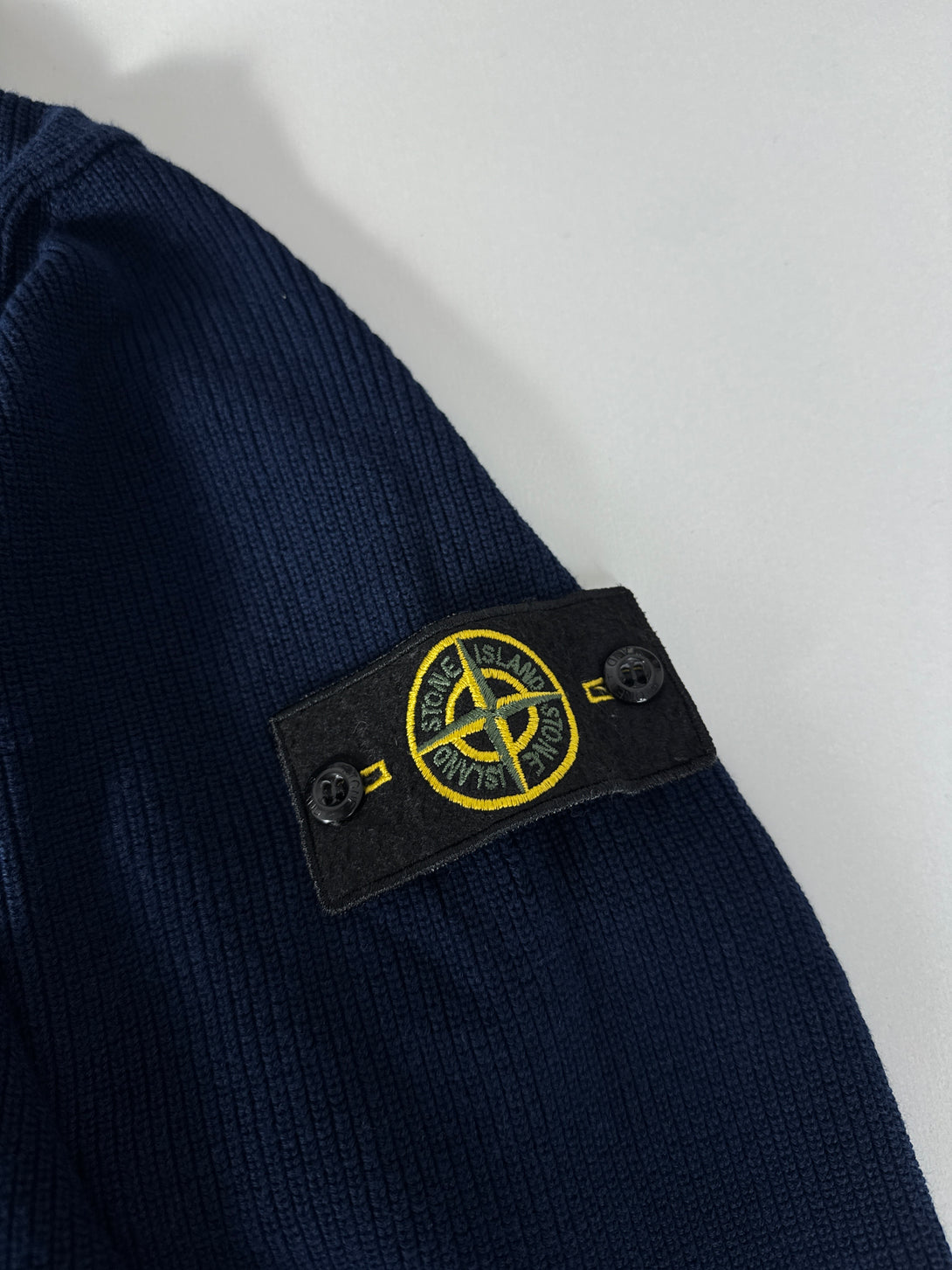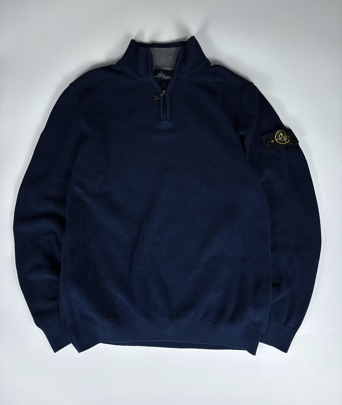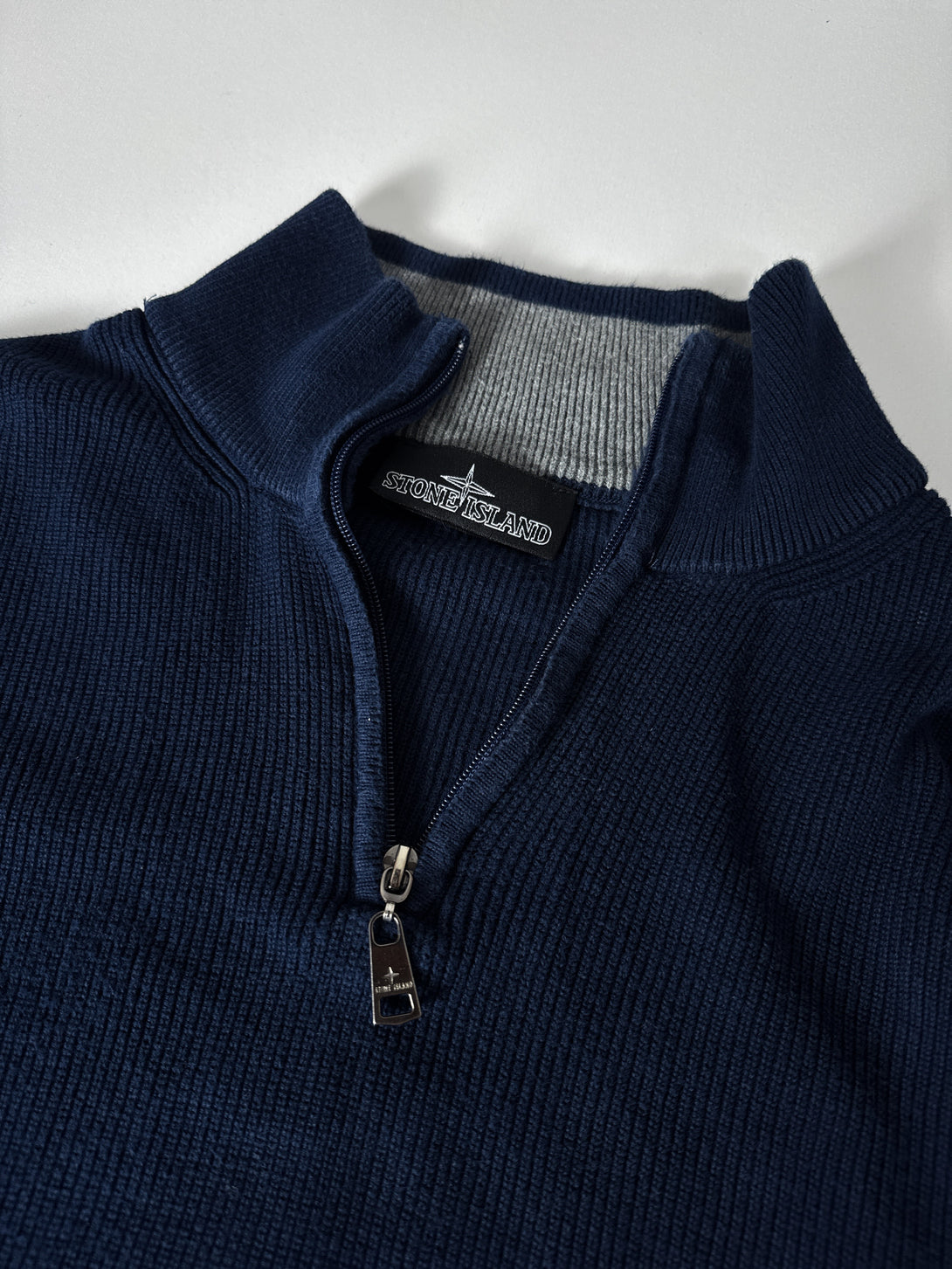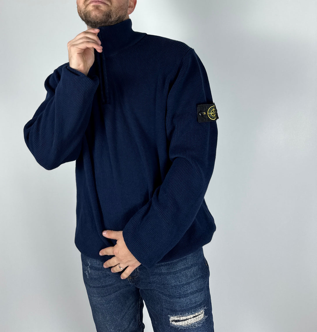 - Caracteristici: Design cu nervuri (ribbed knit), închidere cu jumătate de fermoar (half-zip/quarter-zip), guler ridicat și patch cu logo detașabil pe mânecă.