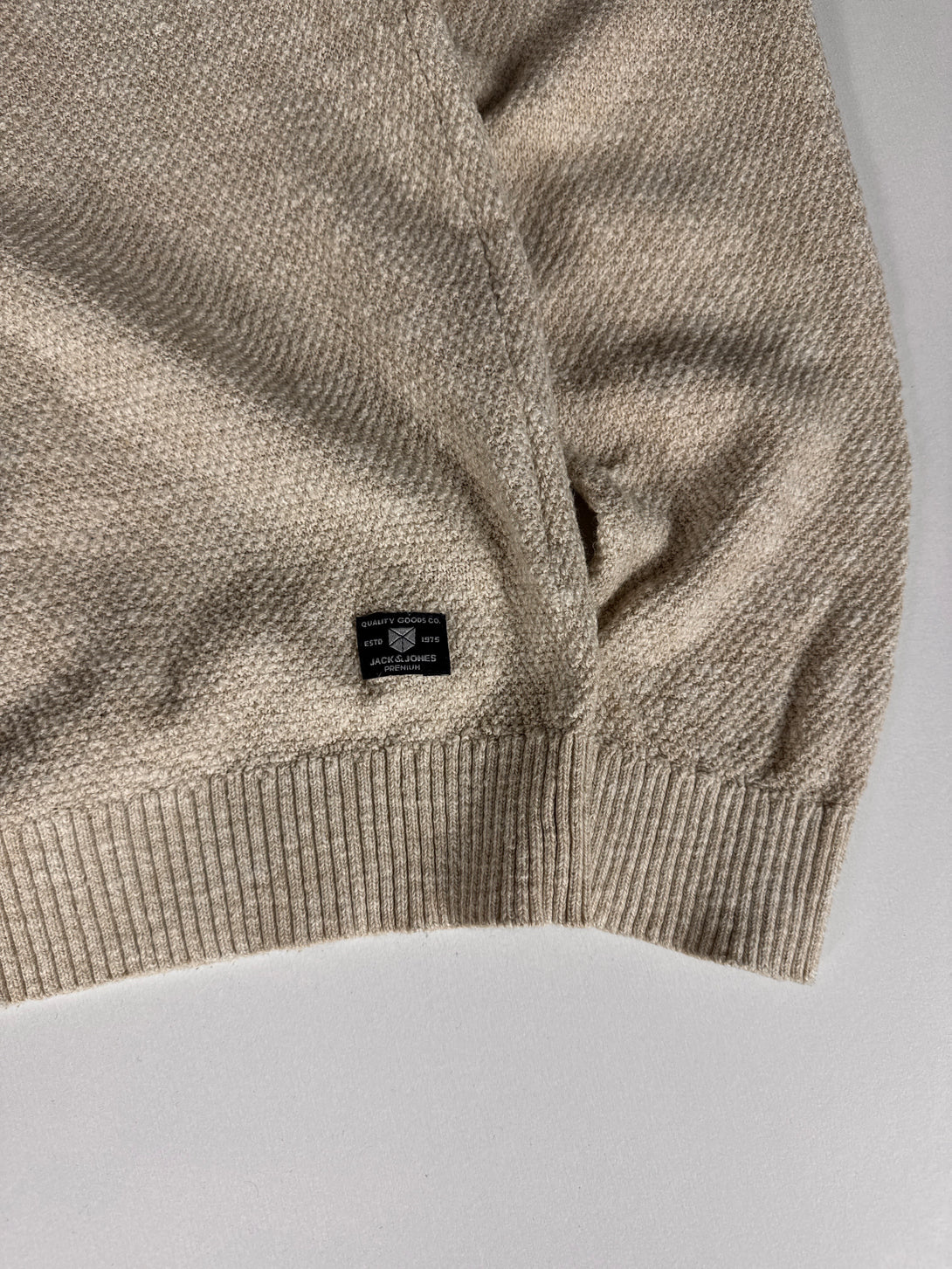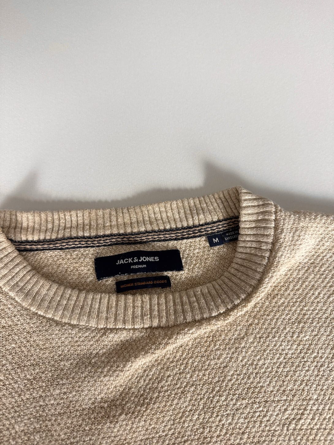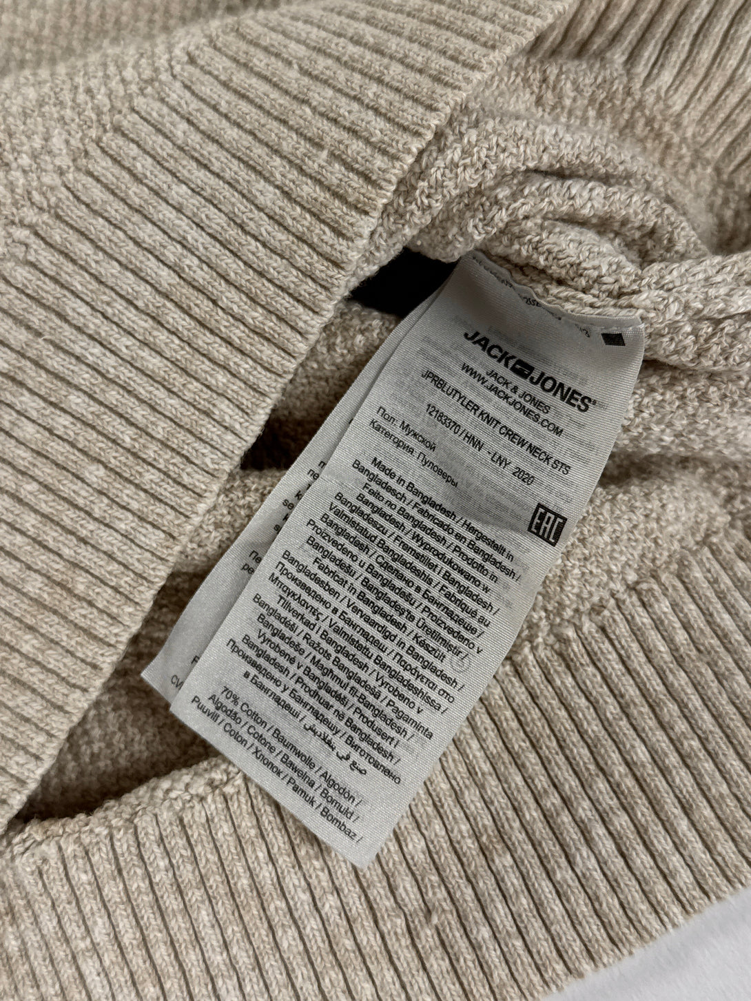 - Stil: Pulover tricotat, texturat, cu guler rotund (crew neck) și mâneci lungi.